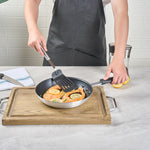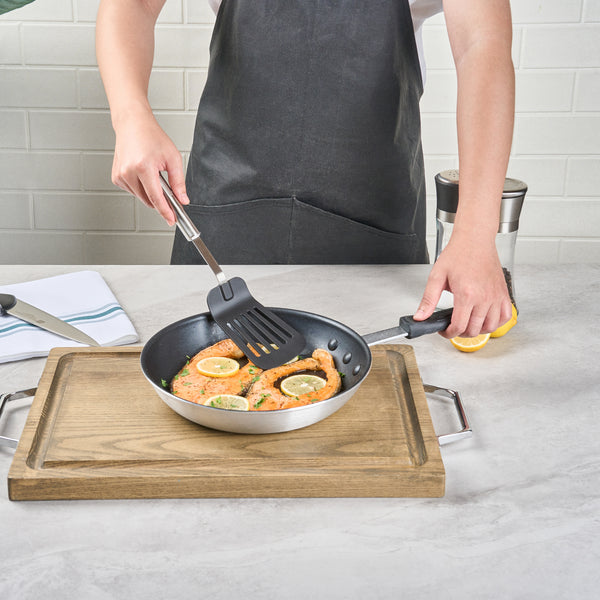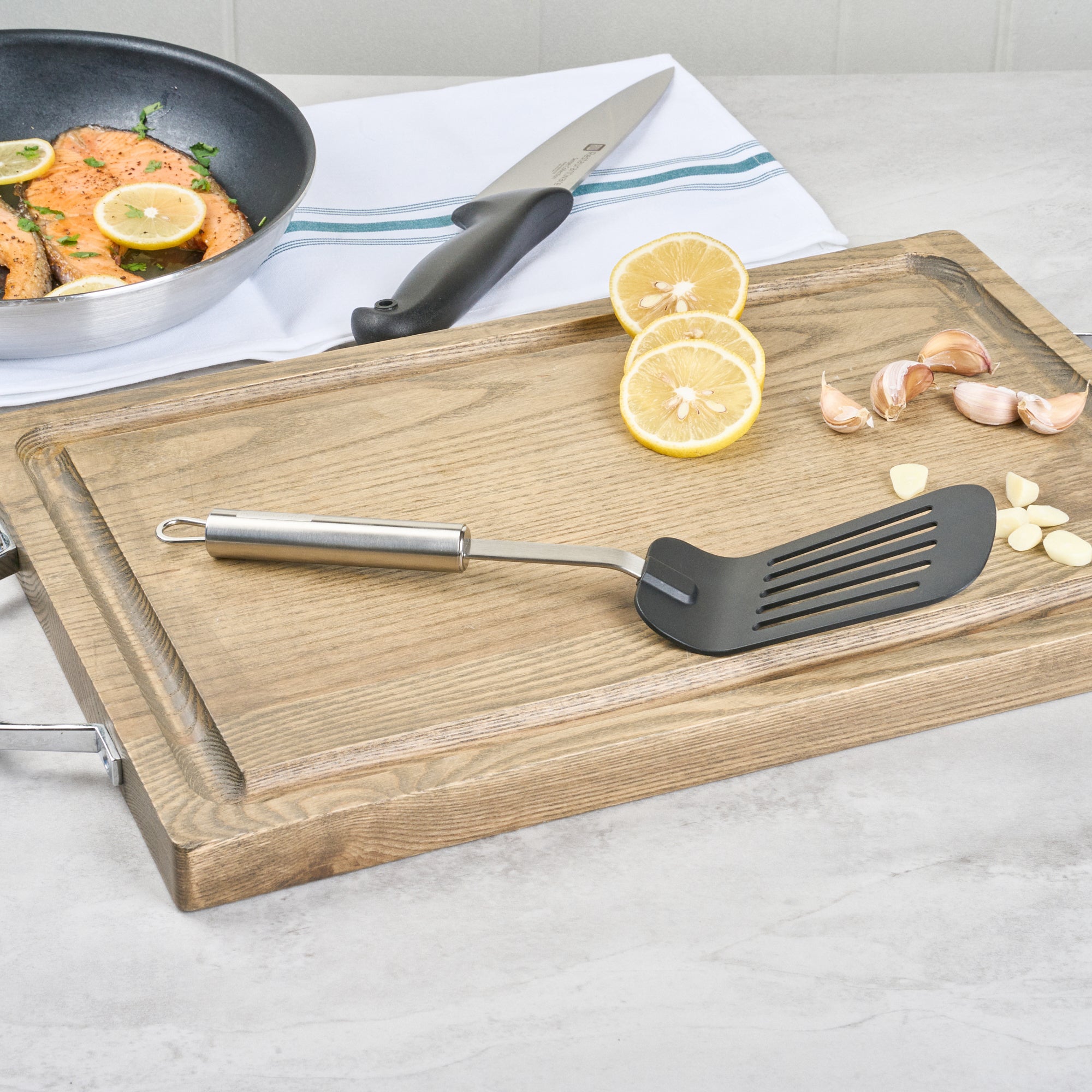 Enhance kitchen efficiency with high-heat resistant utensils. The German Standard Heat-Resistant Slotted Turner – Black, Stainless Steel, Ergonomic Grip – 12.4 inches is crafted from high-heat resistant nylon, ensuring durability and safety in handling hot foods without melting or warping. Its slotted design efficiently drains excess oils and liquids, making it an ideal nylon spatula for flipping and serving fried or sautéed foods. The stainless steel handle provides a sturdy grip, enhancing control and longevity, perfect for rigorous kitchen use and a reliable fish spatula. Its dishwasher-safe nature ensures efficient cleaning routines. Elevate your culinary operations with this versatile slotted turner. Each order includes 6 German Standard Heat-Resistant Slotted Turners.