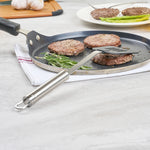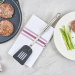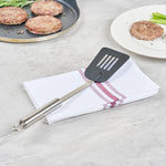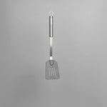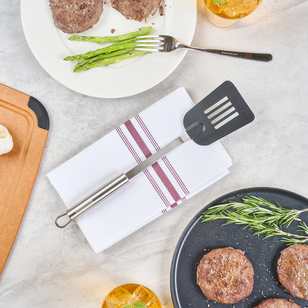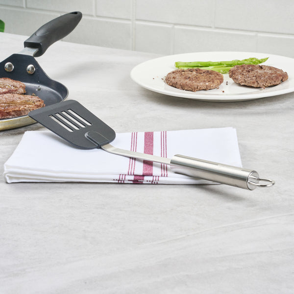 Effortlessly handle hot foods with the German Standard Heat-Resistant Slotted Spatula. This nylon spatula features a slotted design that effectively drains excess oil or liquid, ensuring healthier meals and promoting efficient kitchen operations. The ergonomic stainless steel handle provides a comfortable grip and enhances control, minimizing hand fatigue during long shifts. With its heat-resistant construction, this fish turner is ideal for flipping delicate fillets without the risk of melting or deformation. Its greaseproof surface reduces cleaning frequency, while its dishwasher-safe nature allows for quick and efficient cleanup, maintaining hygiene standards. Measuring 12.7 inches in length and 2.7 inches in width, this versatile kitchen tool is perfect for flipping, turning, and serving a variety of dishes. Streamline your foodservice tasks and improve operational efficiency with this essential cooking utensil. Each order includes 1 German Standard Heat-Resistant Slotted Spatula.