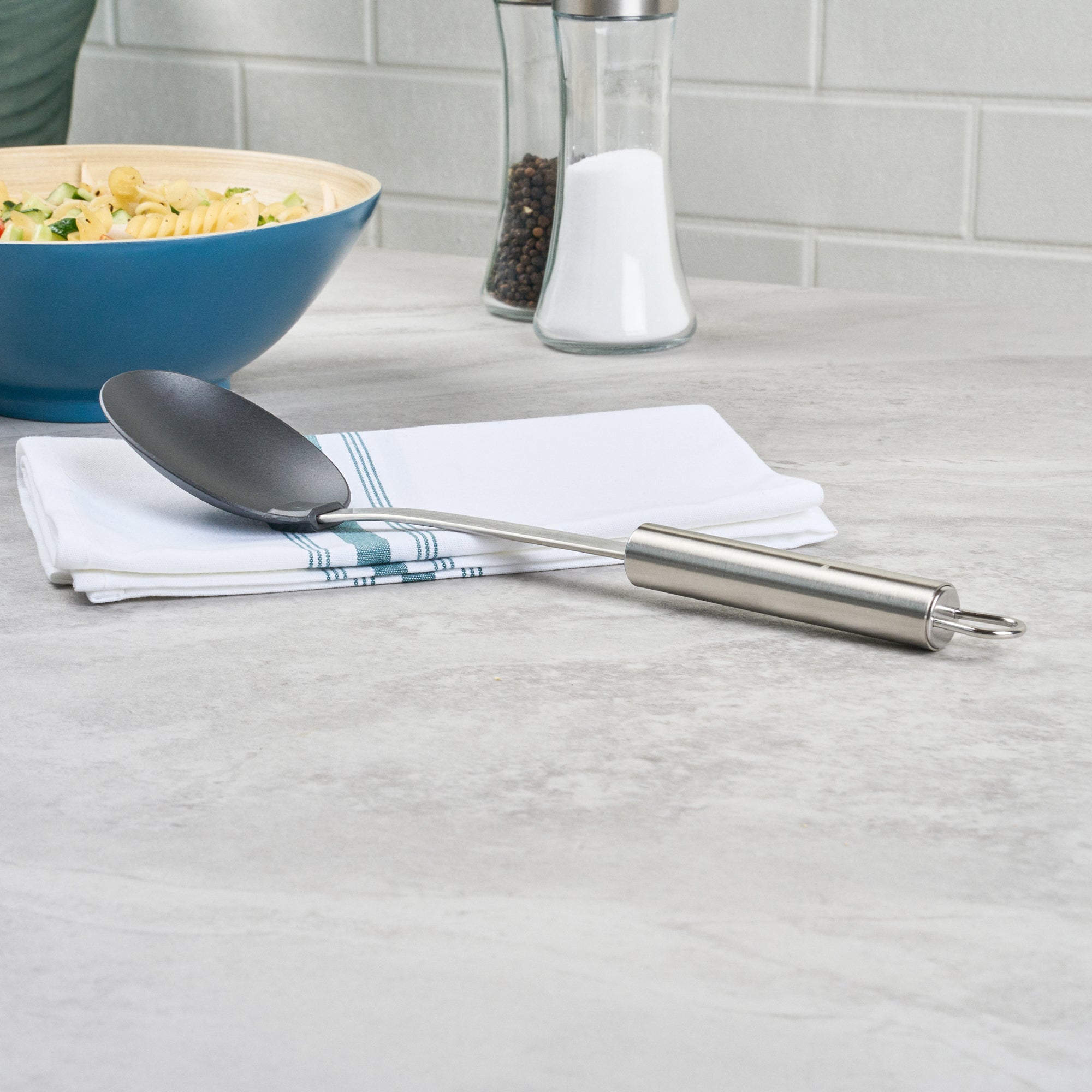 Ensure precision and comfort in every dish with the German Standard Ergonomic Stainless Steel Serving Spoon. This stainless steel serving spoon features a robust stainless steel handle that offers an ergonomic grip, enhancing control during food preparation. Crafted from heat-resistant nylon, this cooking ladle withstands high temperatures, ensuring durability and reliability in busy kitchen environments. Its unique built-in eyelet hook guarantees easy storage, keeping kitchens organized and efficient. Measuring 12.5 inches in length, this heat-resistant spoon is perfect for handling both hot and cold foods, and is dishwasher safe for effortless cleaning. Elevate your kitchen's efficiency and maintain a tidy workspace with this essential utensil, ensuring your culinary creations are served with ease. Each order includes 1 German Standard Ergonomic Stainless Steel Serving Spoon.