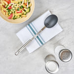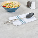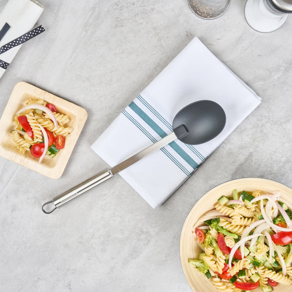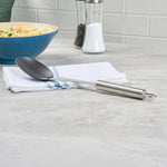 Ensure precision and comfort in every dish with the German Standard Ergonomic Stainless Steel Serving Spoon. This stainless steel serving spoon features a robust stainless steel handle that offers an ergonomic grip, enhancing control during food preparation. Crafted from heat-resistant nylon, this cooking ladle withstands high temperatures, ensuring durability and reliability in busy kitchen environments. Its unique built-in eyelet hook guarantees easy storage, keeping kitchens organized and efficient. Measuring 12.5 inches in length, this heat-resistant spoon is perfect for handling both hot and cold foods, and is dishwasher safe for effortless cleaning. Elevate your kitchen's efficiency and maintain a tidy workspace with this essential utensil, ensuring your culinary creations are served with ease. Each order includes 1 German Standard Ergonomic Stainless Steel Serving Spoon.