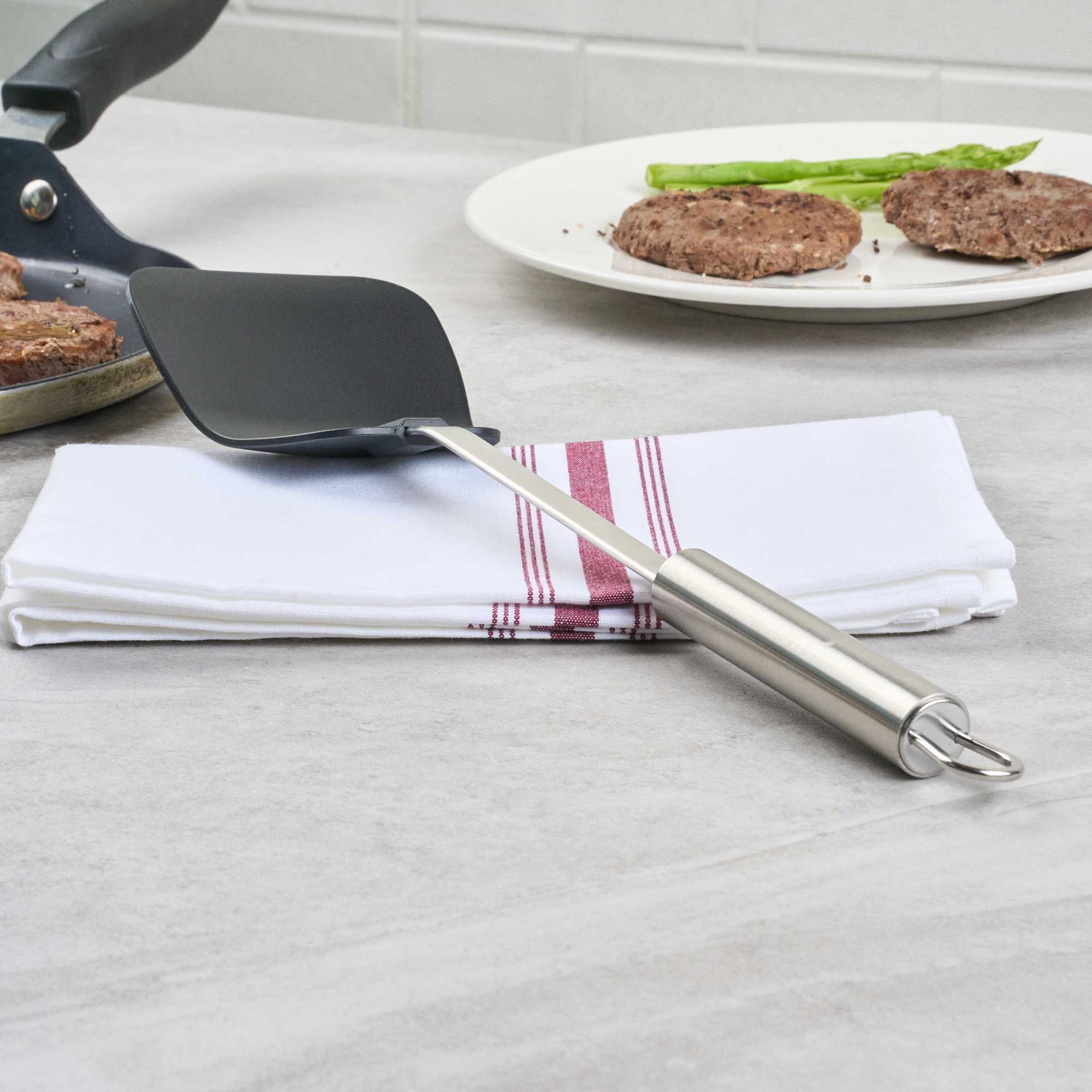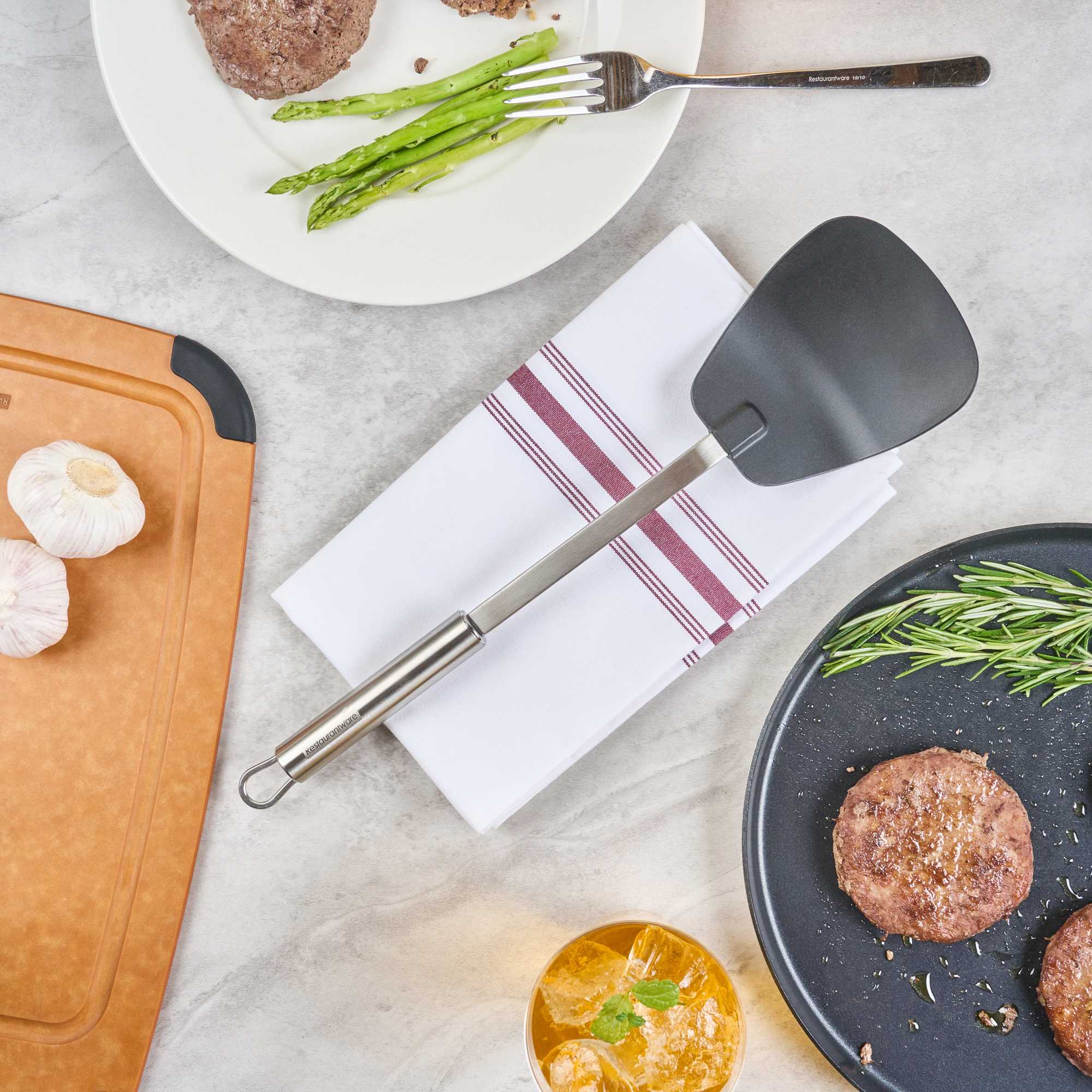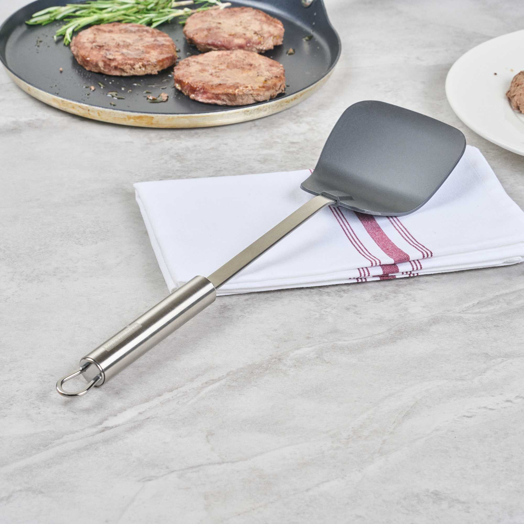 Enhance your kitchen operations with our versatile wok spatula. The German Standard Heat-Resistant Stainless Steel Wok Spatula – Ergonomic Grip, Black – 14.1 inches by 3.7 inches by 1.1 inches ensures safe and efficient cooking with its heat-resistant nylon head that withstands up to 446F, ideal for stir-frying in high-temperature conditions. Its stainless steel handle offers an ergonomic grip that enhances control and comfort, reducing hand fatigue during extended use. The long 14.1-inch length allows you to reach deep into large pots and pans, making it an essential tool for any commercial kitchen engaged in Asian cooking. Dishwasher safe, this spatula simplifies cleaning, improving kitchen efficiency. With a built-in eyelet hook for easy storage, it helps maintain an organized kitchen environment. Elevate your cooking techniques with this essential heat resistant spatula. Each order includes 36 German Standard Heat-Resistant Stainless Steel Wok Spatulas.