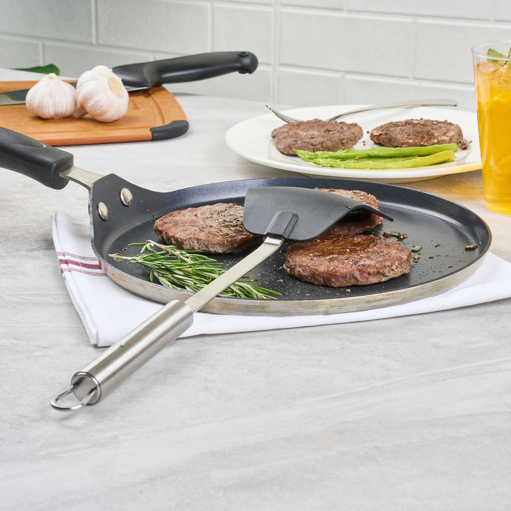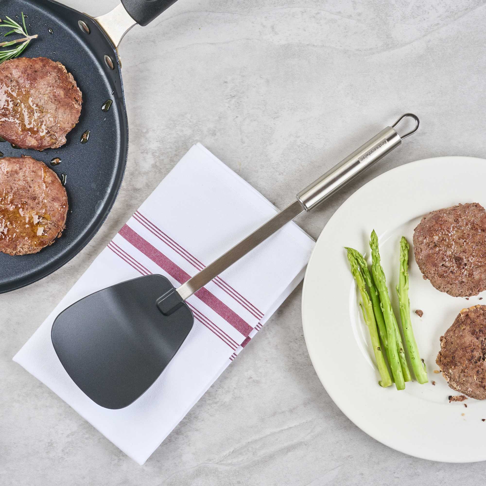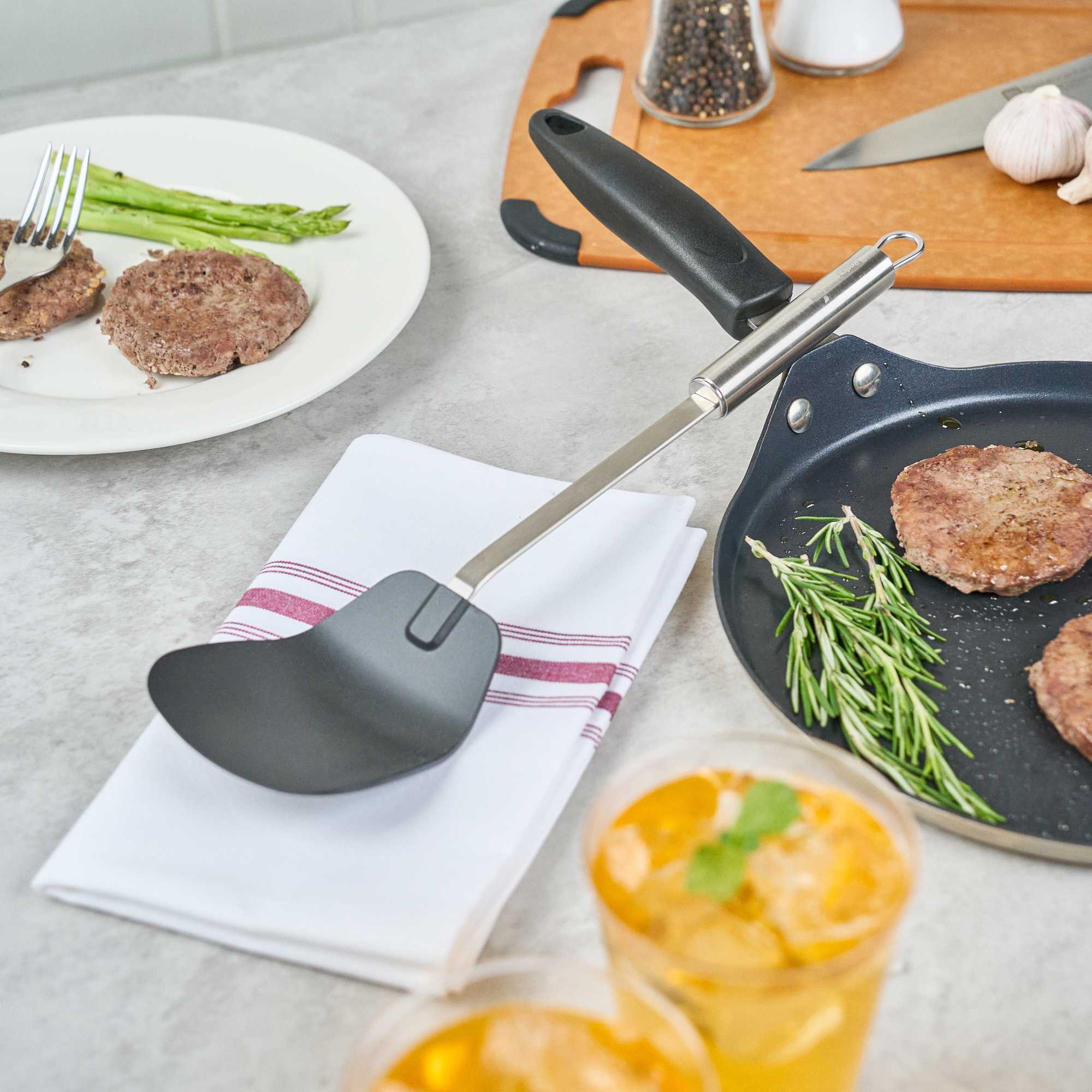 Enhance your kitchen operations with our versatile wok spatula. The German Standard Heat-Resistant Stainless Steel Wok Spatula – Ergonomic Grip, Black – 14.1 inches by 3.7 inches by 1.1 inches ensures safe and efficient cooking with its heat-resistant nylon head that withstands up to 446F, ideal for stir-frying in high-temperature conditions. Its stainless steel handle offers an ergonomic grip that enhances control and comfort, reducing hand fatigue during extended use. The long 14.1-inch length allows you to reach deep into large pots and pans, making it an essential tool for any commercial kitchen engaged in Asian cooking. Dishwasher safe, this spatula simplifies cleaning, improving kitchen efficiency. With a built-in eyelet hook for easy storage, it helps maintain an organized kitchen environment. Elevate your cooking techniques with this essential heat resistant spatula. Each order includes 36 German Standard Heat-Resistant Stainless Steel Wok Spatulas.