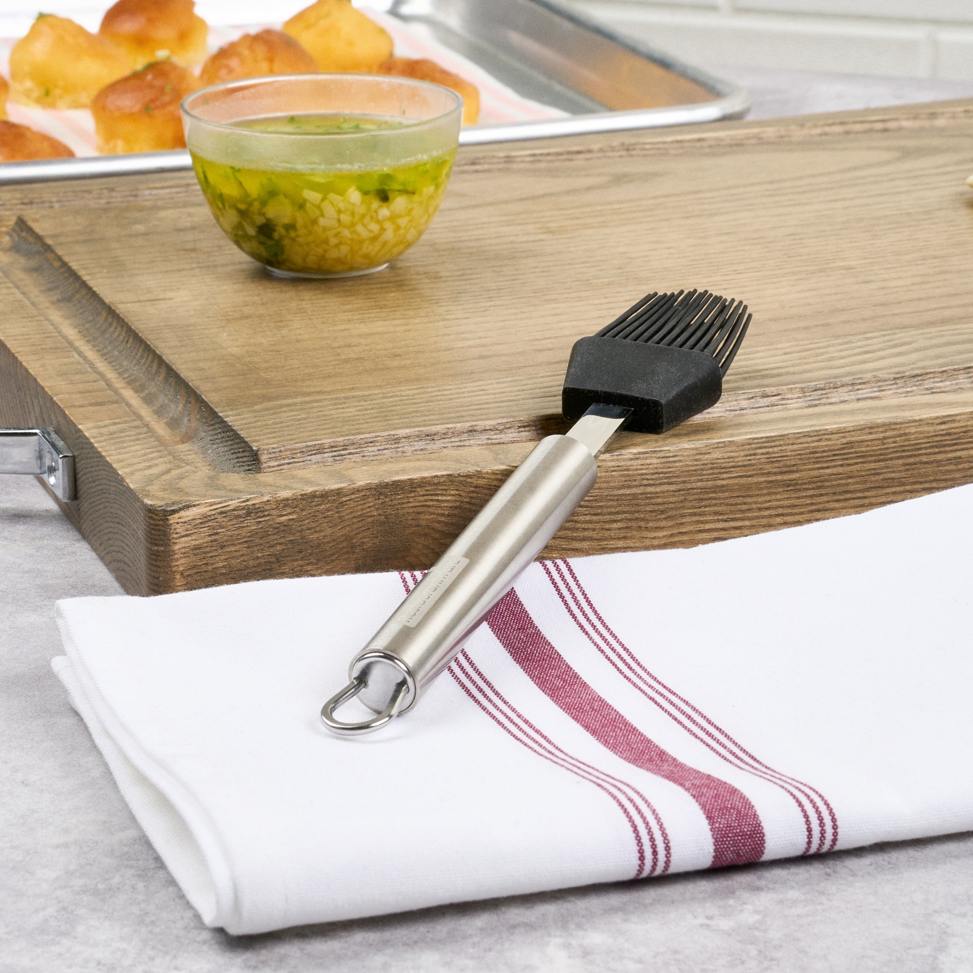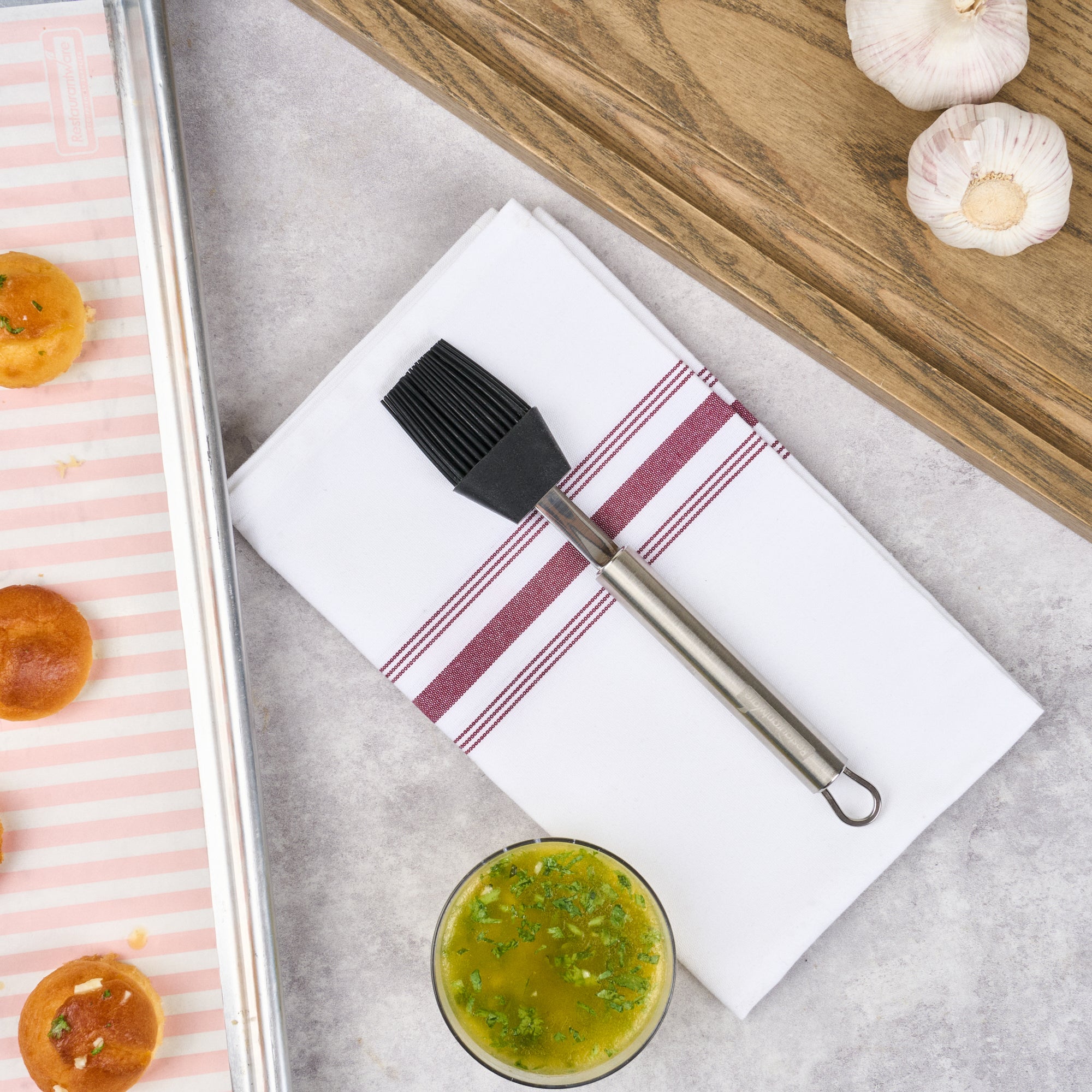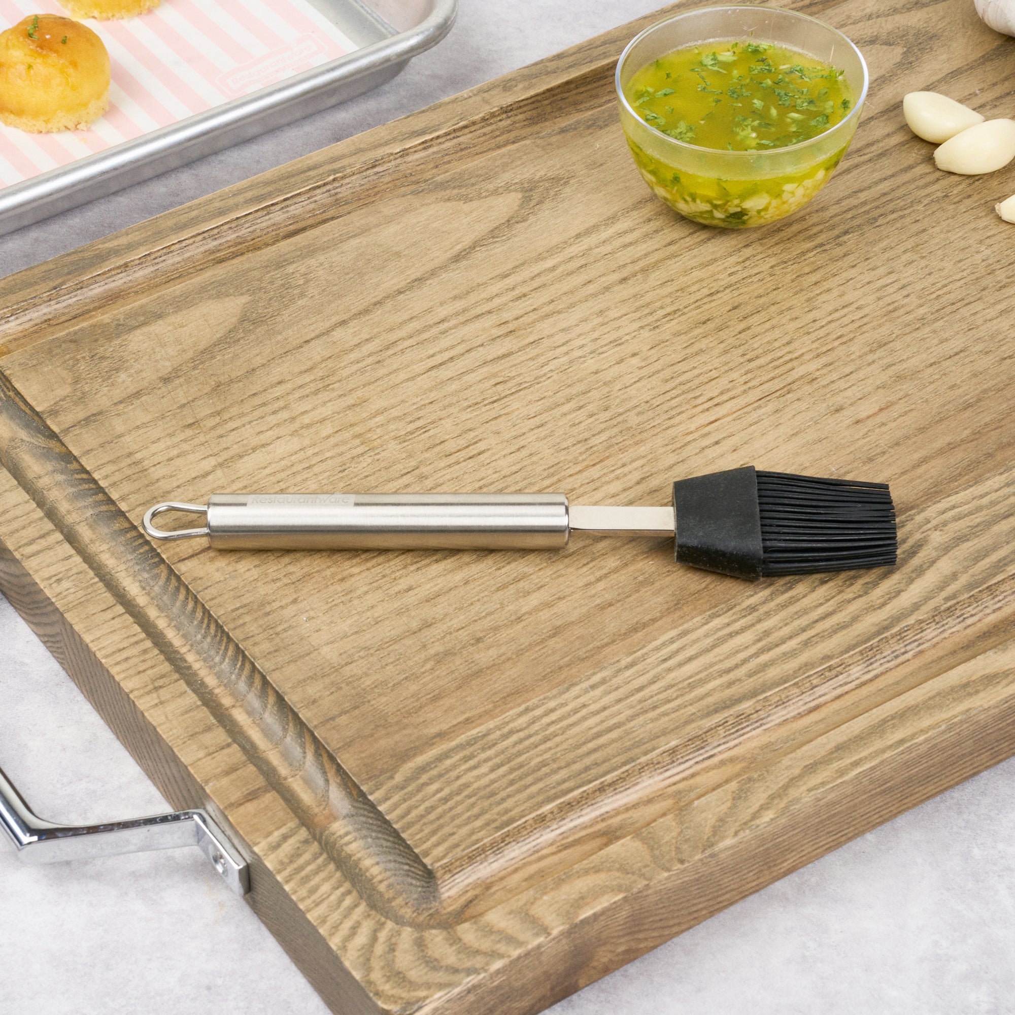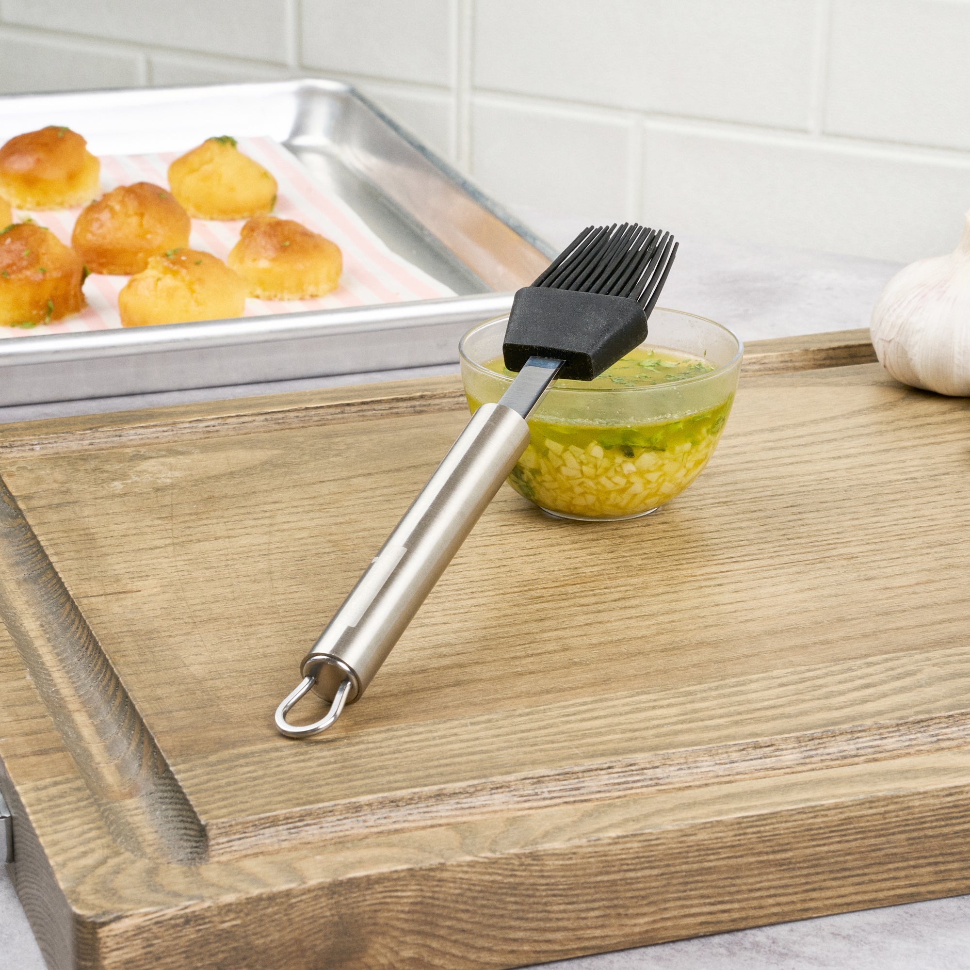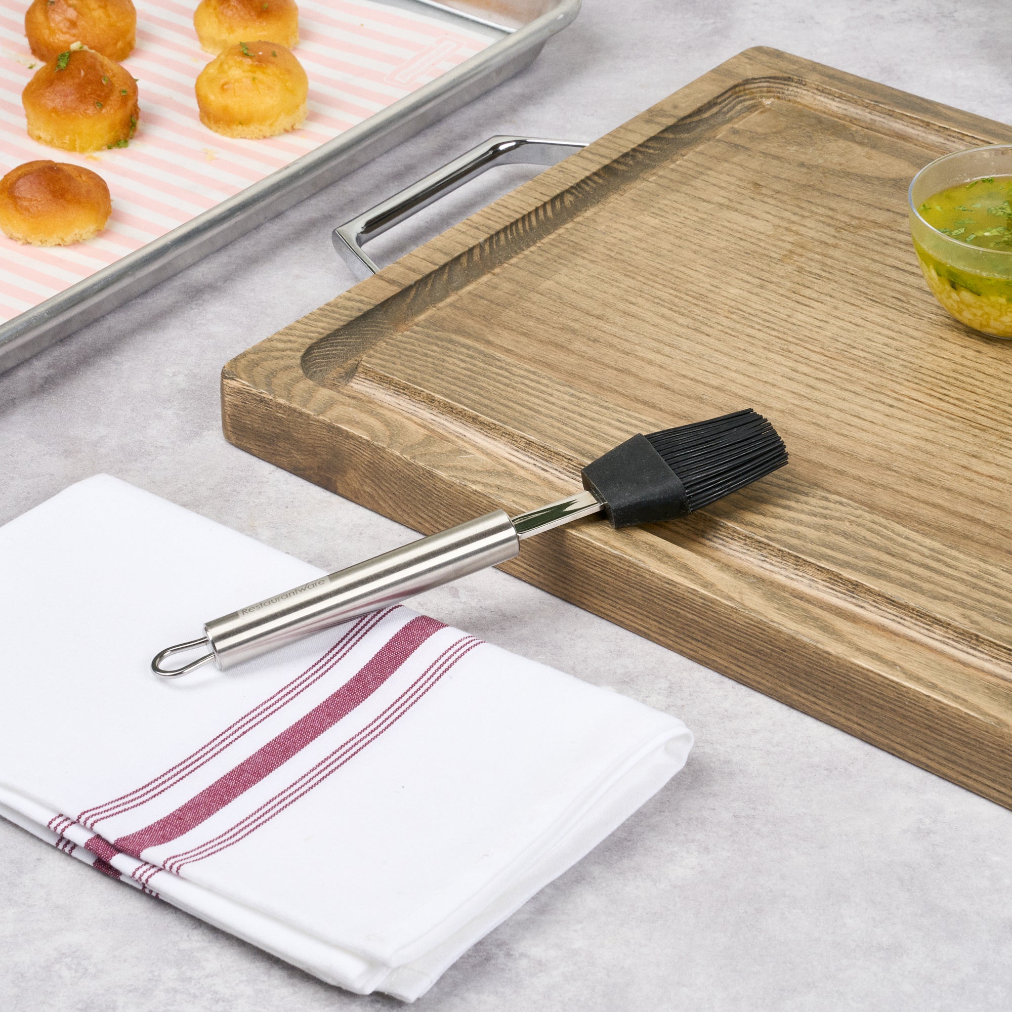 Ensure precision and ease in your kitchen with our German Standard Silicone Pastry Brush. Designed with durable silicone bristles, this tool delivers worry-free baking and grilling by evenly applying glazes and sauces without shedding, maintaining food purity. The ergonomic stainless steel handle of this silicone basting brush provides a comfortable grip, enhancing control during extensive cooking sessions. With a built-in eyelet hook, it ensures easy storage, keeping kitchens organized and efficient. Its 7 3/4-inch length offers optimal reach and control, making it an ideal egg wash brush for bakeries and commercial kitchens. This silicone pastry brush is heat-resistant, allowing safe use on hot foods and cookware, while being dishwasher-safe for effortless cleaning. Enhance your culinary precision and efficiency with this must-have kitchen tool. Each order includes 24 German Standard Silicone Pastry Brush.