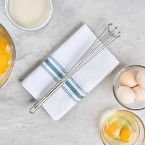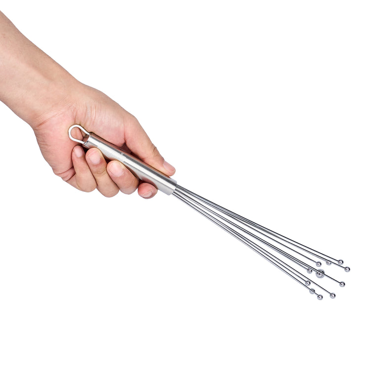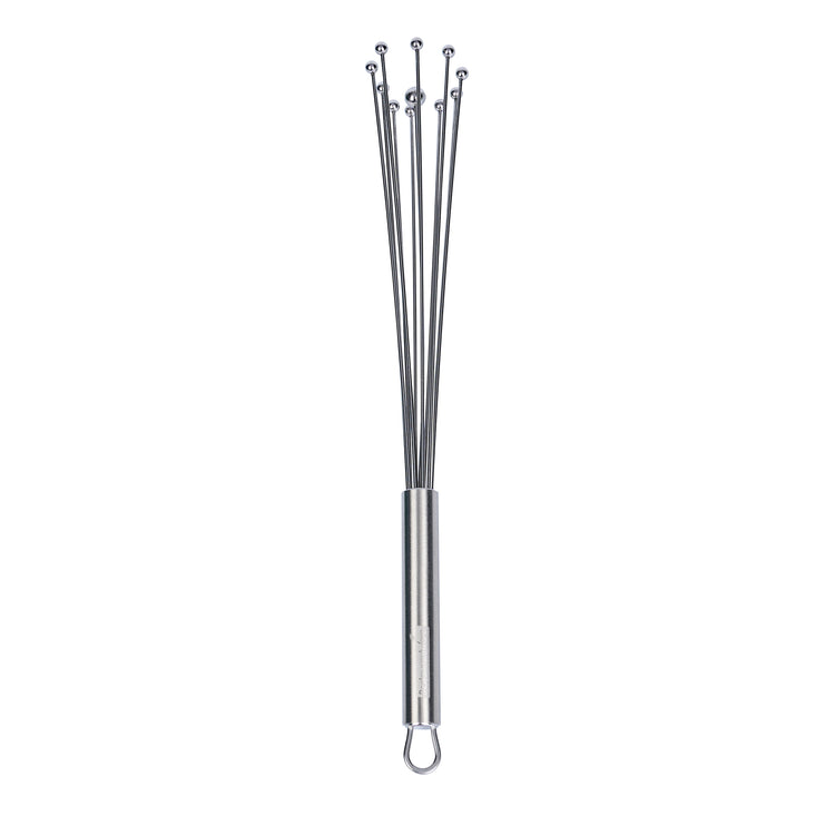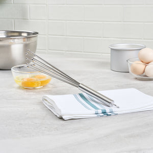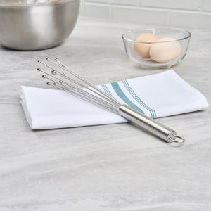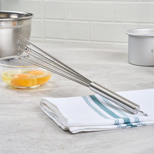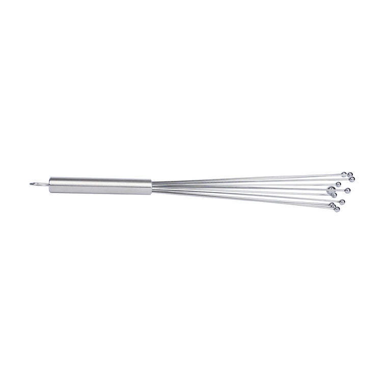 Whip up culinary masterpieces with ease and efficiency. The German Standard Stainless Steel Ball Whisk is designed with a 12.5-inch length, providing ample reach for mixing in deep bowls or pots, ensuring thorough blending in any bustling kitchen. This stainless steel whisk boasts a durable construction, offering resistance to corrosion and enduring frequent use in commercial environments. Its ball whisk design enhances aeration and efficient mixing, making it ideal as a whisk for whipping cream or emulsifying sauces to perfection. Featuring an ergonomically designed handle, it reduces hand fatigue, facilitating comfort during extended culinary tasks. The built-in eyelet hook aids in organized storage, keeping your kitchen tidy and accessible. Plus, this whisk is dishwasher-safe, allowing for easy cleaning and maintaining hygiene standards effortlessly. Elevate your food preparation with this reliable tool, perfect for professional chefs and foodservice operations. Each order includes 24 German Standard Stainless Steel Ball Whisks.