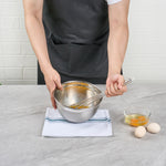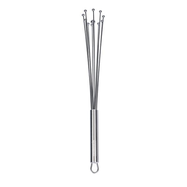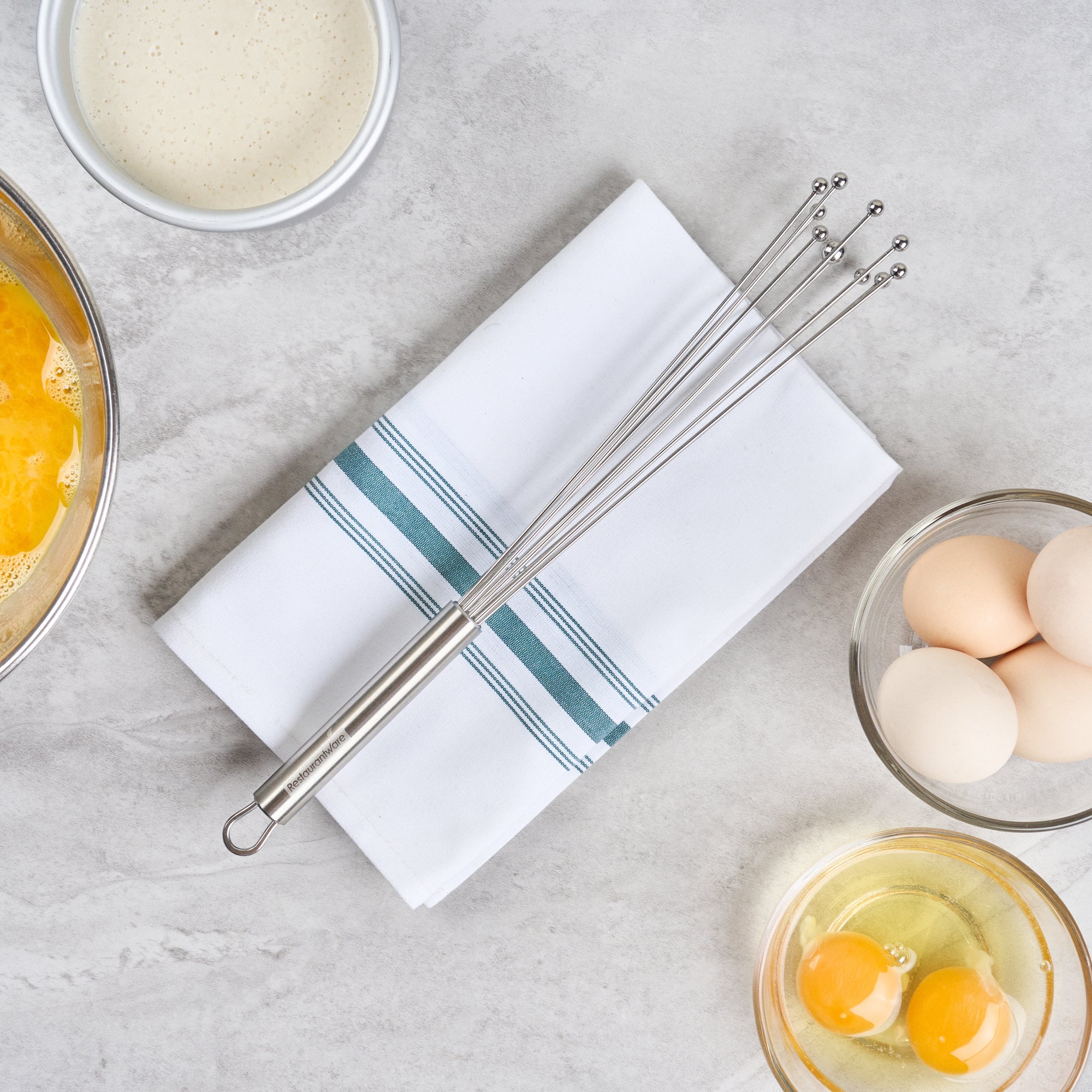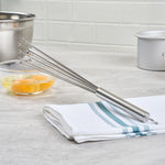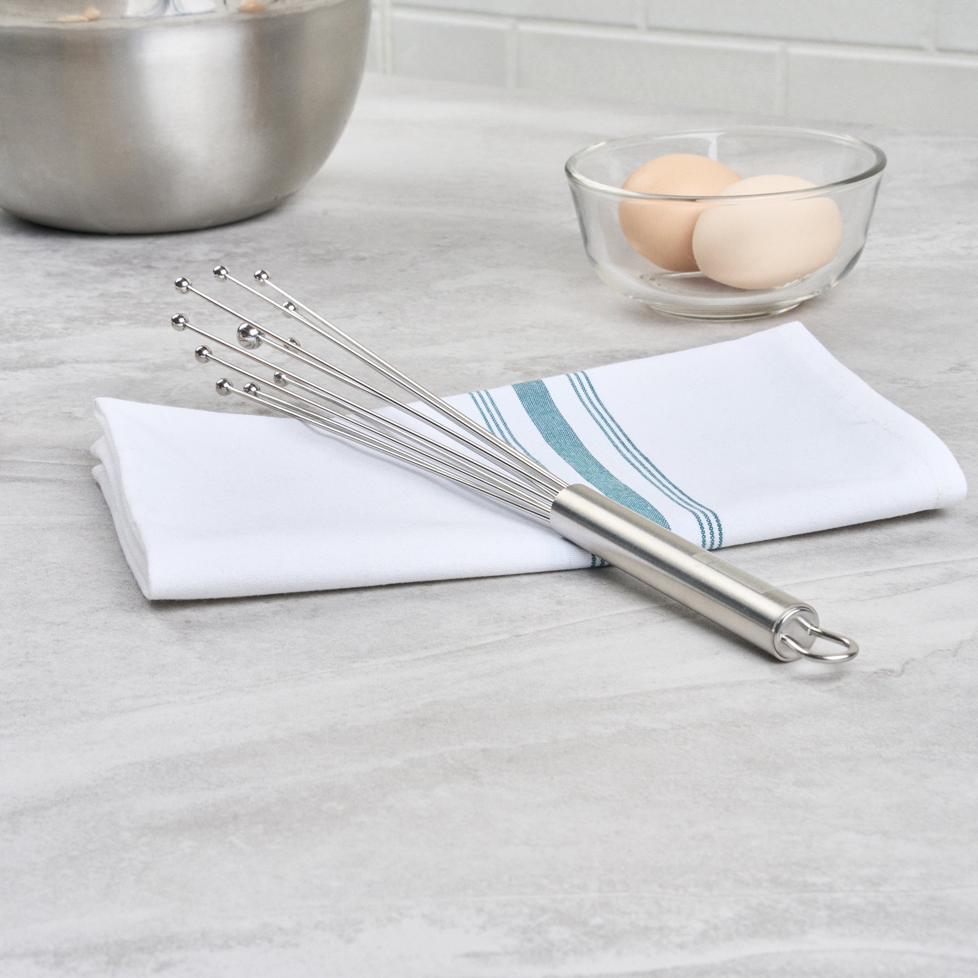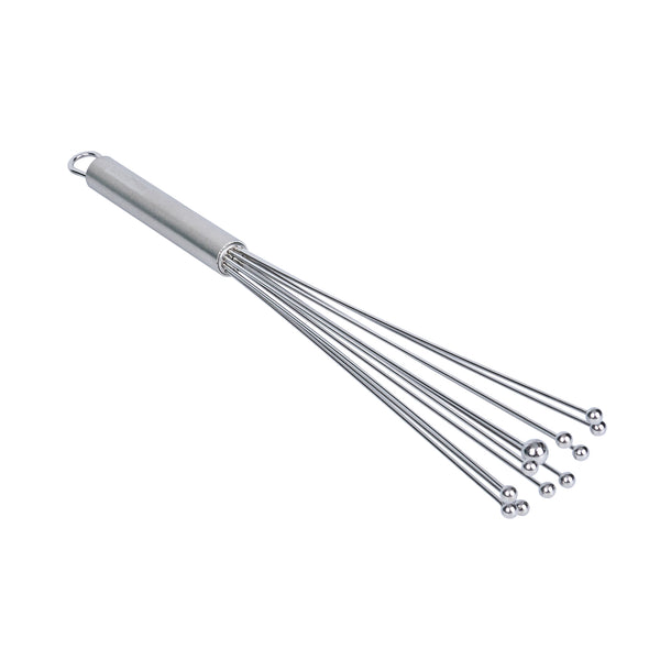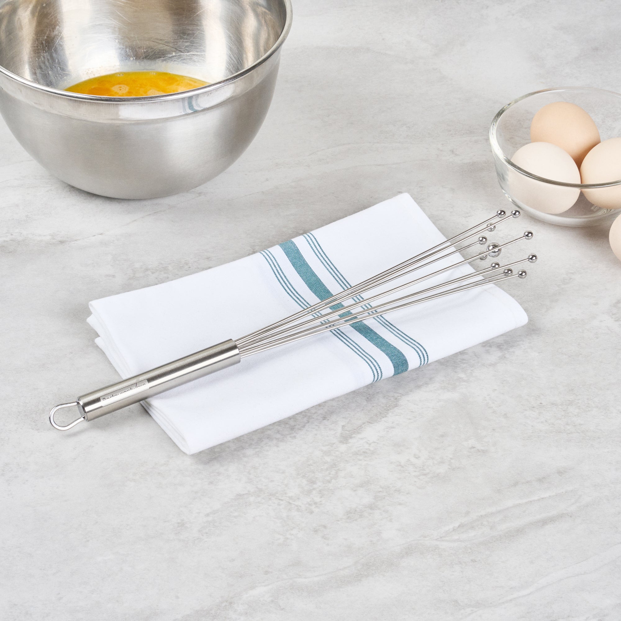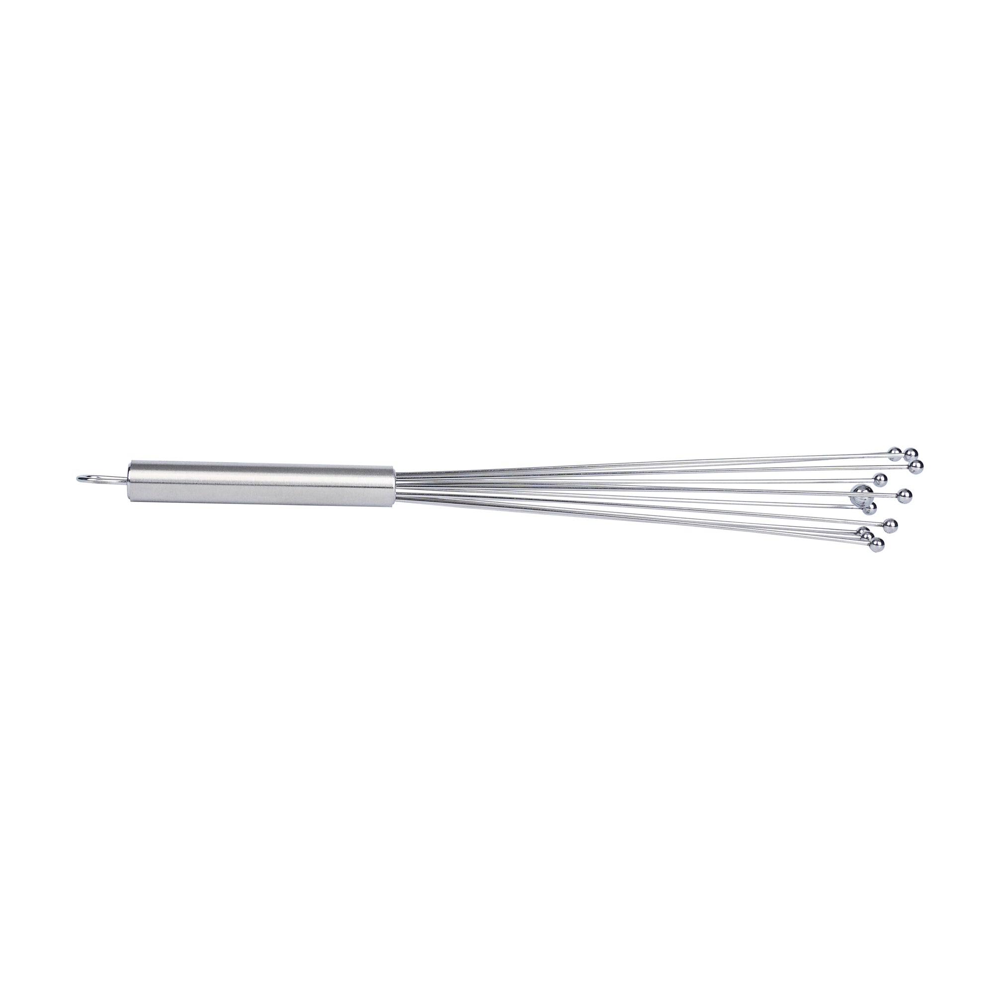 Whip up culinary masterpieces with ease and efficiency. The German Standard Stainless Steel Ball Whisk is designed with a 12.5-inch length, providing ample reach for mixing in deep bowls or pots, ensuring thorough blending in any bustling kitchen. This stainless steel whisk boasts a durable construction, offering resistance to corrosion and enduring frequent use in commercial environments. Its ball whisk design enhances aeration and efficient mixing, making it ideal as a whisk for whipping cream or emulsifying sauces to perfection. Featuring an ergonomically designed handle, it reduces hand fatigue, facilitating comfort during extended culinary tasks. The built-in eyelet hook aids in organized storage, keeping your kitchen tidy and accessible. Plus, this whisk is dishwasher-safe, allowing for easy cleaning and maintaining hygiene standards effortlessly. Elevate your food preparation with this reliable tool, perfect for professional chefs and foodservice operations. Each order includes 6 German Standard Stainless Steel Ball Whisks.