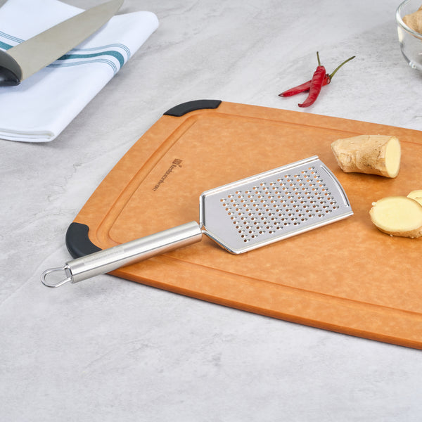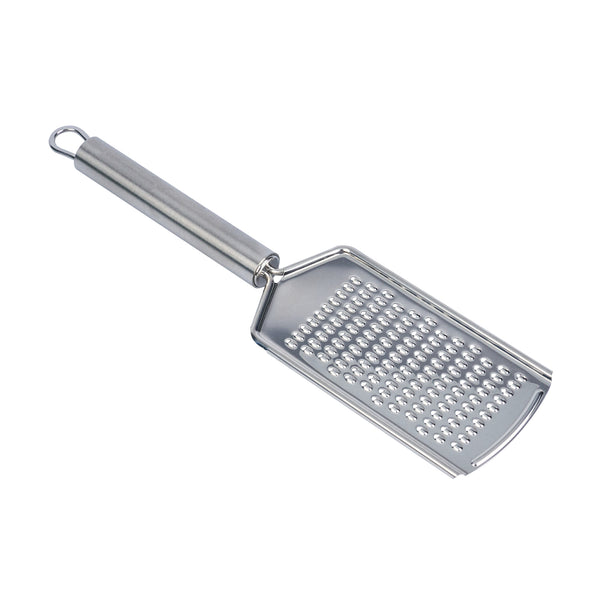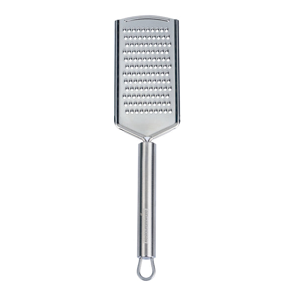 Experience effortless grating with precision-engineered kitchen tools. The German Standard Sharp Cheese Grater features sharp stainless steel blades that ensure precise grating, enabling chefs to create exquisite meal garnishes effortlessly. Its 9.8 inches length and ergonomic handle reduce hand fatigue, providing comfort and efficiency during extended kitchen use, making it an ideal kitchen grater for busy foodservice environments. Crafted from robust Cromargan stainless steel in a sleek silver finish, this cheese shredder is designed to withstand frequent use, ensuring long-lasting performance in commercial kitchens. Plus, it's dishwasher safe, allowing for easy and efficient cleanup, saving valuable time and maintaining hygiene standards. Enhance your culinary operations with this indispensable cheese grater, perfect for adding a touch of sophistication to any dish. Each order includes 1 German Standard Sharp Cheese Grater.