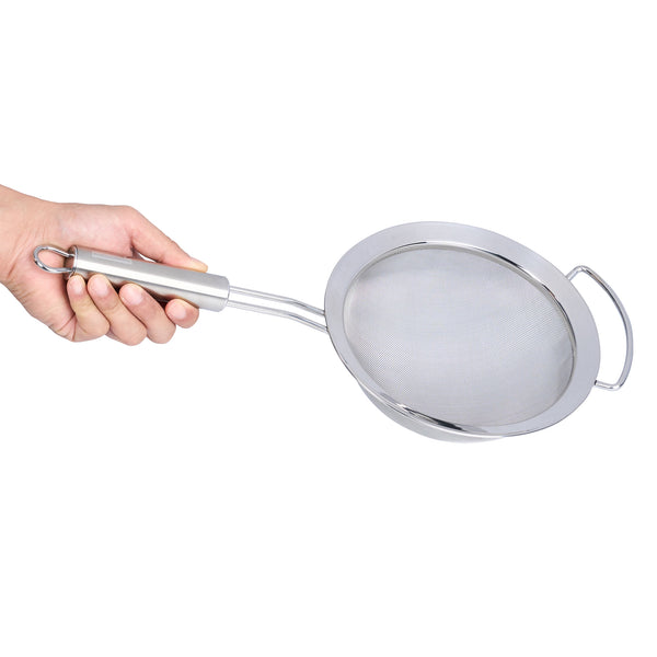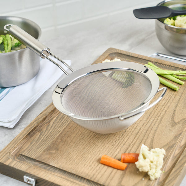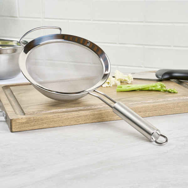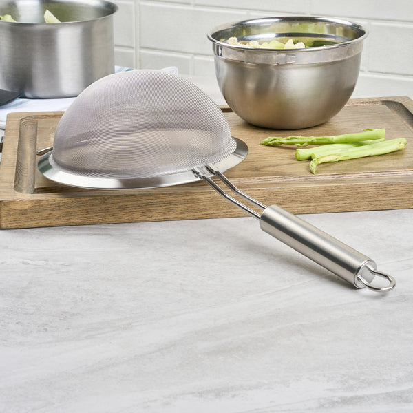 Discover the versatility of our German Standard Stainless Steel Fine Mesh Strainer. This metal strainer is designed with fine mesh and offers exceptional filtration, which is ideal for creating flavorful soup stocks or straining a variety of ingredients. The sturdy mesh design of this fine mesh strainer can withstand the pressure exerted by wooden spoons when filtering soups or stocks, ensuring your strainer maintains its shape and function. This stainless steel strainer is versatile and ideal for sifting flour or sugar. The ergonomically designed handle on this fine mesh sieve ensures a comfortable and secure grip, reducing hand fatigue and providing optimal control. This metal sieve has an attached hook that can be balanced on the pot’s rim for hands-free use. Crafted from stainless steel, this fine strainer mesh ensures robust performance and longevity in your kitchen. The convenient eyelet hook of this mesh strainer allows for easy storage, keeping your kitchen organized. For quick and easy cleaning experience, this strainer mesh is dishwasher-safe and suitable for busy kitchens. This stainless mesh strainer measures 16.8 inches in length by 7.9 inches in width by 3.3 inches in height, perfectly sized for a variety of kitchen tasks. Sold in a 1 count box.