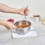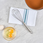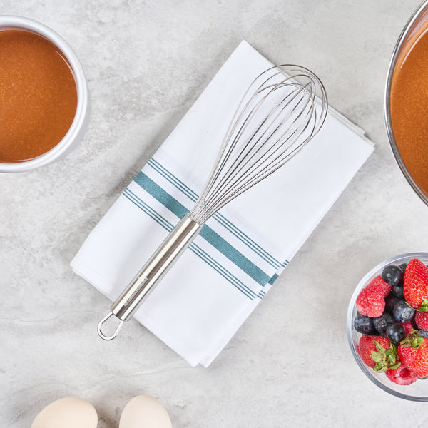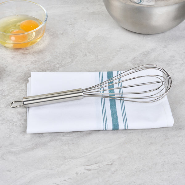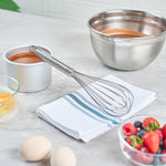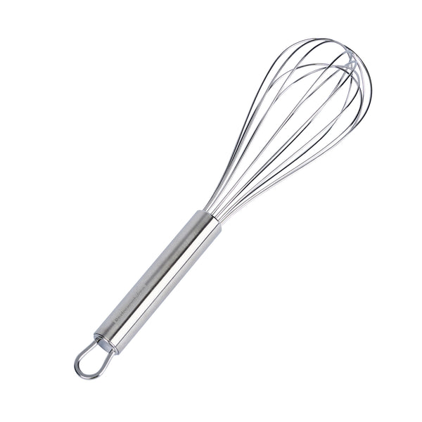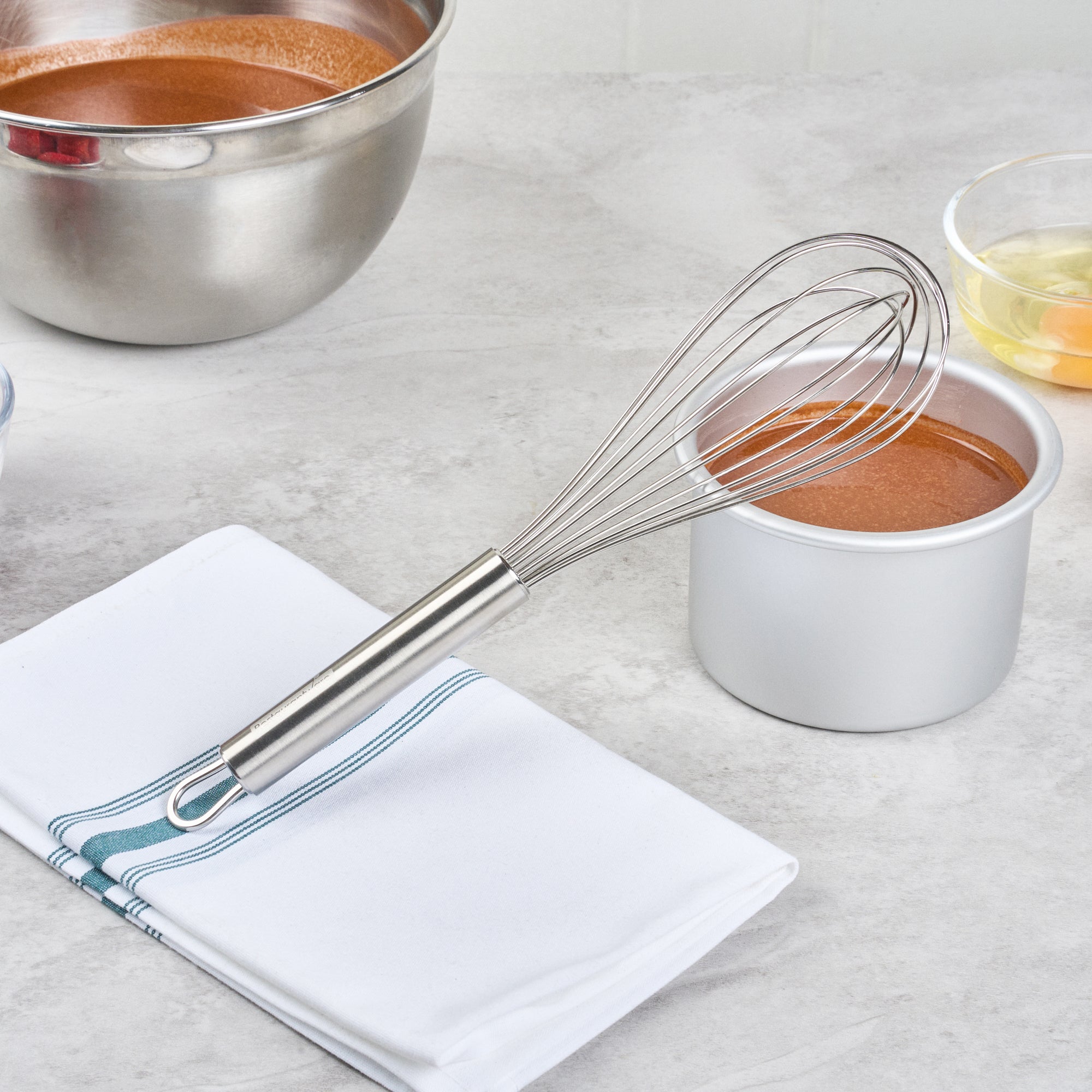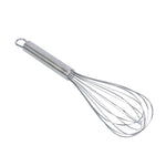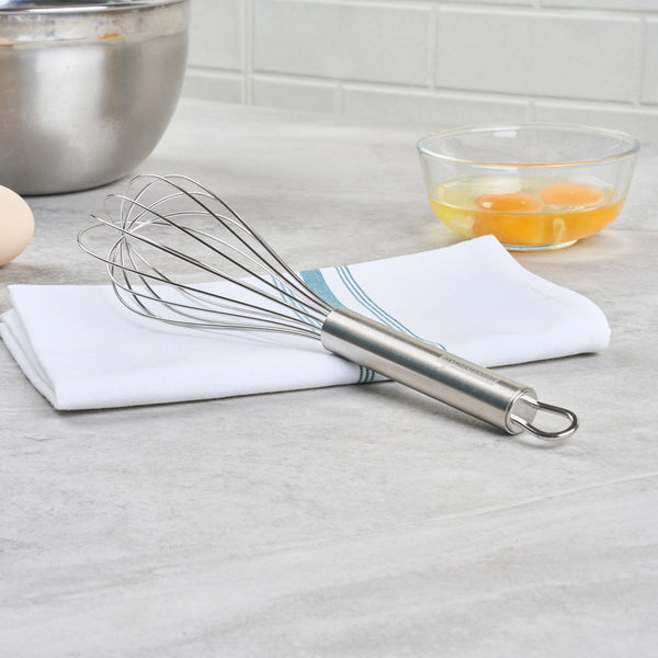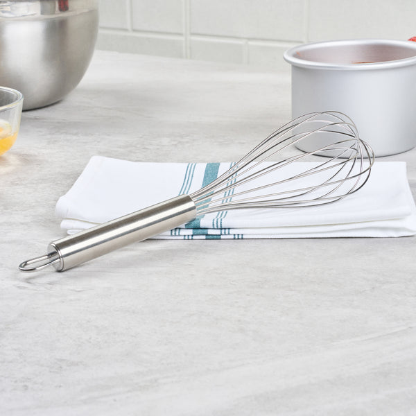 Ensure efficient blending with the German Standard 10.6" Stainless Steel Whisk. This stainless steel whisk features thick wires that effortlessly blend ingredients to a smooth consistency, optimizing culinary results in any professional kitchen. Its thin profile allows this kitchen whisk to reach every corner of bowls, ensuring thorough mixing and leaving no unmixed pockets behind, perfect for busy chefs seeking precision. With its ergonomic handle, the baking whisk offers a comfortable grip that reduces fatigue during prolonged use, providing superior control over mixing tasks. Thanks to its dishwasher-safe design, this whisk ensures efficient cleaning for quick reuse, saving valuable time during service. Invest in ease and efficiency in your kitchen. Each order includes 1 German Standard 10.6" Stainless Steel Whisk.