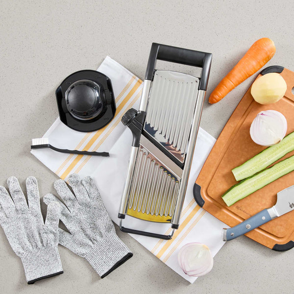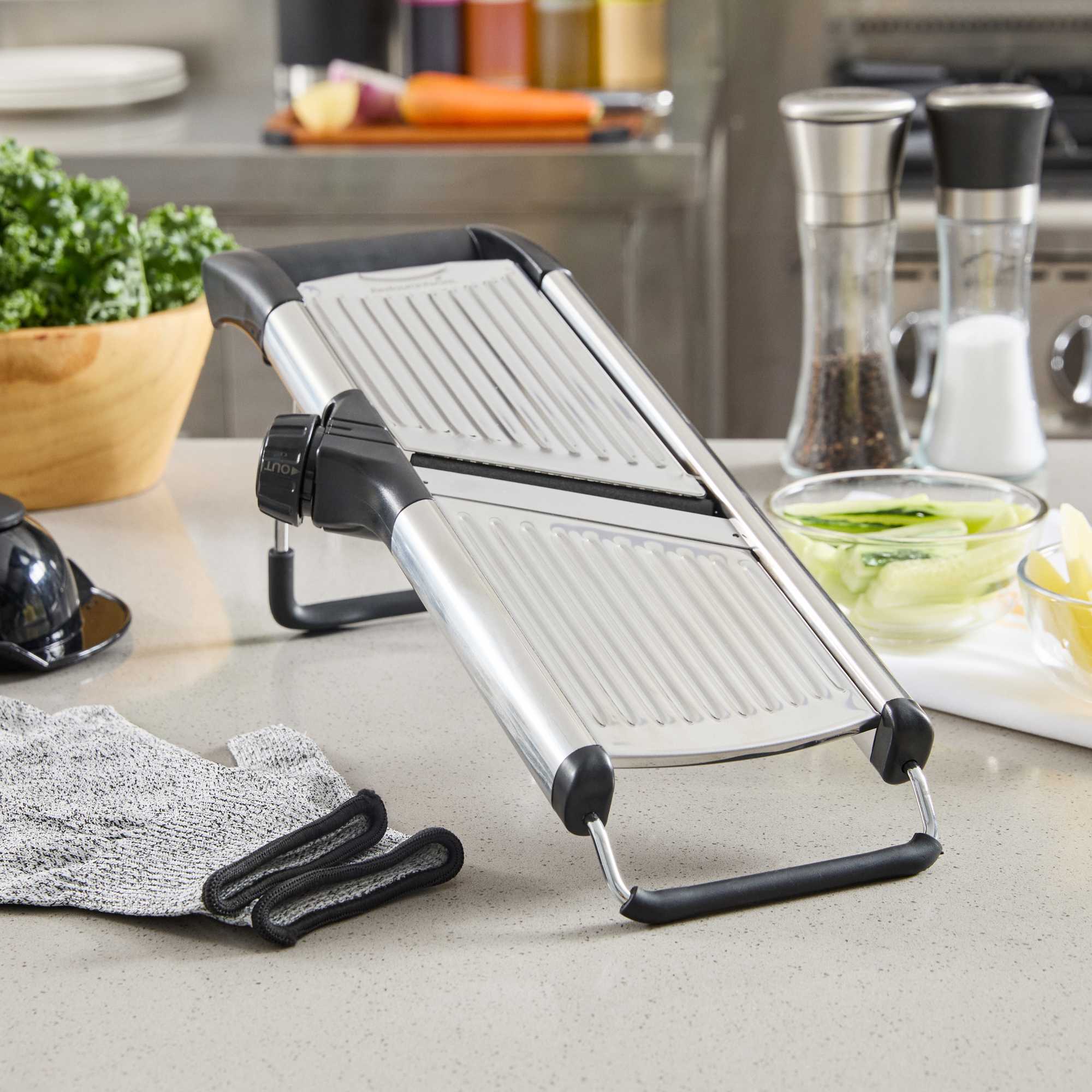 Streamline food prep with our German Standard Stainless Steel Heavy-Duty Adjustable Mandoline Slicer. Engineered for precision and durability, this heavy-duty slicer features an adjustable thickness setting that allows chefs to produce uniform slices quickly, ideal for high-volume commercial kitchens. Equipped with a built-in julienne blade, it’s perfect for crafting consistent vegetable cuts and elegant garnishes that elevate plate presentation. Constructed from stainless steel, this mandoline slicer is dishwasher safe and designed with a compact footprint measuring 16.4 inches by 5.3 inches, ensuring effortless cleanup and efficient storage. To prioritize safety, it includes a pair of cut-resistant gloves, a blade guard, and a cleaning brush, making it a dependable, professional-grade slicing solution. Sold in a 1 count box.
