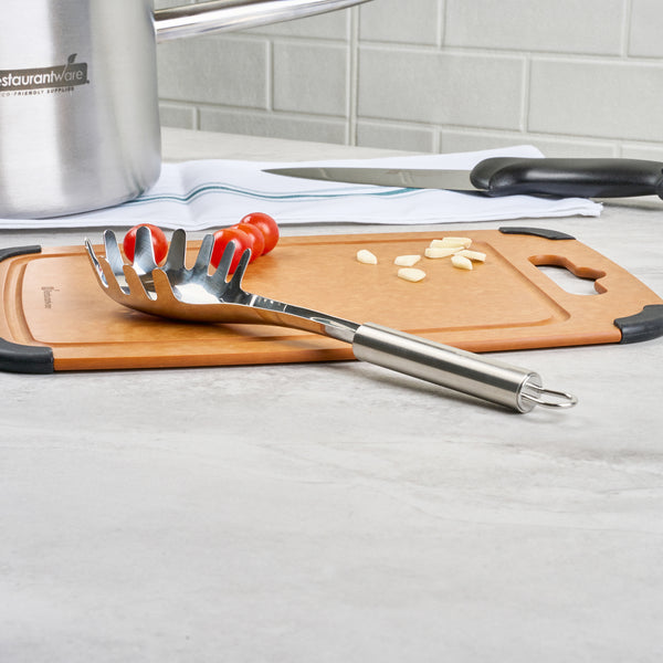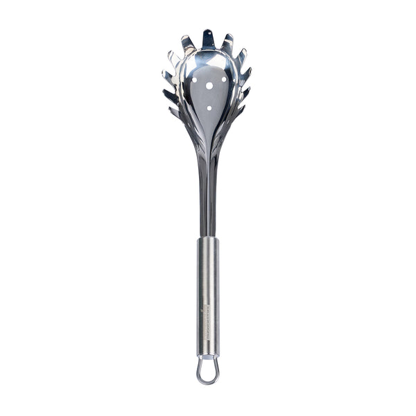 Enhance your kitchen efficiency with an ergonomic pasta server. The German Standard Stainless Steel Pasta Fork features a large, slotted bowl that efficiently scoops and drains pasta, ensuring perfect servings every time. Crafted from stainless steel, this pasta server ensures durability and resistance to corrosion, making it ideal for long-lasting use in busy kitchen environments. Its ergonomic handle design provides a comfortable grip, reducing hand fatigue during extended use. Measuring 12.5 inches in length by 2.8 inches in width, this versatile spaghetti server reaches deep into pots, making it perfect for serving various pasta dishes, salads, and other entrees. Designed to be dishwashable, it simplifies clean-up and reduces labor in fast-paced foodservice operations. Elevate your kitchen toolkit with this stainless steel pasta spoon that combines functionality and style. Sold in a 36 count box.