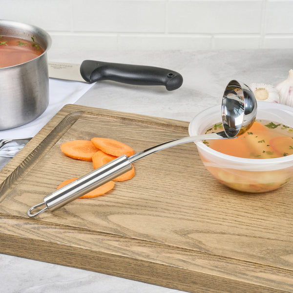 Achieve precise sauce serving with ease using the German Standard Stainless Steel Sauce Ladle. This stainless steel ladle features a deep bowl design that ensures accurate serving of soups and sauces, making it a must-have tool in any professional kitchen. The ergonomic handle provides a comfortable grip, reducing hand fatigue and enhancing control during extended use, perfect for those busy catering events. With its durable stainless steel 304 construction, this serving ladle withstands frequent use, ensuring long-lasting performance. Its dishwasher-safe design offers quick and easy cleaning, saving valuable time in high-paced environments. With dimensions of 10.6 inches in length by 2.5 inches in width by 2.4 inches in height, this silver ladle provides ample capacity for serving. Make this reliable stainless steel ladle a staple in your kitchen toolkit for efficient service. Sold in a 1 count box.