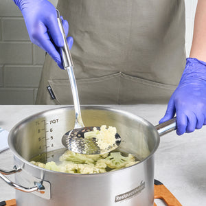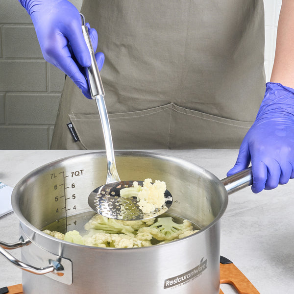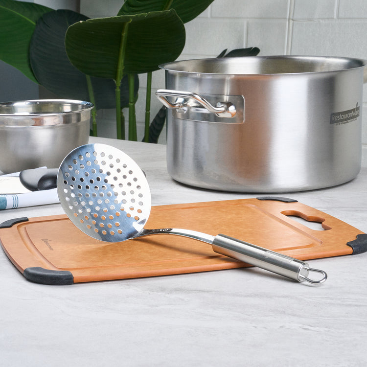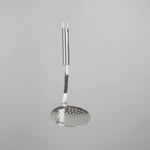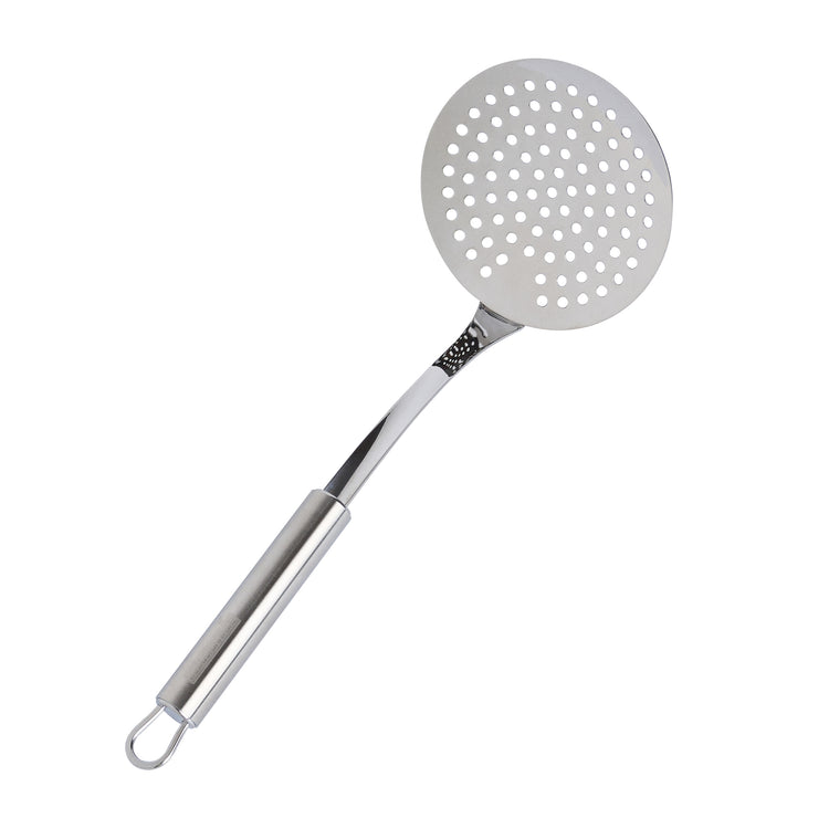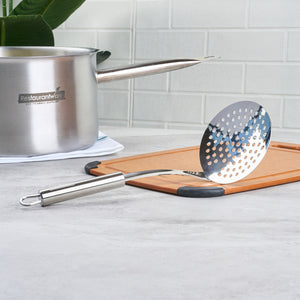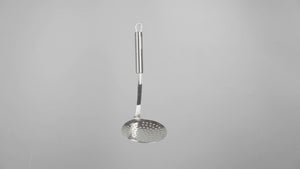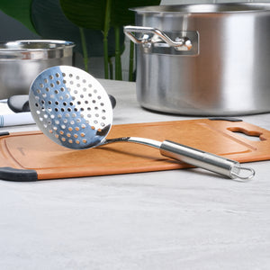 Experience the utmost in culinary efficiency with our German Standard Stainless Steel Skimmer. Featuring a concave head with precision perforated holes, this stainless steel skimmer effortlessly scoops food from hot liquids while retaining the liquid within the pan. Featuring an ergonomic long handle, this slotted spoon ensures a firm grip while retrieving food from liquids or sauces. This skimmer spoon is made from premium stainless steel for robust durability and long-lasting performance in your kitchen. The built-in eyelet hook of this frying spoon allows convenient storage when not in use. For quick and easy cleanup, this fryer spoon is dishwasher-safe and ideal for busy kitchens. This stainless steel skimmer spoon measures 12.1 inches in length by 4.3 inches in width. Sold in a 1 count box.