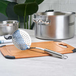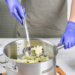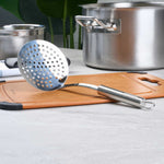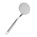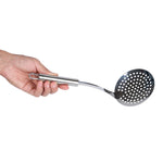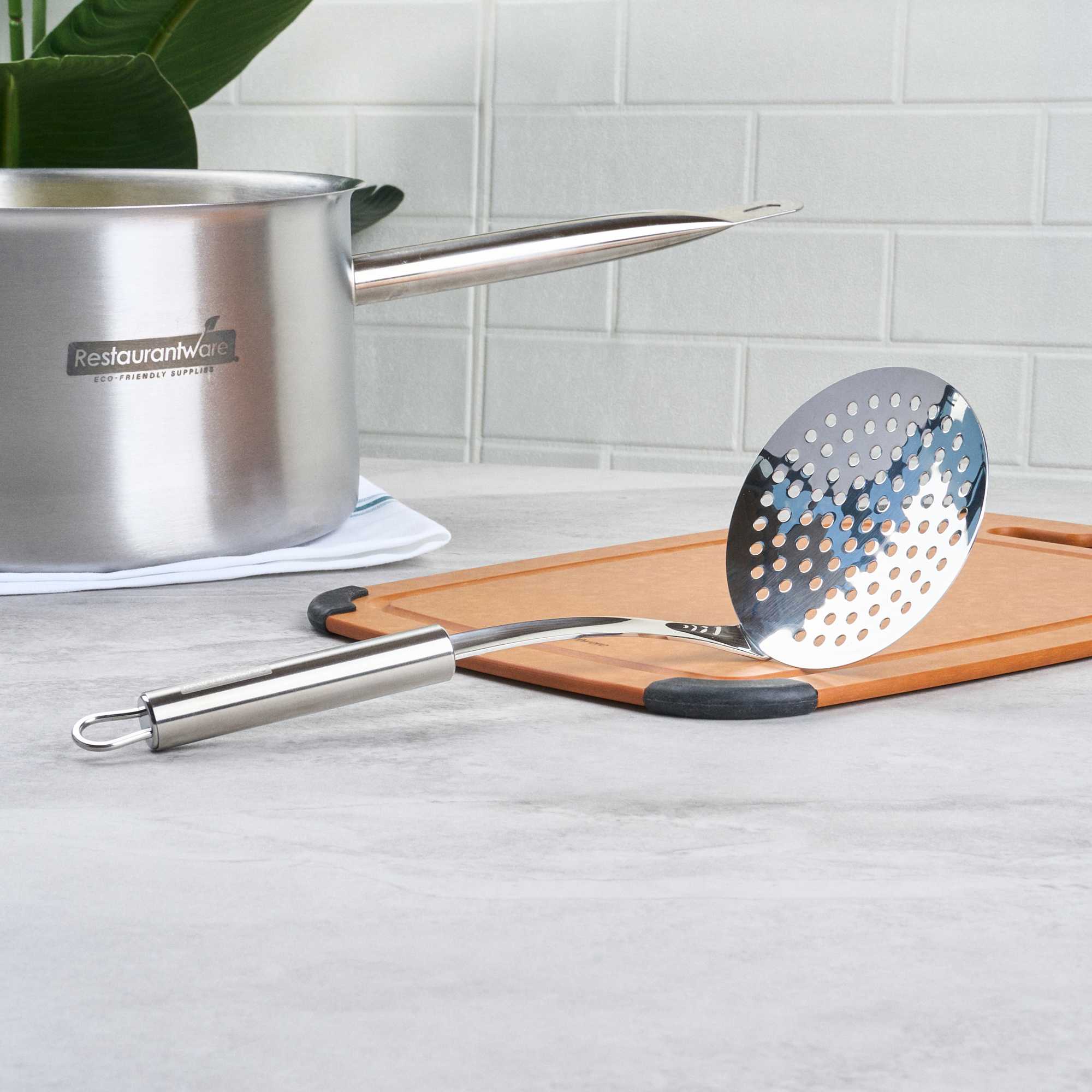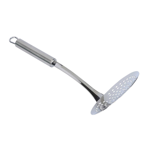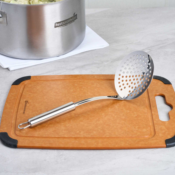 Experience the utmost in culinary efficiency with our German Standard Stainless Steel Skimmers. Featuring a concave head with precision perforated holes, these stainless steel skimmers effortlessly scoop food from hot liquids while retaining the liquid within the pan. Featuring an ergonomic long handle, these slotted spoon ensures a firm grip while retrieving food from liquids or sauces. These skimmer spoons are made from premium stainless steel for robust durability and long-lasting performance in your kitchen. The built-in eyelet hook of these frying spoons allows convenient storage when not in use. For quick and easy cleanup, these fryer spoons are dishwasher-safe and ideal for busy kitchens. These stainless steel skimmer spoons measure 12.1 inches in length by 4.3 inches in width. Sold in a 6 count box.