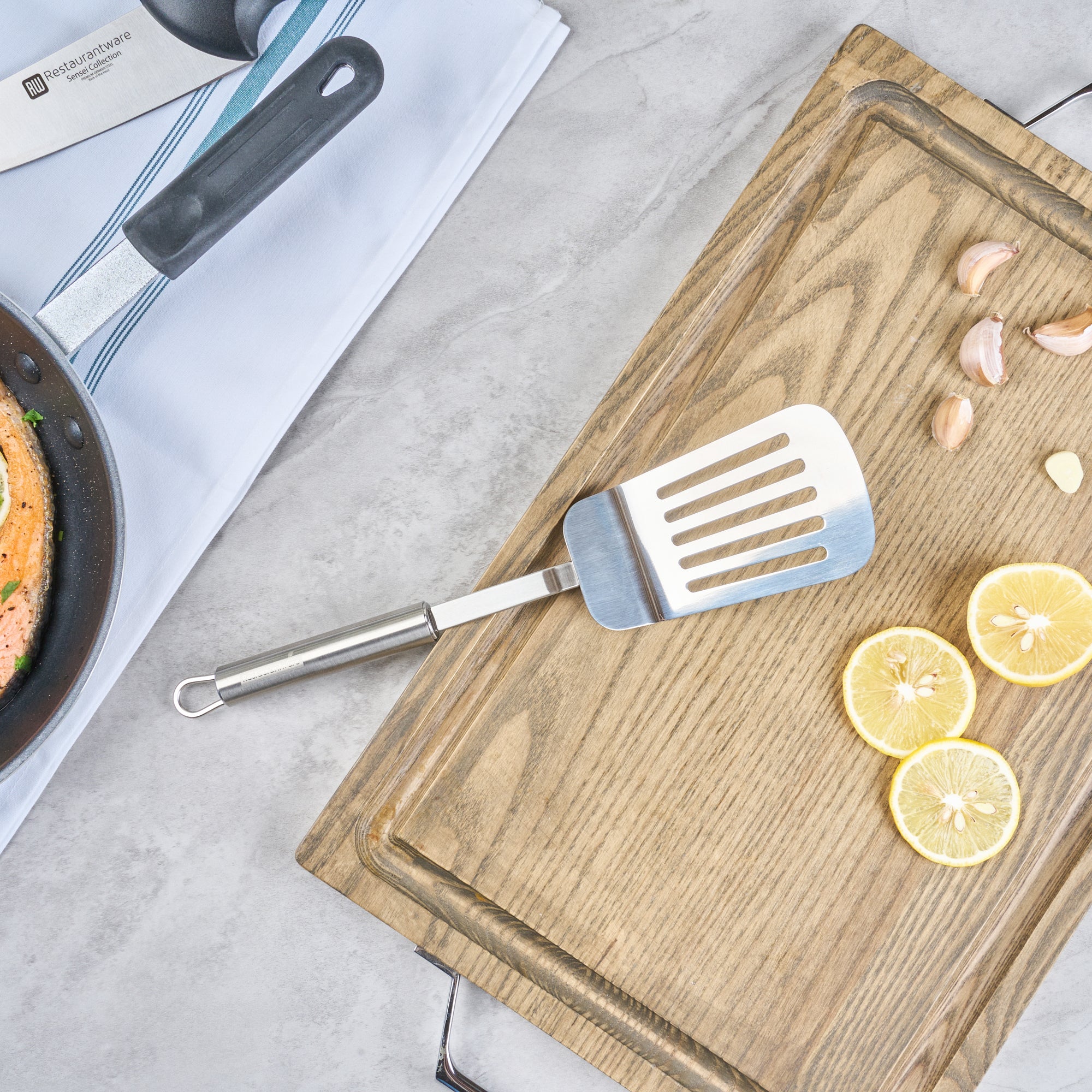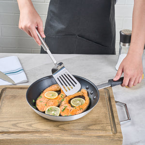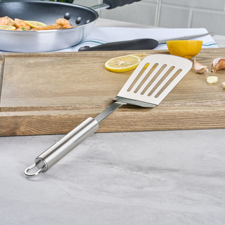 Enhance your kitchen efficiency with versatile tools. The German Standard Slotted Stainless Steel Fish Spatula – Ergonomic Handle boasts a slotted turner design, efficiently draining excess oils and liquids for cleaner plating in busy commercial kitchens. Crafted from robust stainless steel, it ensures longevity and resists corrosion, making it an ideal stainless steel spatula for handling acidic dishes without compromising quality. Its ergonomic handle provides a comfortable grip, reducing hand fatigue during extended use, while its dishwasher-safe feature significantly cuts down cleanup time. Measuring 12.6 inches in length, this fish spatula offers ample reach for safely flipping and serving a variety of foods, from pancakes to delicate fish fillets. Elevate your kitchen's performance with this indispensable tool. Each order includes 6 German Standard Slotted Stainless Steel Fish Spatulas.