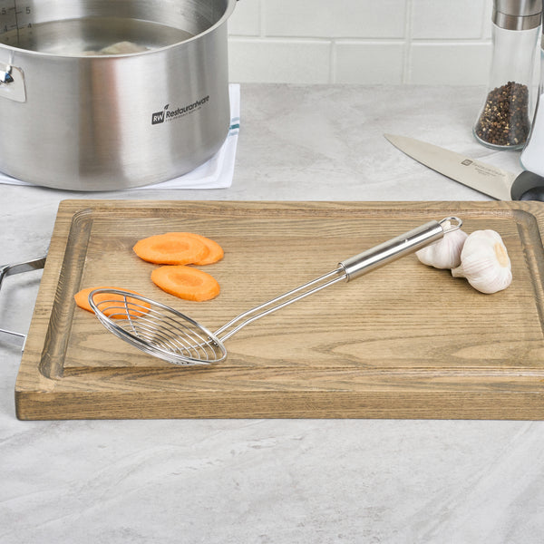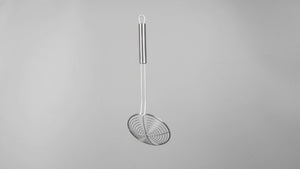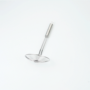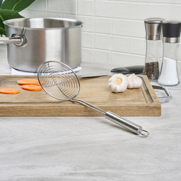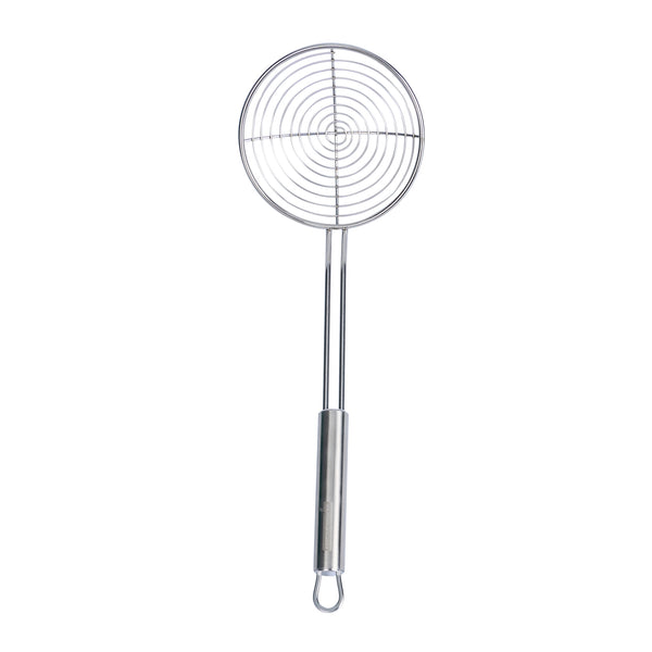Introduce a new level of professionalism to your kitchen with our German Standard Stainless Steel Spiral Wire Skimmer. This skimmer spoon features a shallow basket designed to safely scoop up and drain food items like vegetables, dumplings, or noodles from hot liquids or oil. The long, ergonomic handle of this slotted spoon allows for precise maneuvering in hot situations, keeping your hands at a comfortable distance from the heat. This frying spoon is created from stainless steel and boasts premium durability for long-lasting performance in your kitchen. The built-in hook of this stainless steel skimmer enables easy storage, keeping your kitchen area organized. For a straightforward cleanup, this fryer spoon is dishwasher-safe. This metal frying spoon measures 13.9 inches in length by 4.8 inches in width. Sold in a 1 count box.