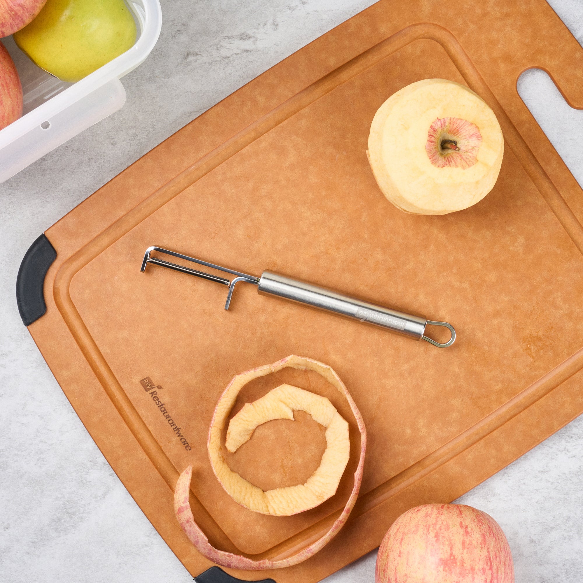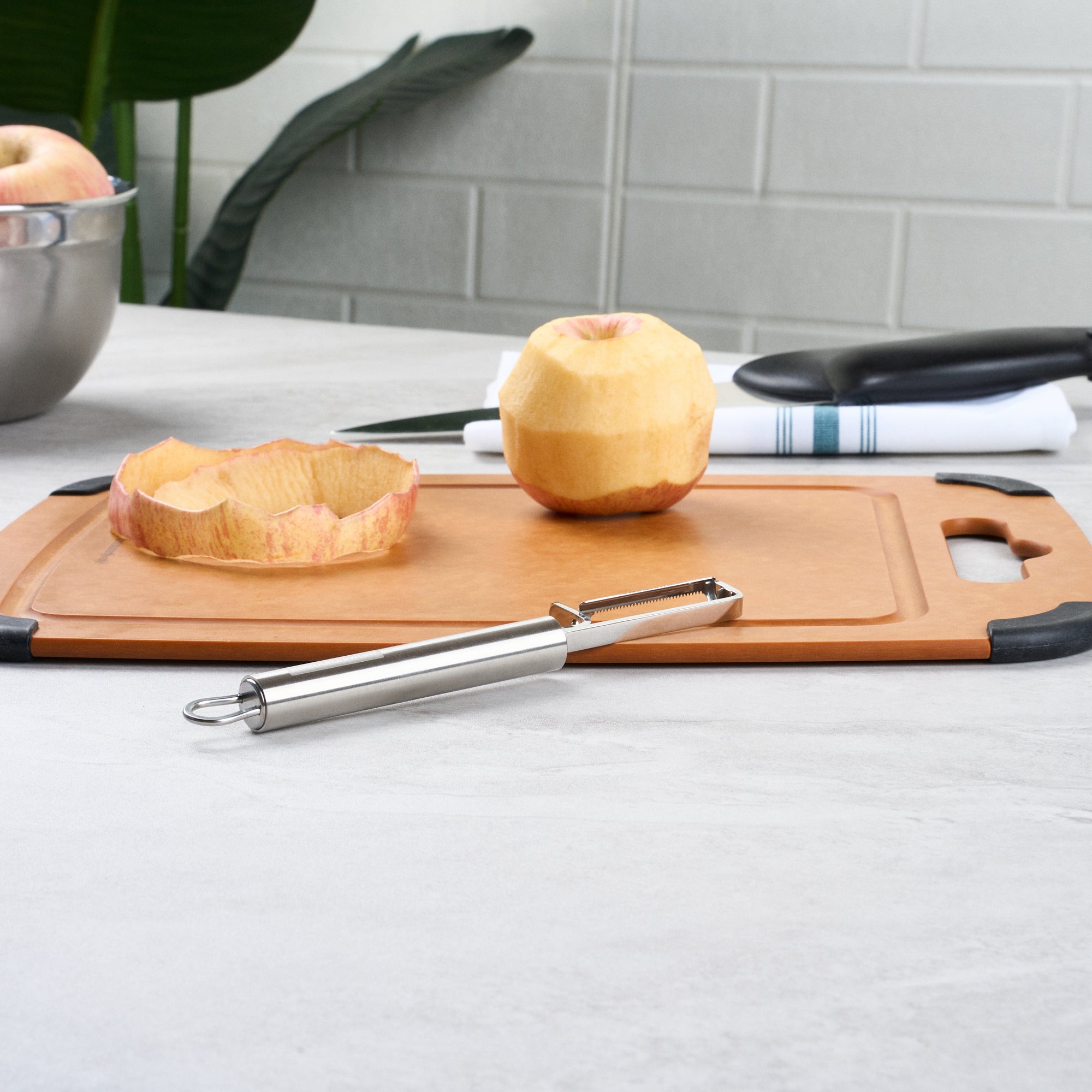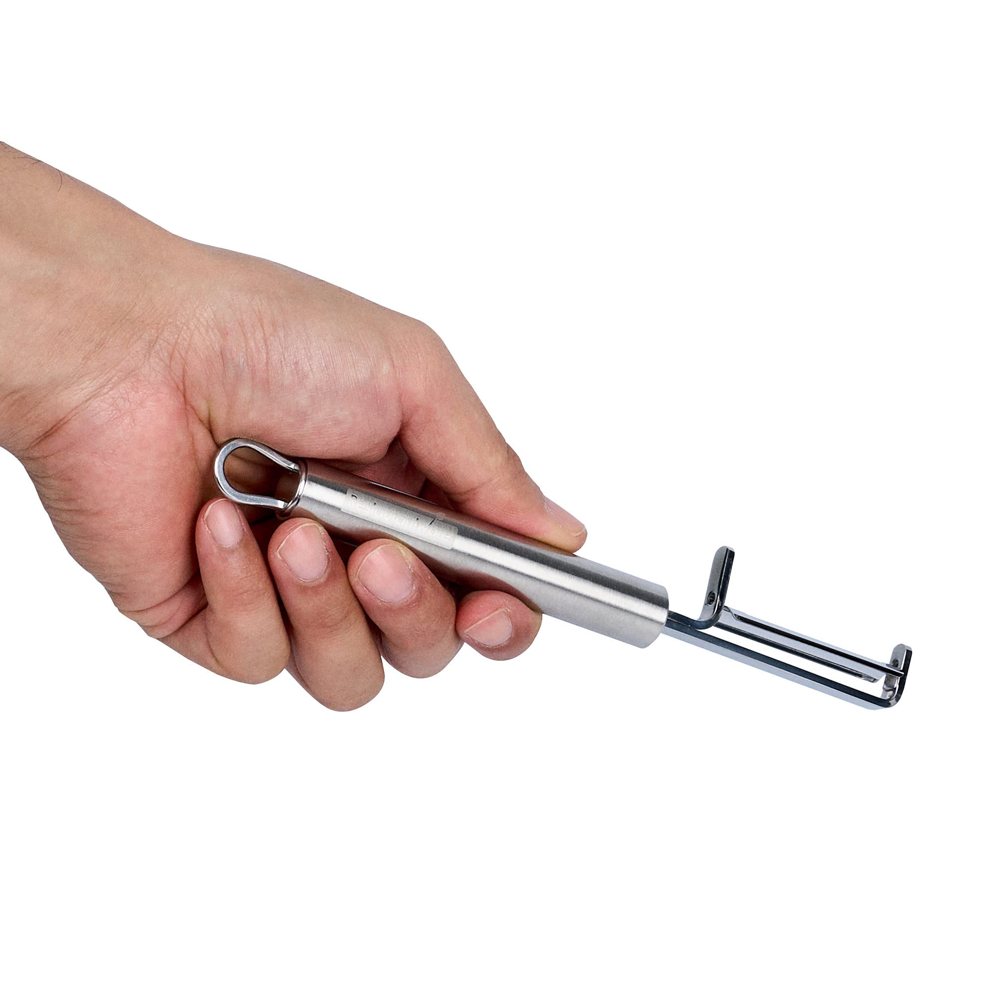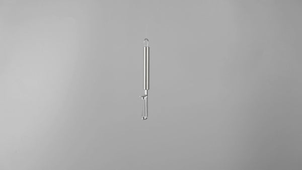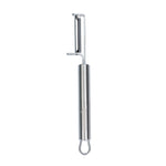 Peel vegetables precisely with our German Standard Stainless Steel Straight Vegetable Peeler. The serrated blade of this vegetable peeler facilitates the effective peeling of fruits and vegetables with tough or slipper skins without causing damage. This potato peeler has a double-edge blade design and allows for smooth back-and-forth motions while peeling. The ergonomic handle of this carrot peeler offers a comfortable and secure grip, ensuring optimal comfort during use. Crafted from durable stainless steel, this cucumber peeler is built for long-lasting performance and durability in your kitchen. The convenient built-in hook of this peeler for carrot allows easy storage when not in use, keeping your kitchen space organized. This stainless steel vegetable peeler is dishwashable to make cleanup a breeze and is ideal for busy kitchens. Measuring 7.4 inches in length, this cabbage peeler is a compact and functional tool for your kitchen. Sold in a 1 count box.