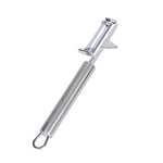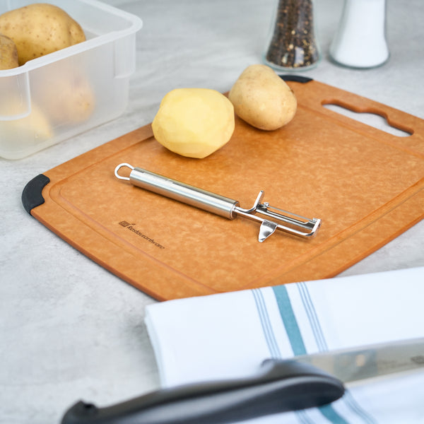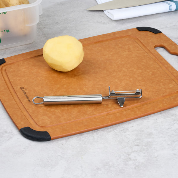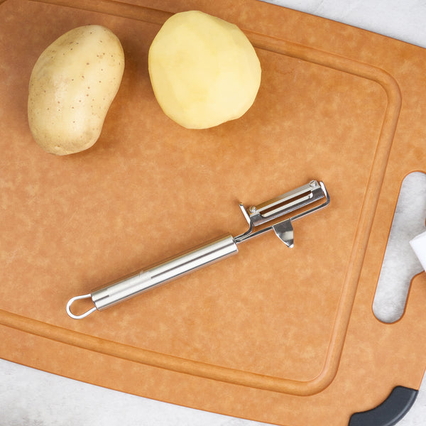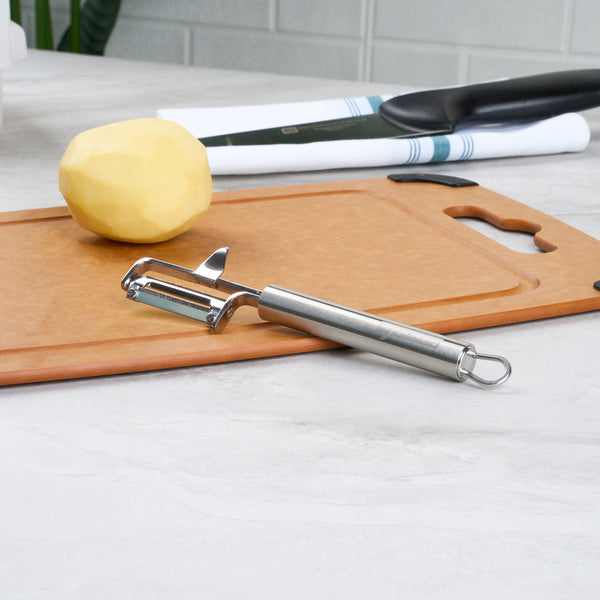 Experience efficient peeling with our German Standard Stainless Steel Vegetable Peeler. Equipped with a swivel blade, this vegetable peeler offers enhanced maneuverability, allowing you to peel fruits and vegetables from various angles. The built-in potato eye remover of this carrot peeler effectively removes unwanted blemishes or sprouts from potatoes. This potato peeler has an ergonomic handle and provides a secure grip, reducing hand fatigue for optimal control. Crafted from stainless steel, this cucumber peeler ensures robust performance and longevity in your kitchen. The integrated hook of this stainless steel peeler provides convenient storage options, allowing you to hang it up for easy access in your kitchen. This stainless steel vegetable peeler is dishwashable for quick and efficient cleanup, making it ideal for busy choices. Measuring 7.4 inches in length, this peeler for carrot is a reliable tool for effortless peeling in the kitchen. Sold in a 1 count box.