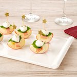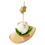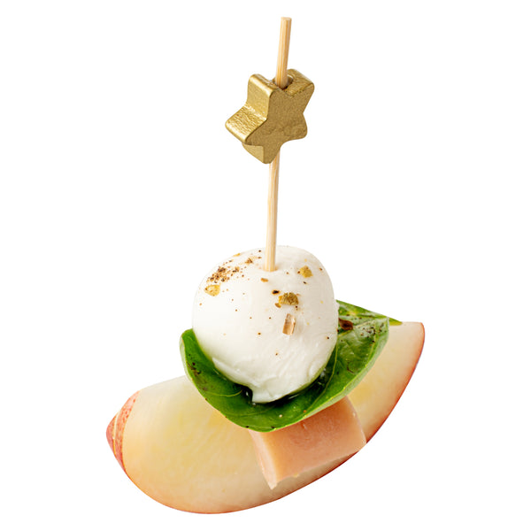 Add glamour to your burgers by using our Gold Bamboo Star Skewers. Made from premium bamboo, these skewers for appetizers are durable and break-resistant to confidently pierce through food. Featuring a golden star on the decorative end, these skewers for appetizers spruce up dishes at your restaurant or cafe. These skewers for marshmallows don't get heated and allow your customers to relish hot starters without burning their fingers. The pointed edge of these wooden brochettes pierces slices of pineapple, olives, or lemons easily, letting you garnish cocktails. Conveniently disposable, these cocktail picks are highly sustainable and speed up your post-event cleanup process. The microwavable feature of these skewer sticks allows you to reheat the leftover single-bite foods when needed. With a smooth, splinter-free surface, these sandwich skewers let your guests enjoy their starters and dips comfortably. These bamboo skewers let you serve finger foods conveniently, allowing your guests to eat their appetizers without a mess. Measuring 3.5 inches in length, these cocktail skewers are an apt choice for shrimp, sandwiches, fruit kabobs, or canapes. Shipped in a 100 count box.