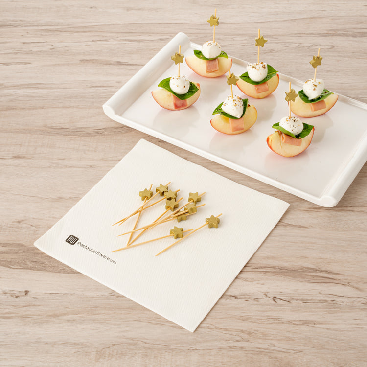 Add glamour to your burgers by using our Gold Bamboo Star Skewers. Made from premium bamboo, these skewers for appetizers are durable and break-resistant to confidently pierce through food. Featuring a golden star on the decorative end, these skewers for appetizers spruce up dishes at your restaurant or cafe. These skewers for marshmallows don't get heated and allow your customers to relish hot starters without burning their fingers. The pointed edge of these wooden brochettes pierces slices of pineapple, olives, or lemons easily, letting you garnish cocktails. Conveniently disposable, these cocktail picks are highly sustainable and speed up your post-event cleanup process. The microwavable feature of these skewer sticks allows you to reheat the leftover single-bite foods when needed. With a smooth, splinter-free surface, these sandwich skewers let your guests enjoy their starters and dips comfortably. These bamboo skewers let you serve finger foods conveniently, allowing your guests to eat their appetizers without a mess. Measuring 3.5 inches in length, these cocktail skewers are an apt choice for shrimp, sandwiches, fruit kabobs, or canapes. Shipped in a 100 count box.