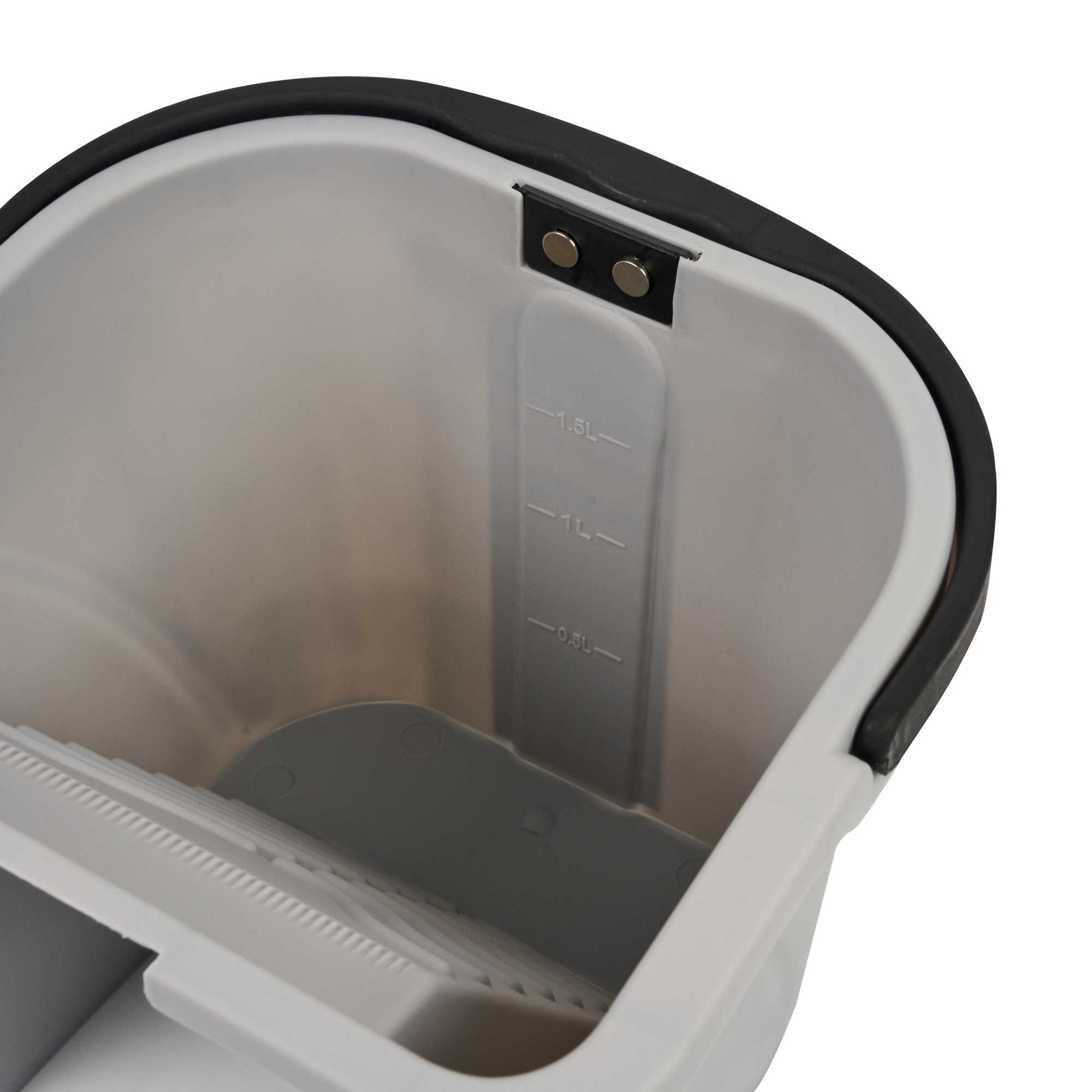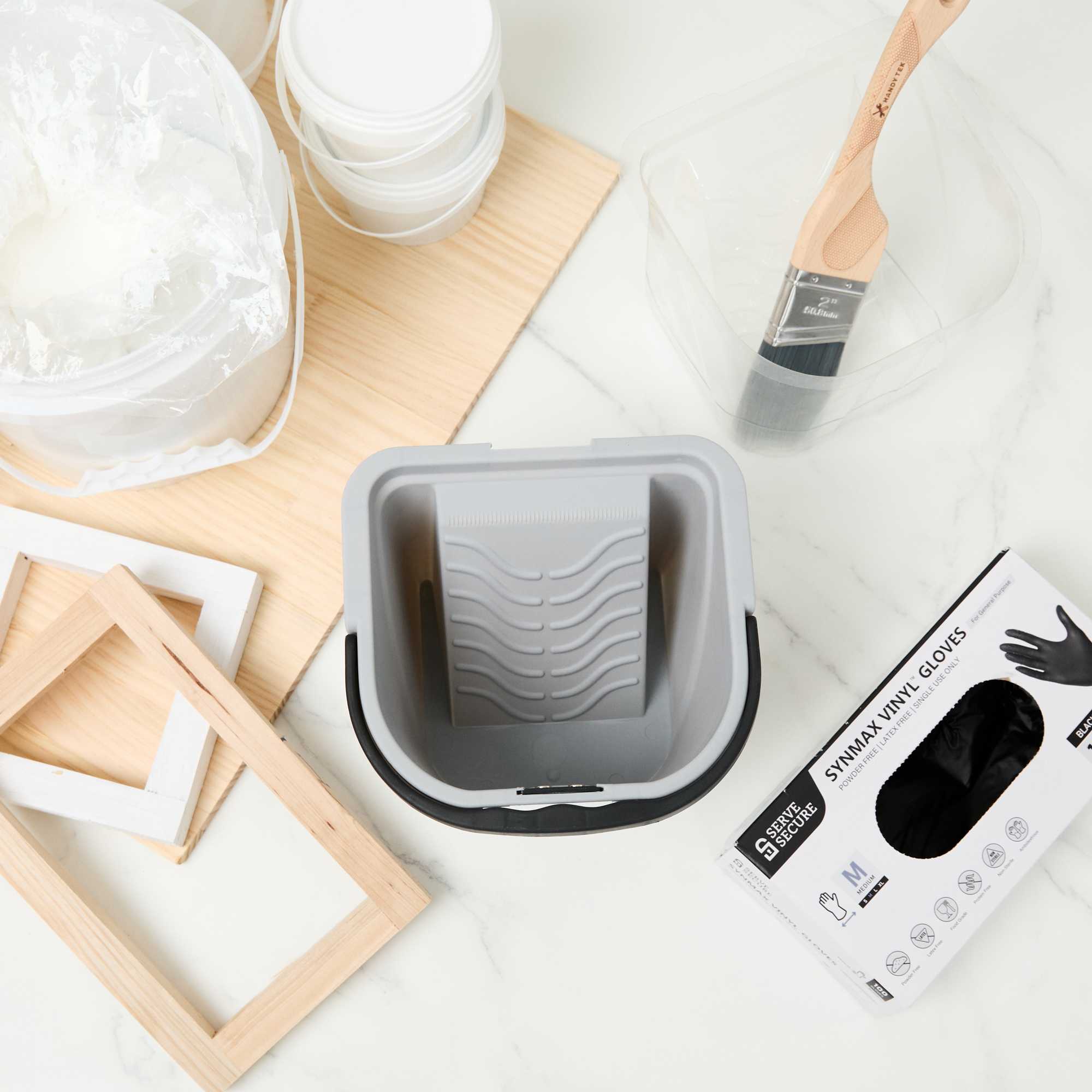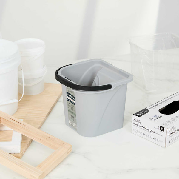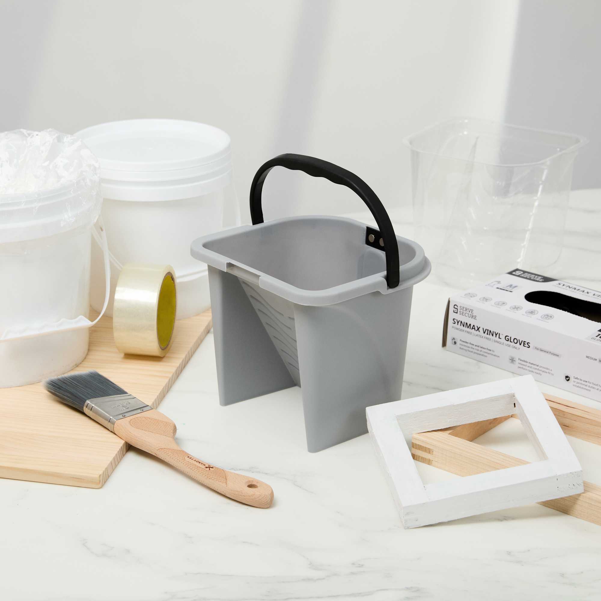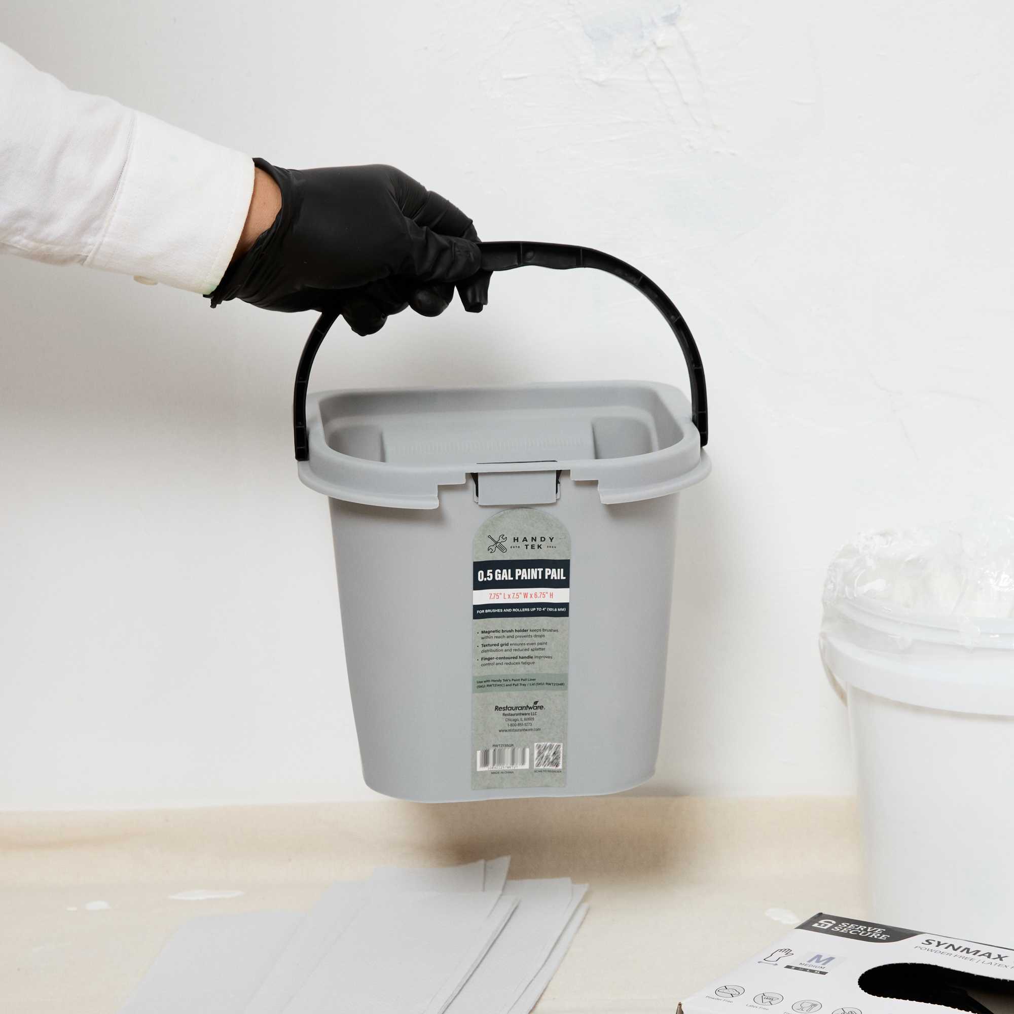 Introducing our Handy Tek 0.5-gallon Gray Plastic Paint Pail, a versatile and essential tool for any painting project. This bucket is made from durable plastic that resists wear and is easy to clean, making it excellent for repeated use. With a magnetic brush holder, this paint mixing pail securely keeps brushes in place, avoiding messes and ensuring they're always within reach. Pair this pail with our compatible Handy Tek's paint pail liner (SKU: RWT2141C) and lid (SKU: RWT2134B) for a smooth painting experience. The ergonomic handle on this painter’s pail features finger contours for a comfortable grip, reducing hand strain and improving control while painting. Featuring a wavy line grid, this plastic paint pail helps evenly distribute paint on rollers, minimizing excess and ensuring a smooth application. This paint container has a capacity of 2.35 quarts and measures 7.76 inches in length by 7.52 inches in width by 6.69 inches in height. Sold in a 1 count box.