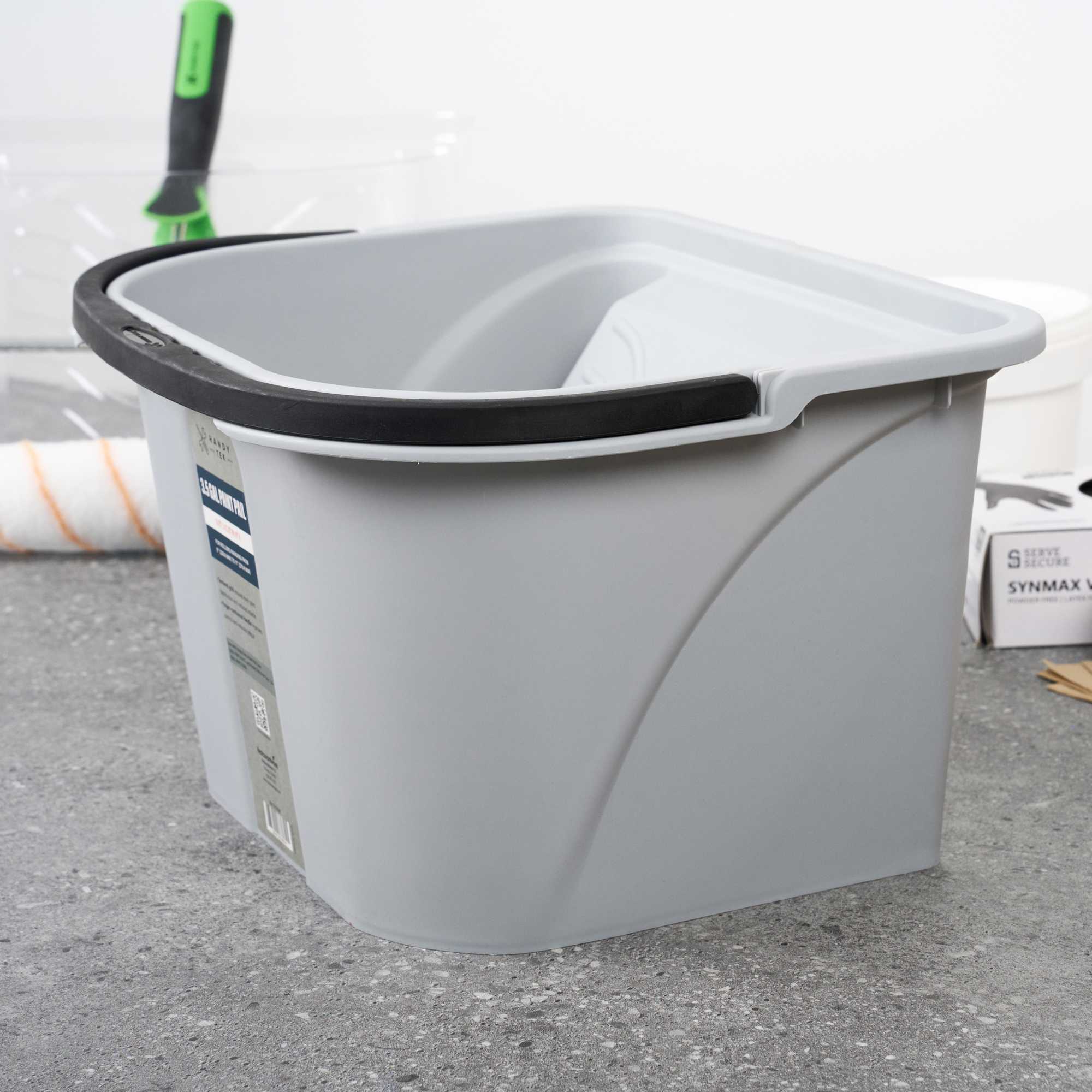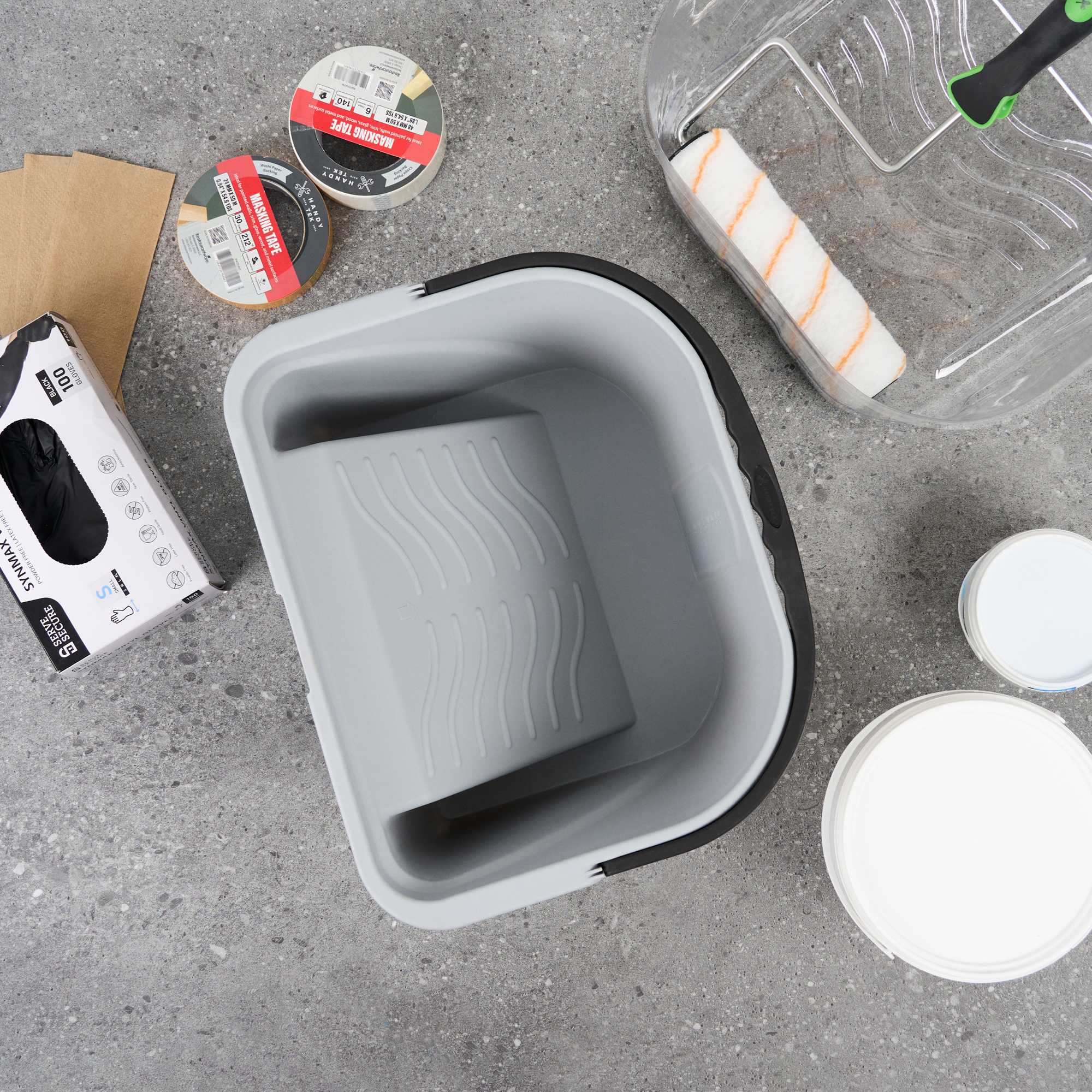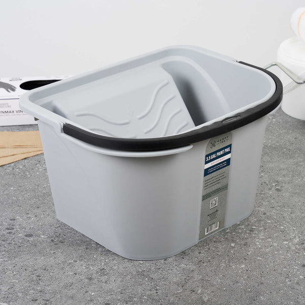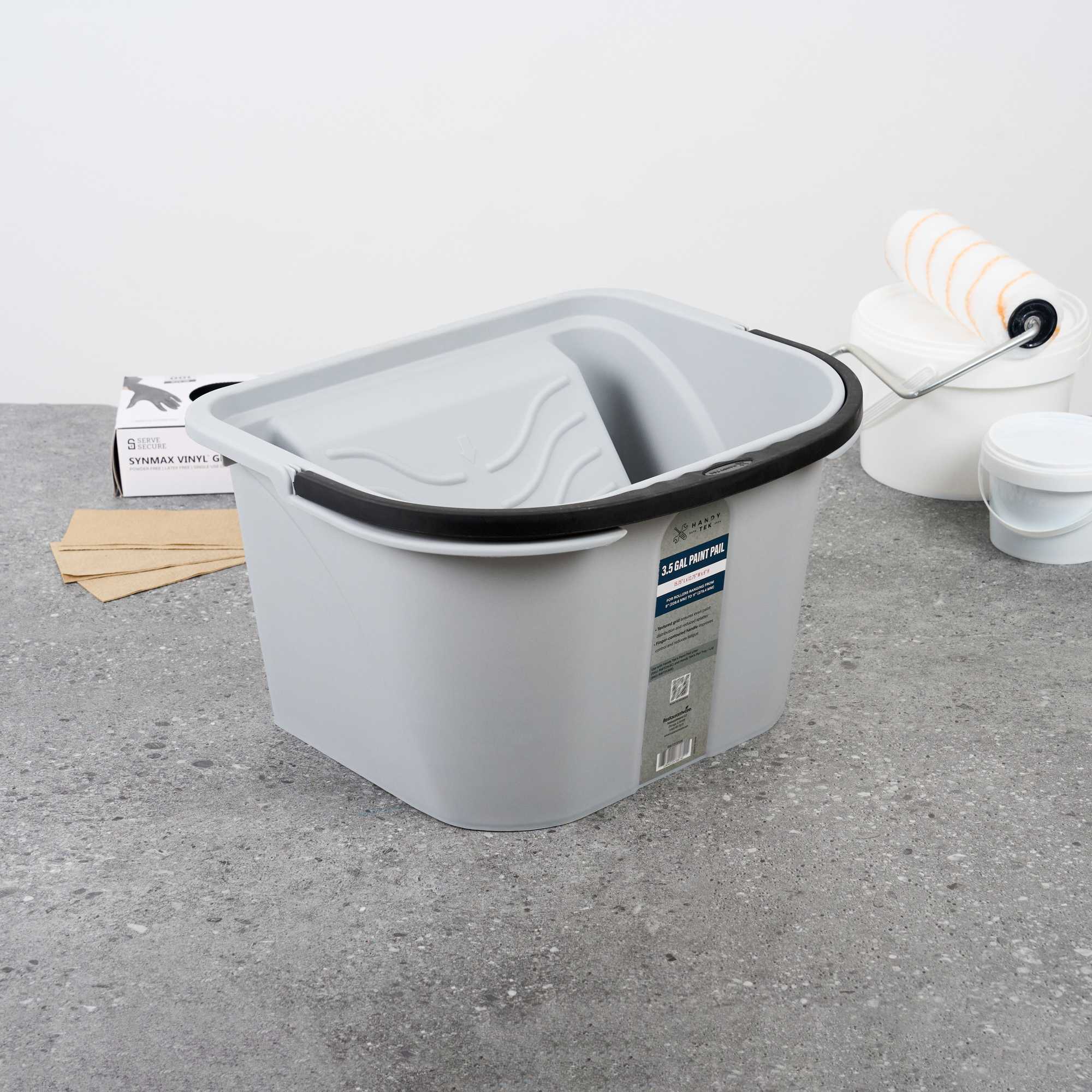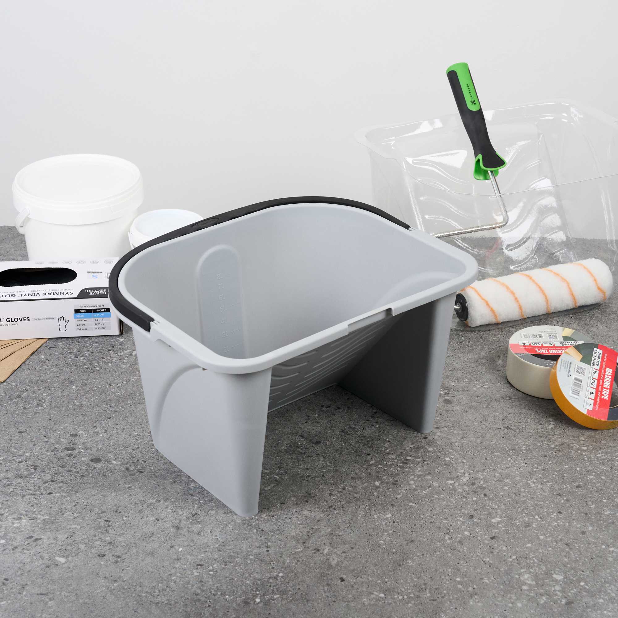 Elevate your painting experience with our Handy Tek 3.5-gallon Gray Plastic Paint Pail, designed to meet the demands of both experts and DIY enthusiasts. This durable painting bucket is crafted from strong plastic, ensuring it resists wear and remains easy to clean after every use. With a magnetic brush holder, this paint mixing pail securely keeps brushes in place, avoiding messes and ensuring they're always within reach. Pair this pail with our compatible Handy Tek's paint pail liner (SKU: RWT2143C) and lid (SKU: RWT2136G) for a smooth painting experience. With an ergonomic handle featuring finger contours, this paint mixing pail provides a comfortable grip, reducing hand strain and enhancing control during painting tasks. Measuring 15.83 inches in length by 12.8 inches in width by 9.06 inches in height, this paint container has a generous capacity of 14.47 quarts, making it an excellent choice for larger painting projects. Sold in a 1 count box.