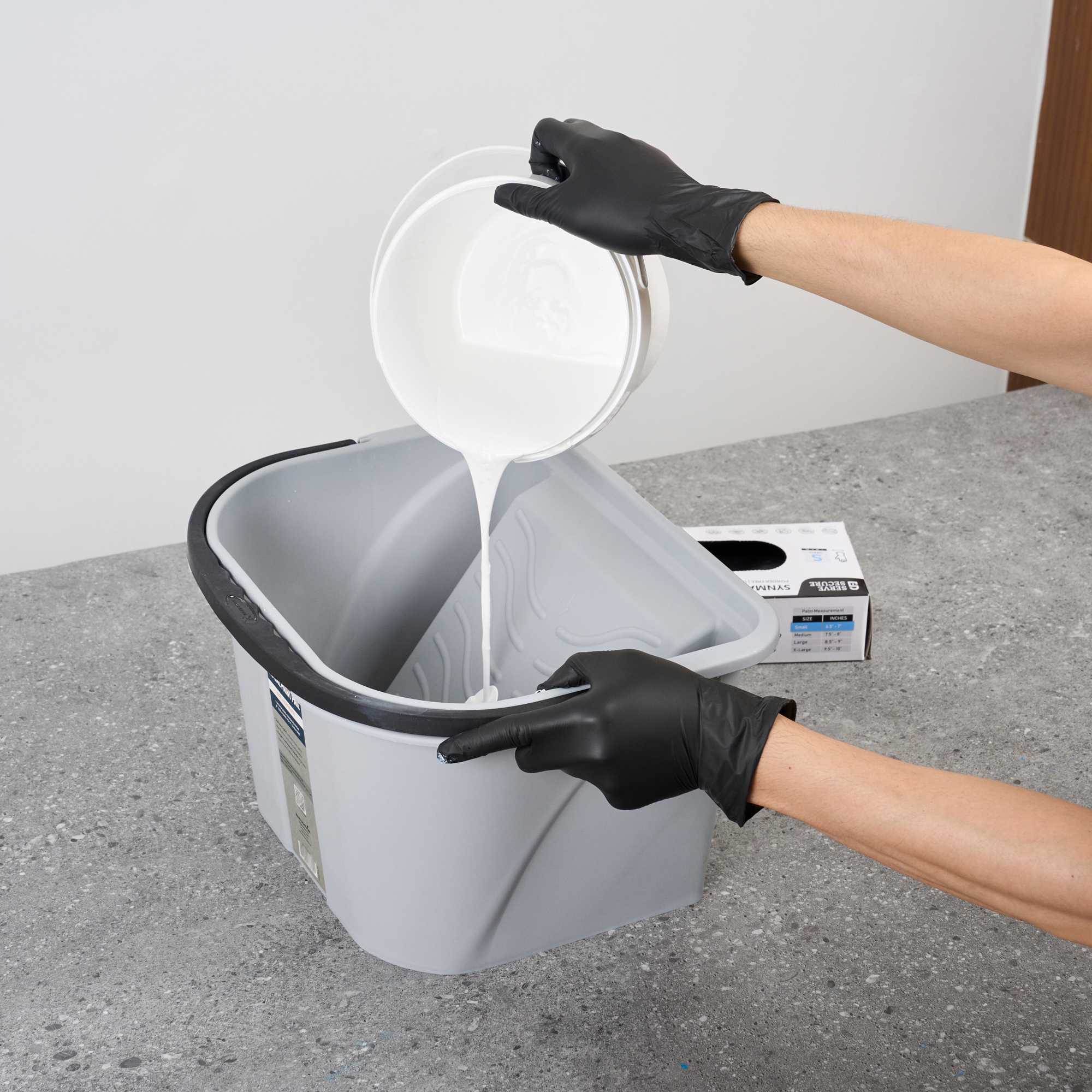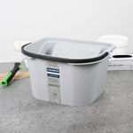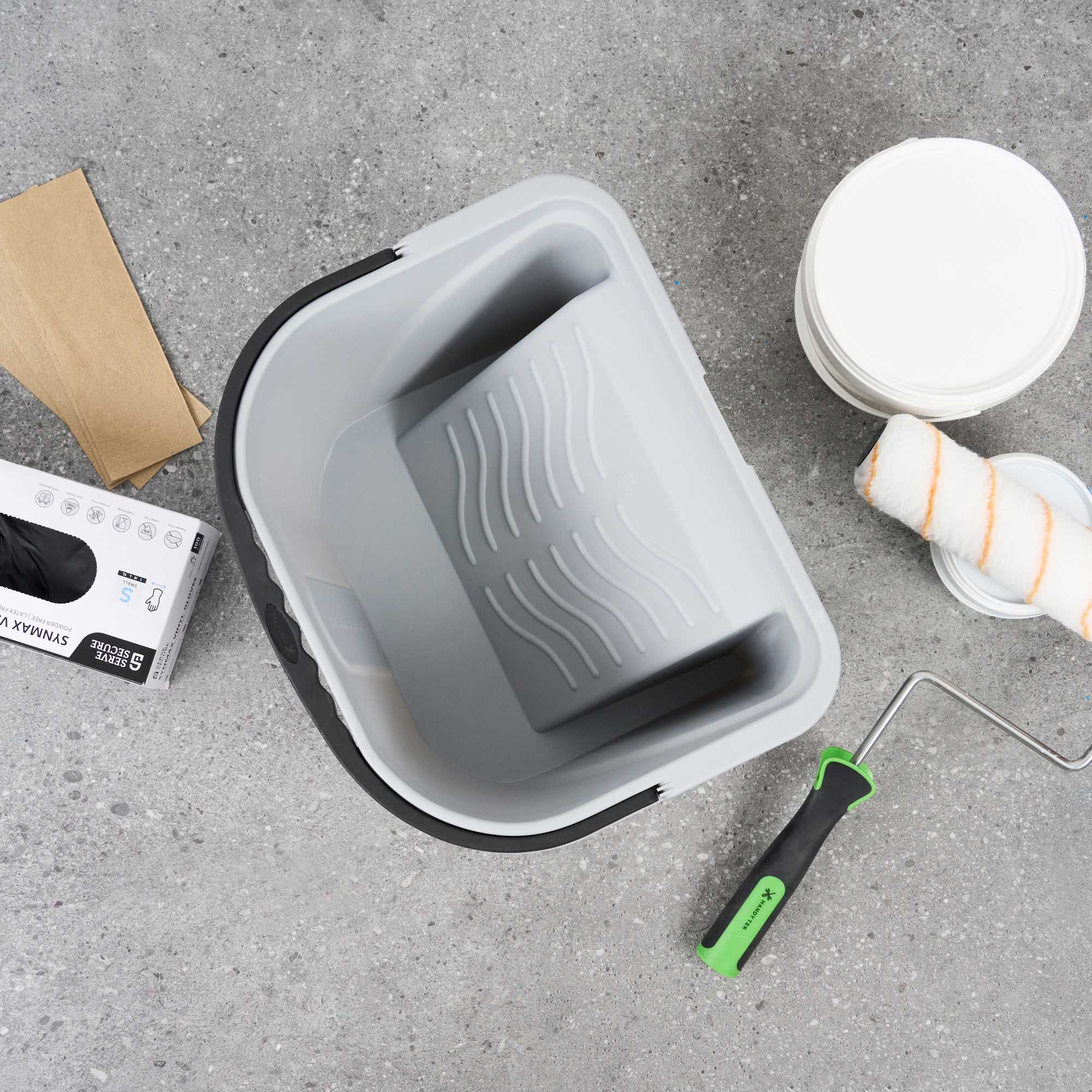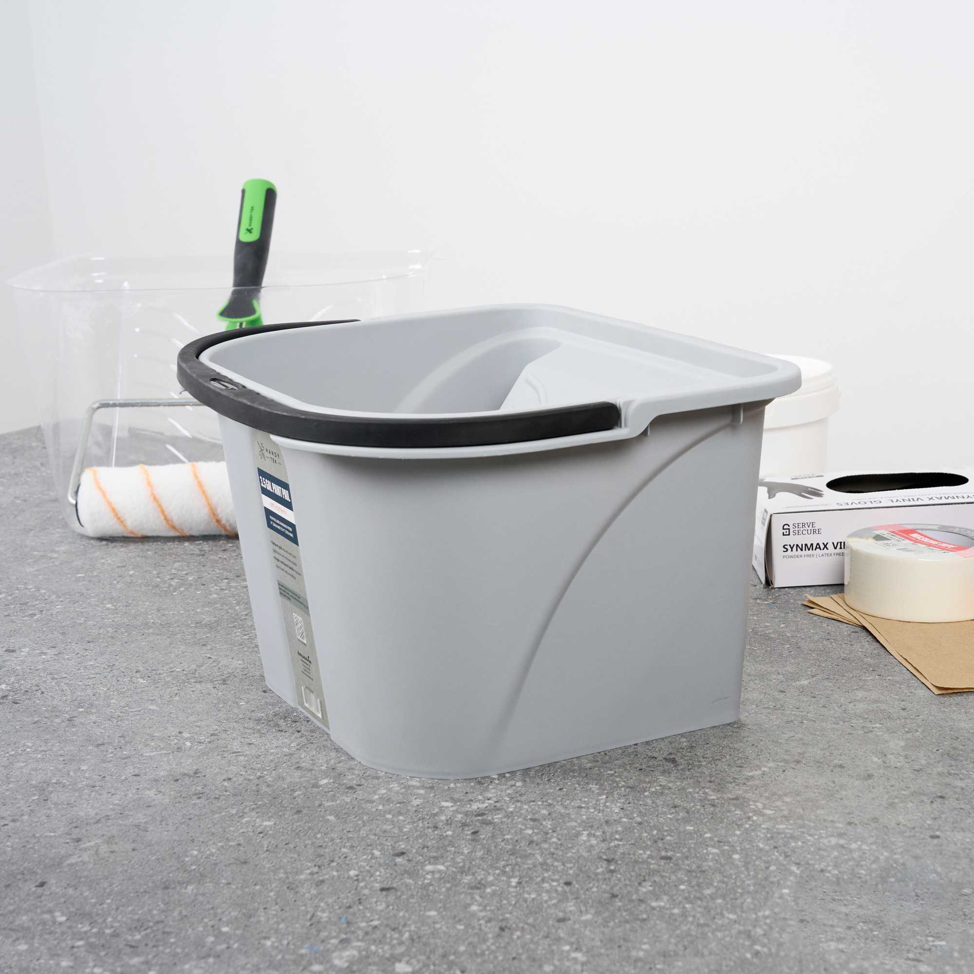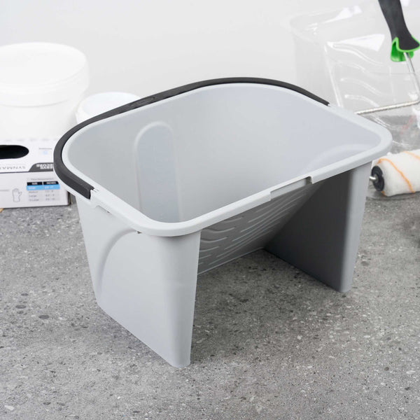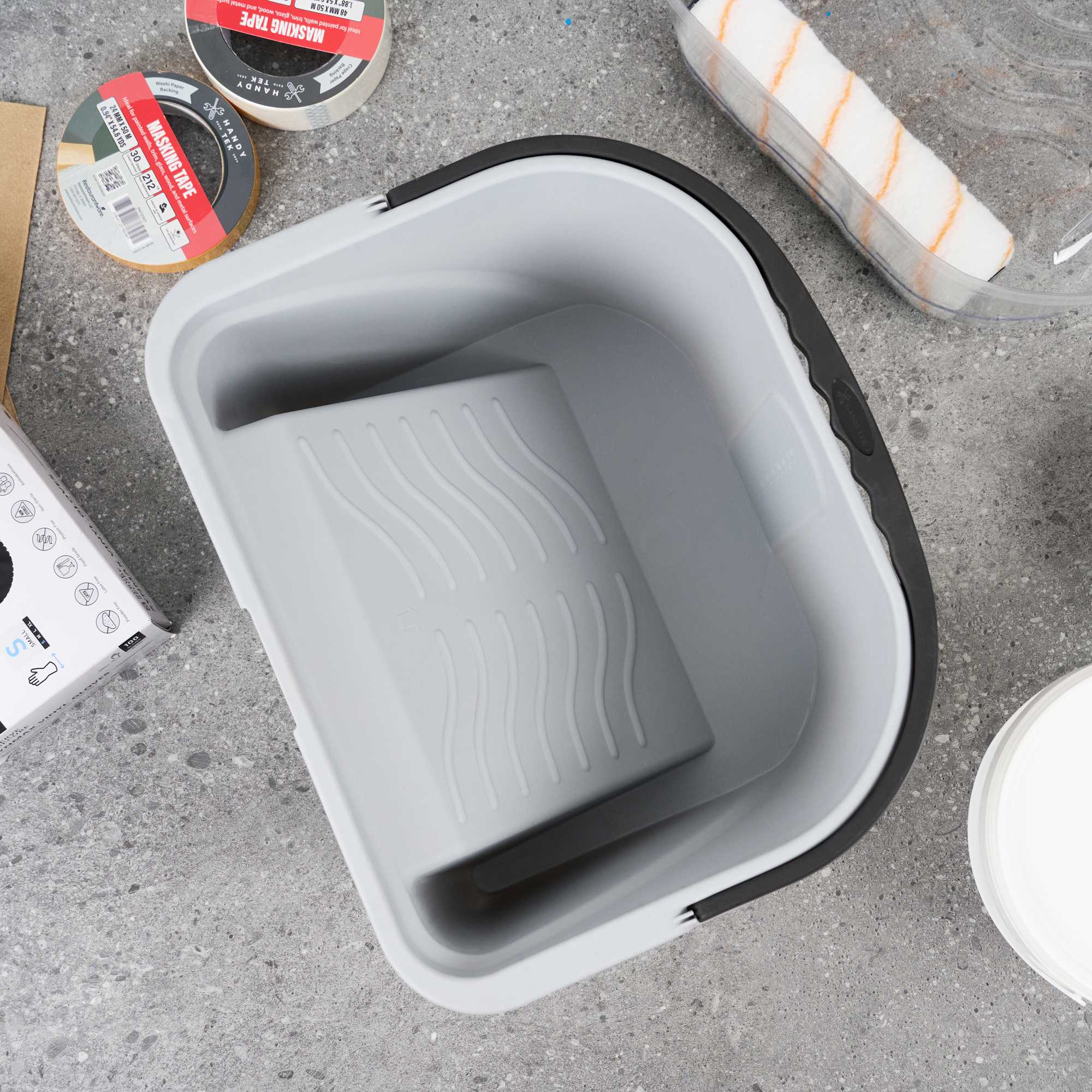 Elevate your painting experience with our Handy Tek 3.5-gallon Gray Plastic Paint Pail, designed to meet the demands of both experts and DIY enthusiasts. This durable painting bucket is crafted from strong plastic, ensuring it resists wear and remains easy to clean after every use. With a magnetic brush holder, this paint mixing pail securely keeps brushes in place, avoiding messes and ensuring they're always within reach. Pair this pail with our compatible Handy Tek's paint pail liner (SKU: RWT2143C) and lid (SKU: RWT2136G) for a smooth painting experience. With an ergonomic handle featuring finger contours, this paint mixing pail provides a comfortable grip, reducing hand strain and enhancing control during painting tasks. Measuring 15.83 inches in length by 12.8 inches in width by 9.06 inches in height, this paint container has a generous capacity of 14.47 quarts, making it an excellent choice for larger painting projects. Sold in a 1 count box.