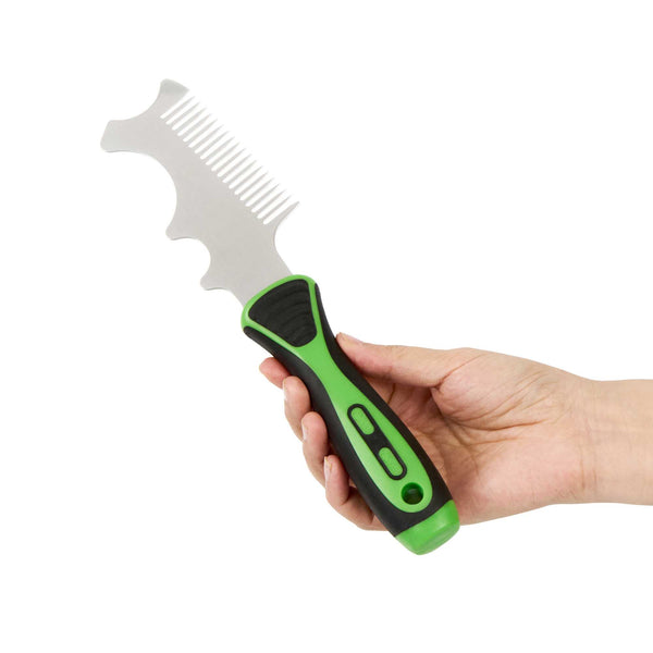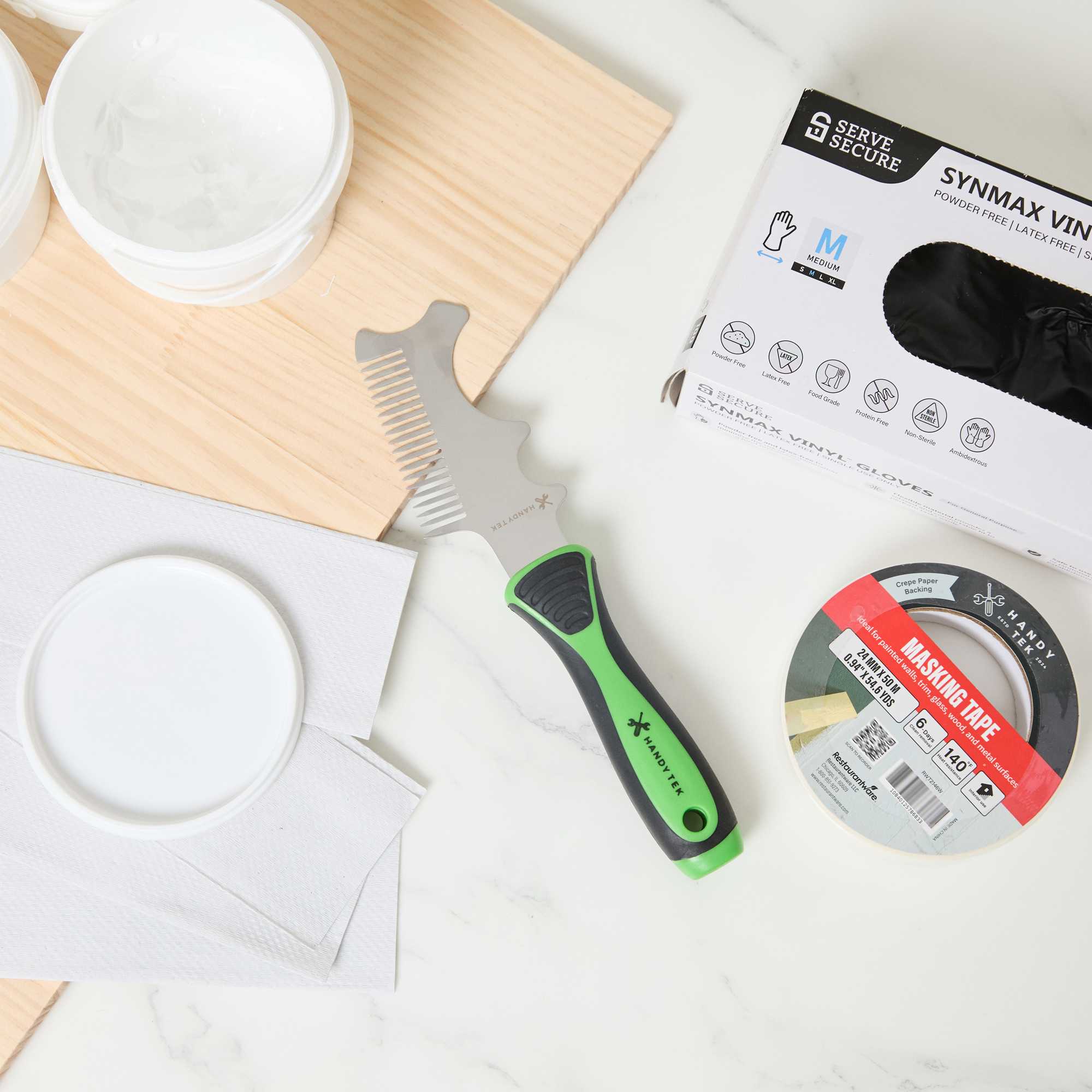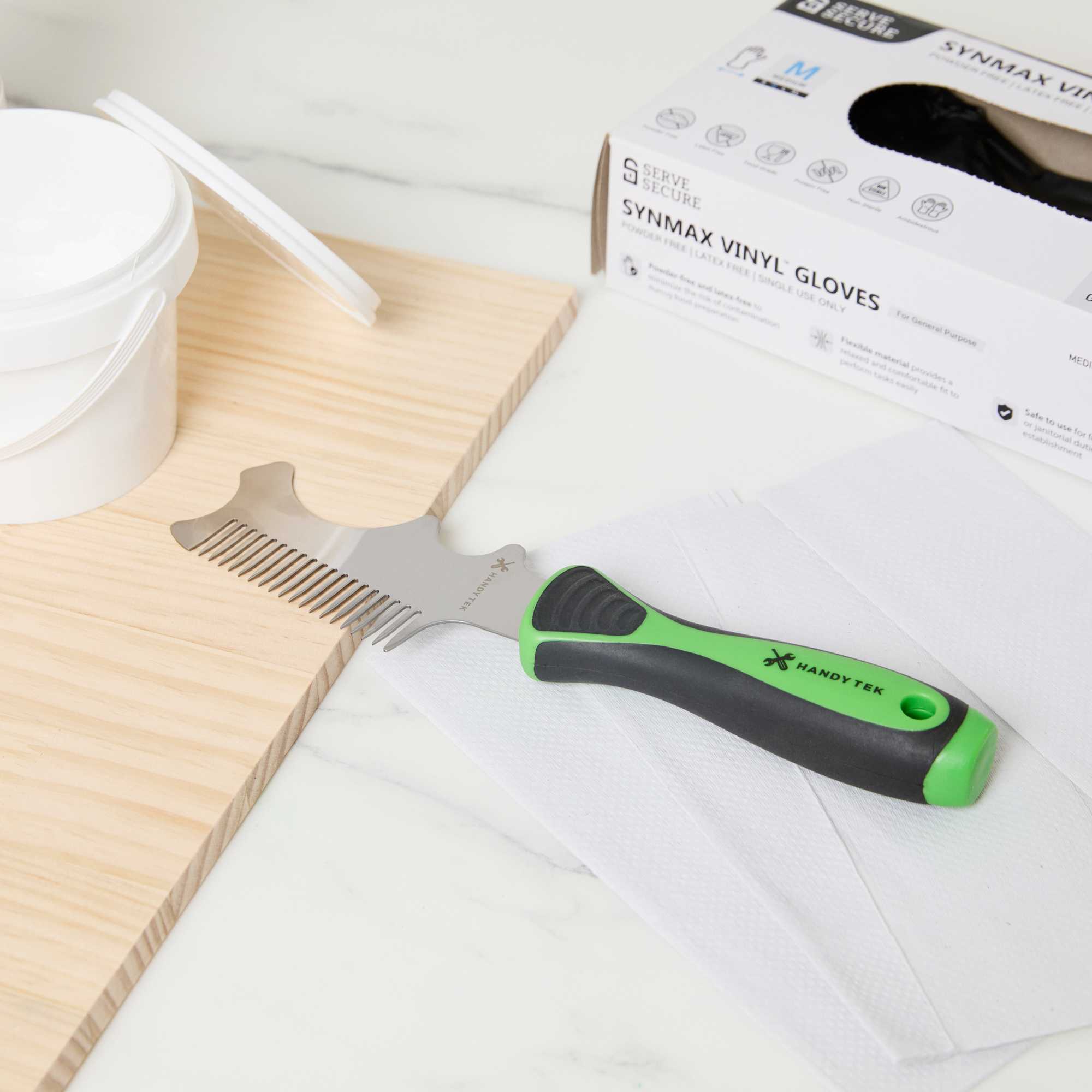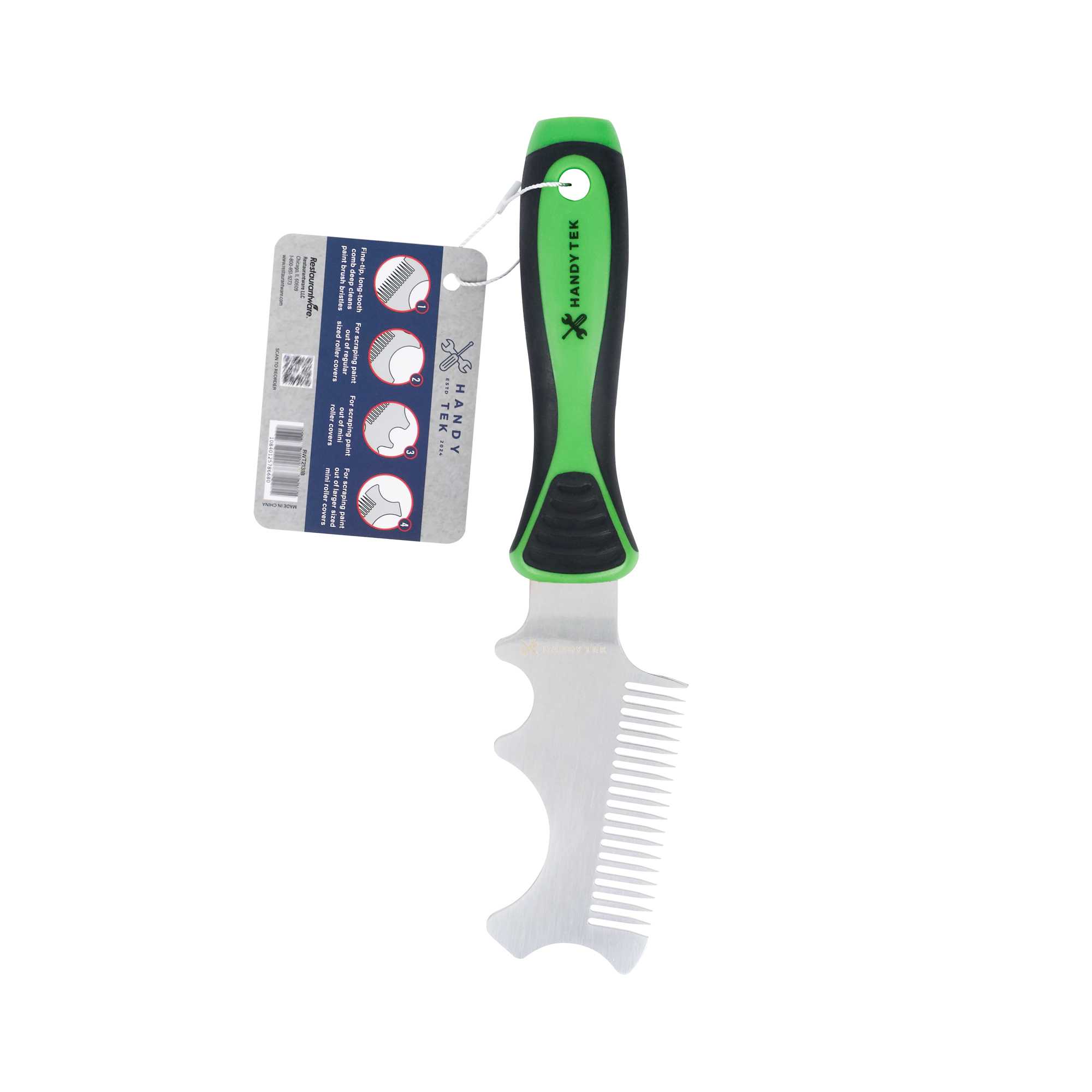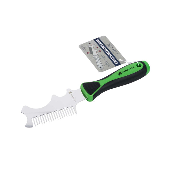 Optimize your painting projects with our Handy Tek 4-In-1 Painter's Multi-Tool. This versatile painter’s tool features a soft grip handle designed for comfort and control, with a textured thumb grip to reduce hand fatigue during extended use. Equipped with long metal teeth, this paint brush cleaning tool removes excess paint from brushes, ensuring quicker cleanup and extending brush life. The curved edges efficiently scrape paint from mini and regular-sized roller covers, minimizing waste and speeding up cleanup. With an integrated storage hole, this paint scraper tool offers easy hanging and convenient access. Measuring 6.3 inches in length by 2.36 inches in width by 1.18 inches in height, this paint knife is compact yet powerful. Sold in a 1 count box.
