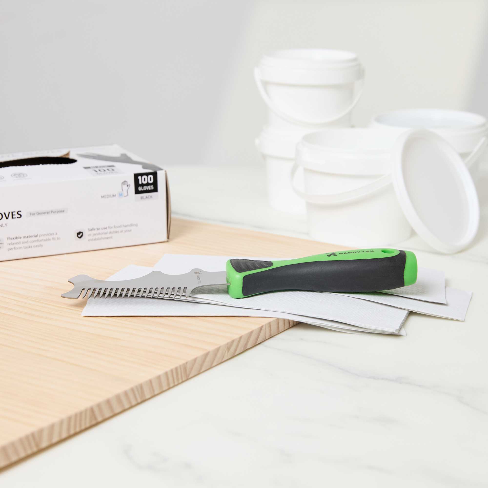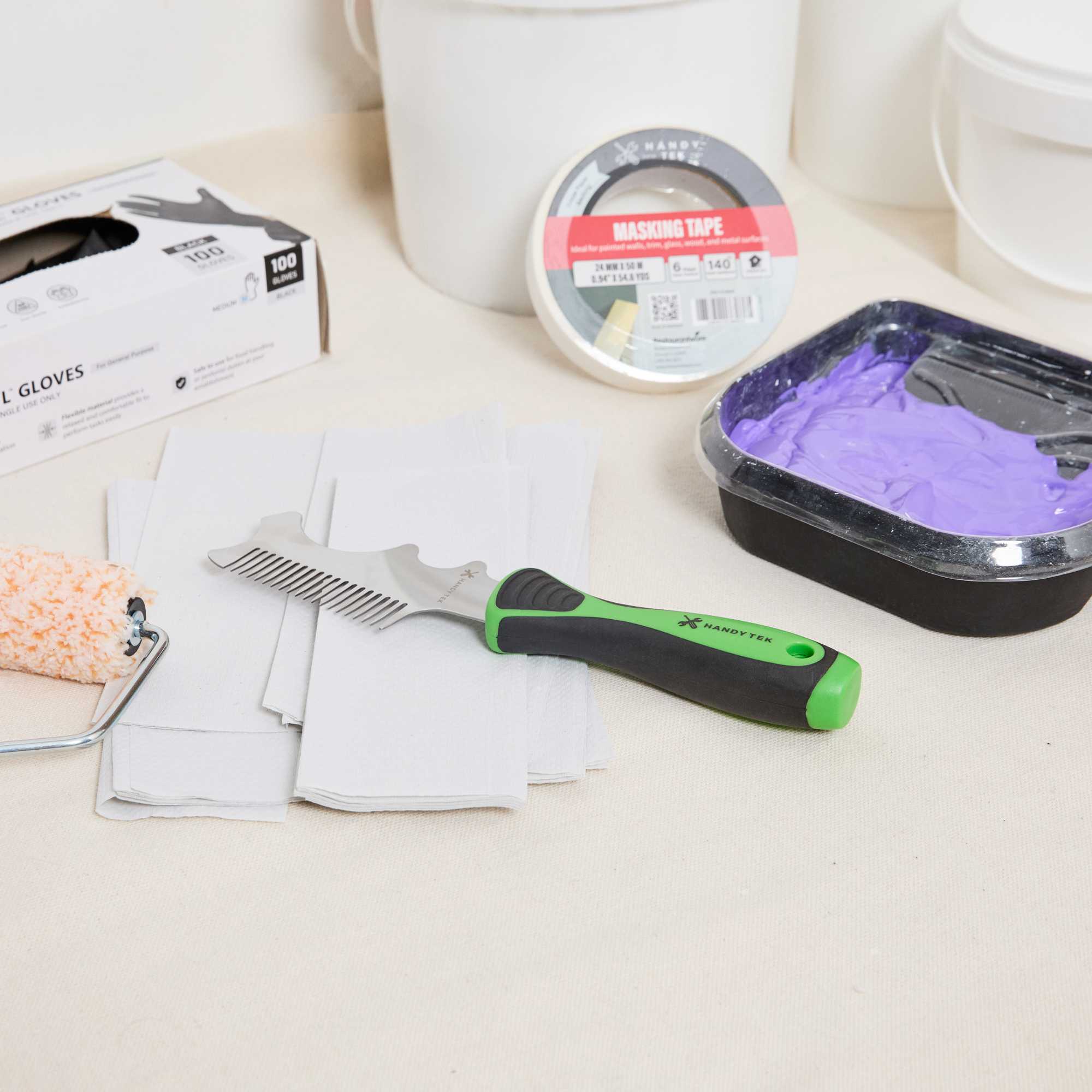 Optimize your painting projects with our Handy Tek 4-In-1 Painter's Multi-Tool. This versatile painter’s tool features a soft grip handle designed for comfort and control, with a textured thumb grip to reduce hand fatigue during extended use. Equipped with long metal teeth, this paint brush cleaning tool removes excess paint from brushes, ensuring quicker cleanup and extending brush life. The curved edges efficiently scrape paint from mini and regular-sized roller covers, minimizing waste and speeding up cleanup. With an integrated storage hole, this paint scraper tool offers easy hanging and convenient access. Measuring 6.3 inches in length by 2.36 inches in width by 1.18 inches in height, this paint knife is compact yet powerful. Sold in a 144 count box.