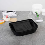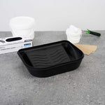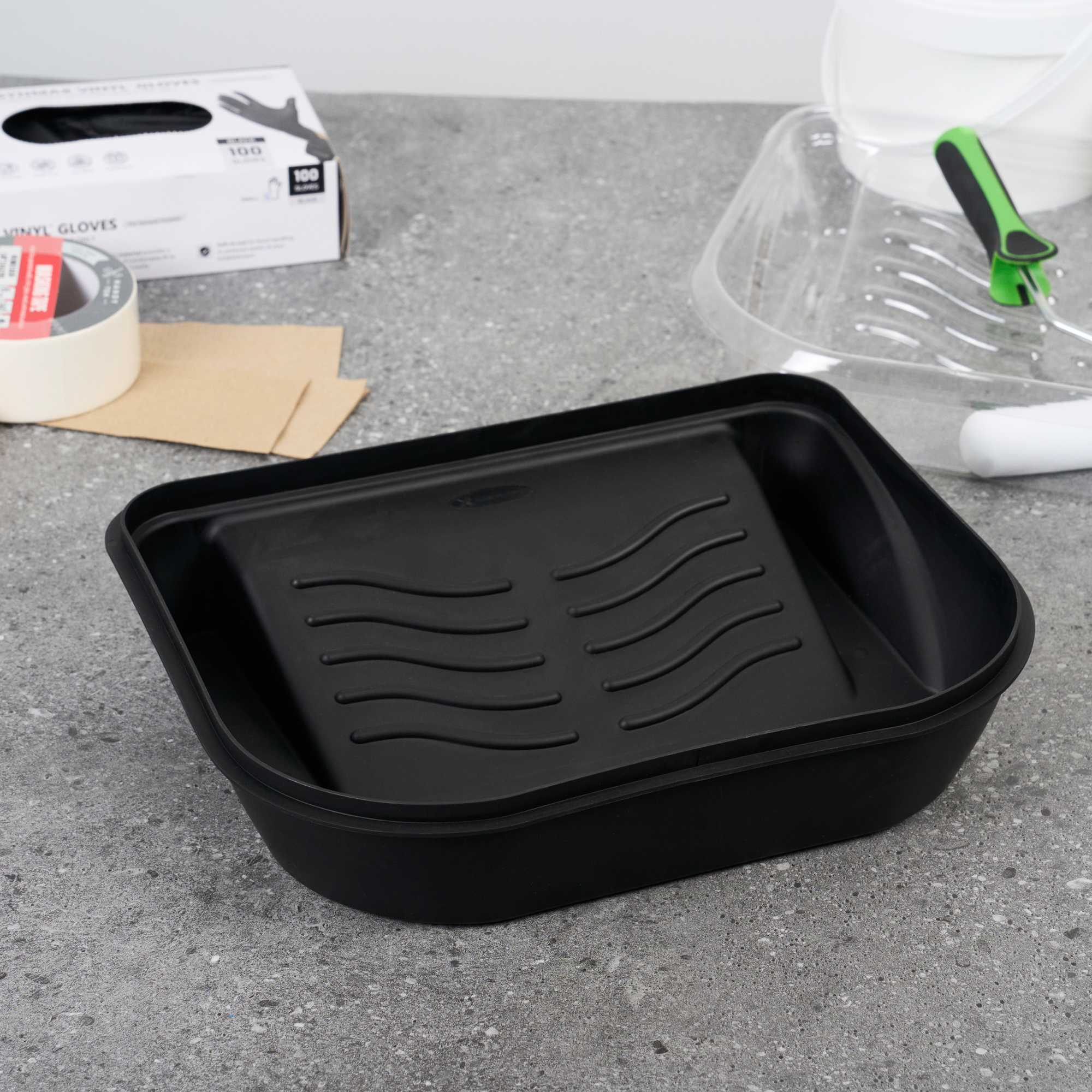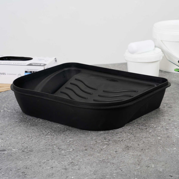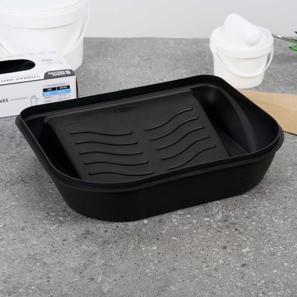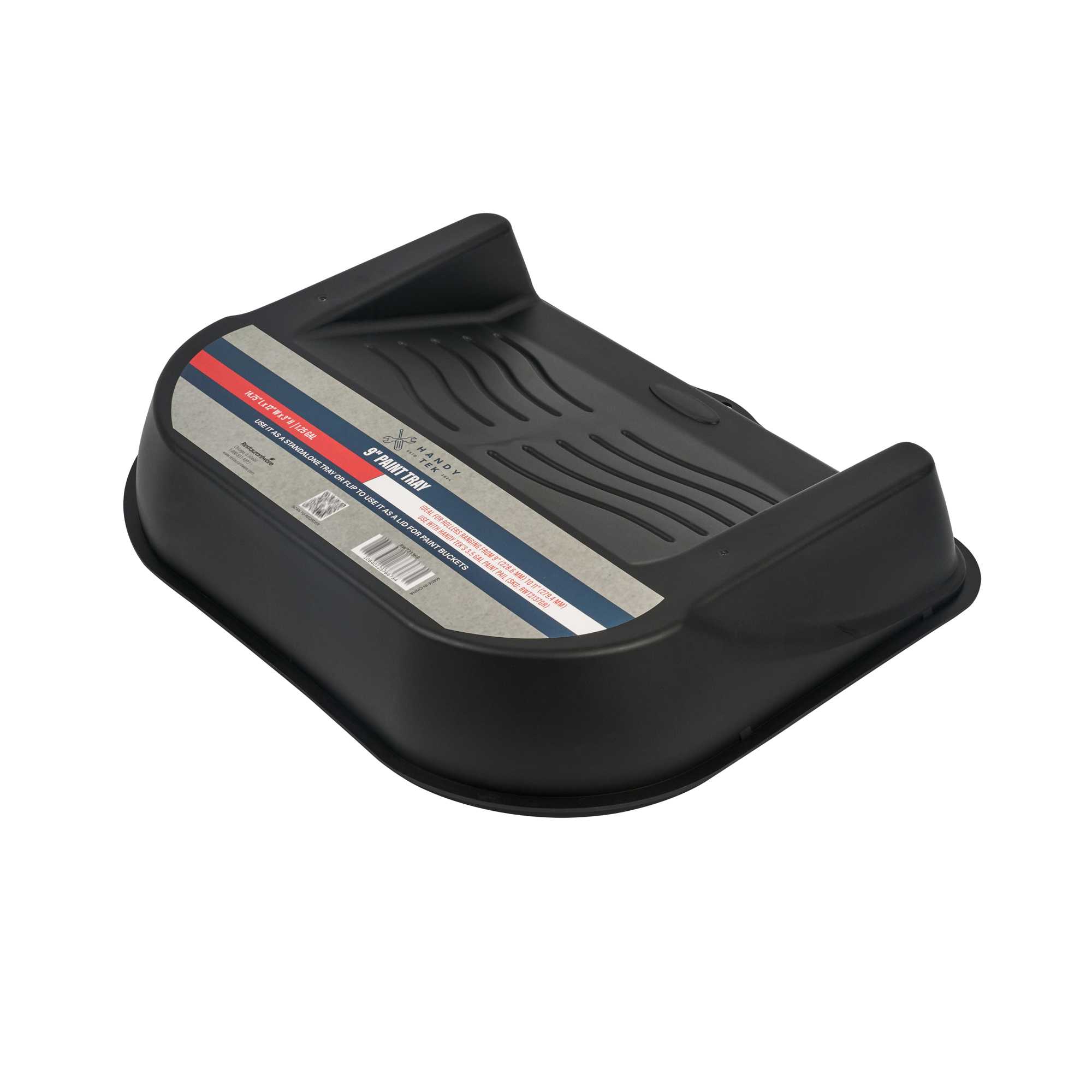Our Handy Tek 5-quart Black Plastic Paint Tray / Pail Lid is a must-have for any painting project, offering exceptional versatility and durability. Made from strong plastic, this paint tray lid withstands repeated use, making it a reliable choice for both expert and DIY painters. Designed as a dual-purpose tool, this black paint pail lid works as a convenient tray for rollers and brushes or flips over to cover your paint bucket and keep debris out. This paint bucket lid is specifically compatible with the Handy Tek Paint Bucket (SKU: RWT2137GR), ensuring a secure fit that prevents spills and keeps paint fresh between uses. Featuring a textured ribbed surface, this roller paint tray helps remove excess paint from rollers, ensuring a smooth and even application with every stroke. With a capacity of 5 quarts, this plastic paint tray measures 14.76 inches in length by 11.89 inches in width by 3.11 inches in height. Sold in a 24 count box.