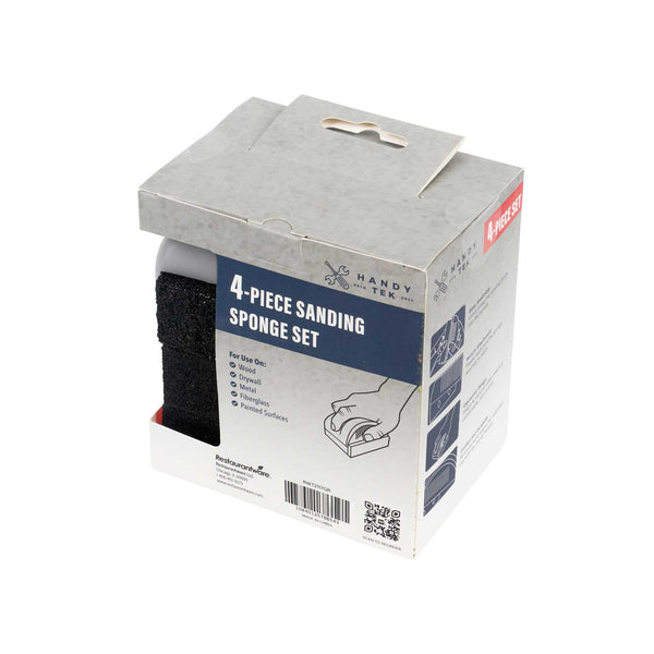 Elevate your sanding projects with our Handy Tek Assorted Grit Sanding Sponge Set, designed to deliver exceptional performance and precision. This complete 4-piece sanding kit features 60, 120, and 180 grit sanding sponges, along with a secure sanding block, providing everything needed for a smooth finish on various surfaces. Suitable for woodworking, drywall, metal, fiberglass, and paint preparation, these abrasive pads tackle rough surfaces with ease. The flat edges on these sanding sponges ensure even sanding along edges and corners, removing uneven spots. These hand sanding blocks reduce hand fatigue and provide better control during extended sessions with their textured, semicircular grip. Built-in plastic teeth on the sanding block firmly hold the sponge in place, ensuring stability and long-term usability. Measuring 4.13 inches in length by 2.87 inches in width by 4.53 inches in height, this sponge set is compact and easy to handle. Sold in a 1 count box.