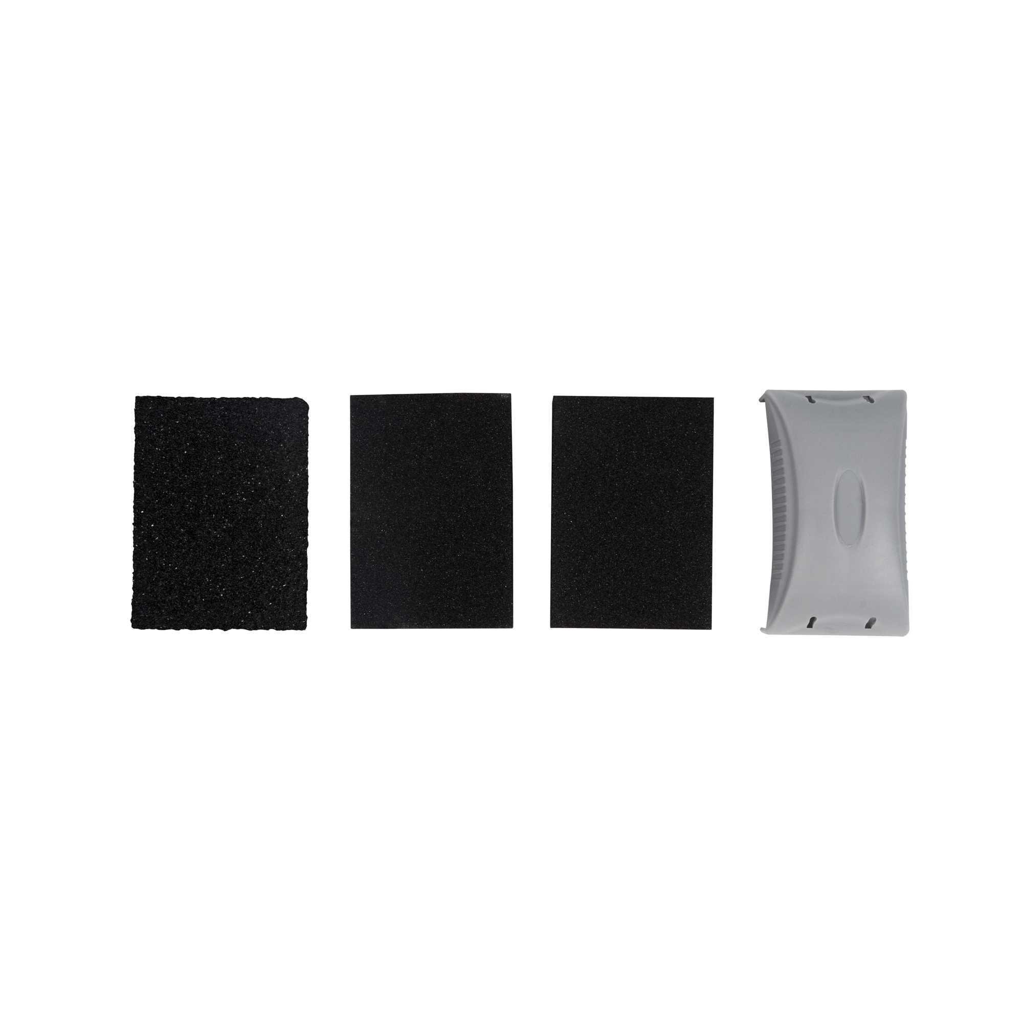 Elevate your sanding projects with our Handy Tek Assorted Grit Sanding Sponge Set, designed to deliver exceptional performance and precision. This complete 4-piece sanding kit features 60, 120, and 180 grit sanding sponges, along with a secure sanding block, providing everything needed for a smooth finish on various surfaces. Suitable for woodworking, drywall, metal, fiberglass, and paint preparation, these abrasive pads tackle rough surfaces with ease. The flat edges on these sanding sponges ensure even sanding along edges and corners, removing uneven spots. These hand sanding blocks reduce hand fatigue and provide better control during extended sessions with their textured, semicircular grip. Built-in plastic teeth on the sanding block firmly hold the sponge in place, ensuring stability and long-term usability. Measuring 4.13 inches in length by 2.87 inches in width by 4.53 inches in height, this sponge set is compact and easy to handle. Sold in a 6 count box.