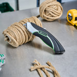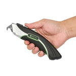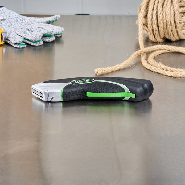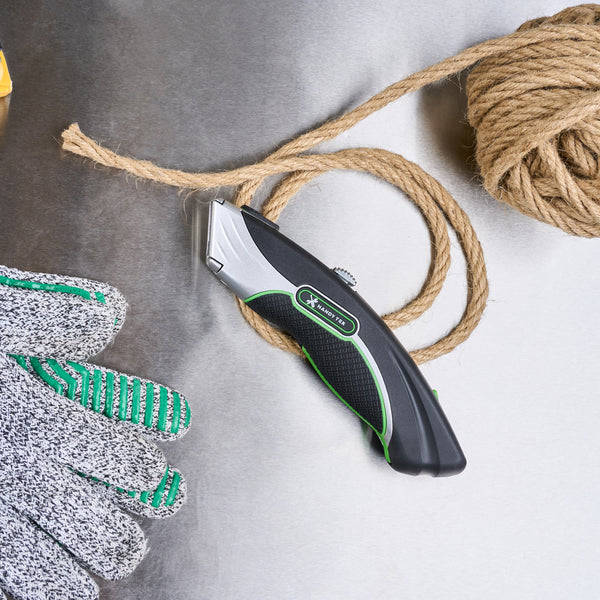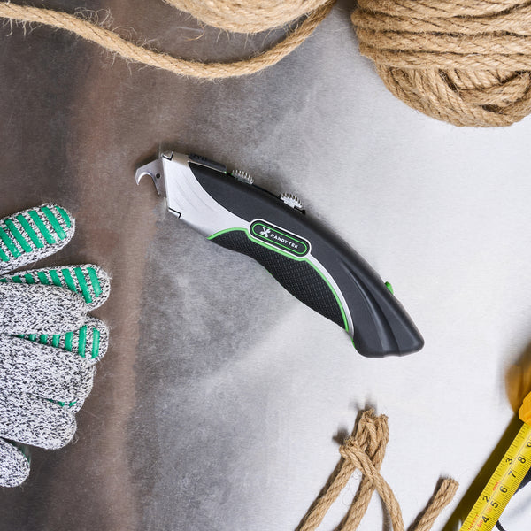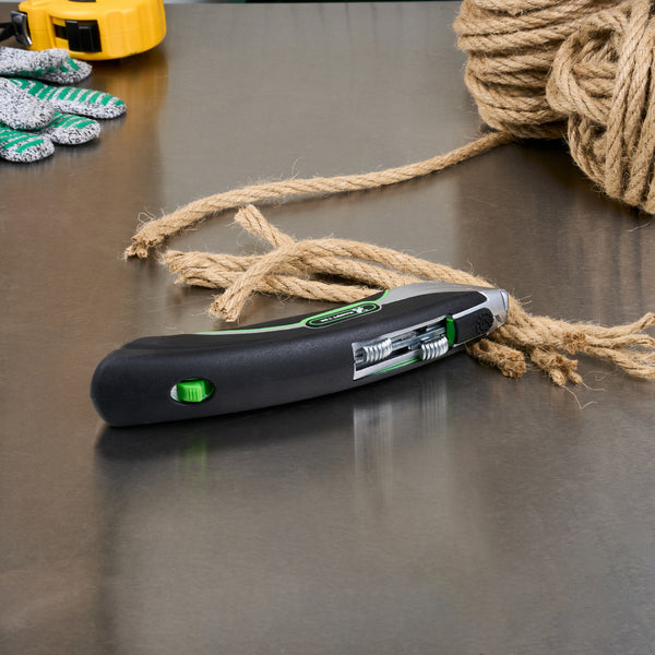Optimize your cutting tasks with our Handy Tek Black Dual Blade Utility Knives. These heavy-duty knives feature a quick change mechanism, making blade replacement swift and hassle-free. Equipped with a dual-blade system, these cutting knives accommodate trapezoid and hook blades for versatile use. The secure blade compartment of these box cutters provides a convenient storage solution for accommodating the included extra blades. With an ergonomic handle, these sharp knives give a firm and secure grip, perfect for extended use without fatigue. Crafted from high-carbon steel, these utility knives deliver exceptional sharpness and outstanding edge retention. These retractable utility knives offer 4 adjustable blade positions for versatile cutting needs. With a retractable design, these dual-blade cutting knives allow the blade to be safely tucked away inside the handle when not in use. The heavy-duty design makes these dual-blade knives perfect for cutting through tough insulation, rubber, and thick plastic. Featuring a convenient slider, these heavy-duty cutting knives allow you to extend or retract the blade, offering precise control over the blade length for various tasks. Each black utility knife has a durable zinc housing that does not break easily for long-lasting performance. These black cutting knives' TPR and PP over-molding grip provide a non-slip hold, enhancing precision and safety during use. Measuring 7 inches in length, these sharp utility knives feature a 19-millimeter wide blade, providing precise cutting performance for various tasks. Sold in 6 boxes with 6 knives, 12 trapezoid blades, and 12 hook blades.