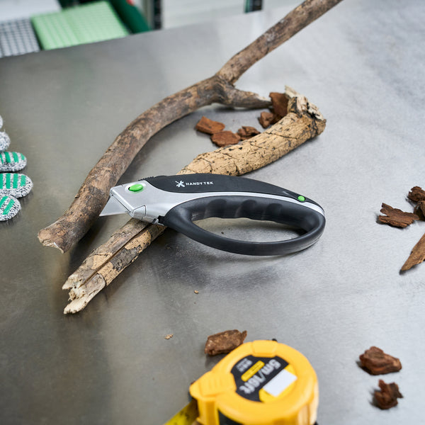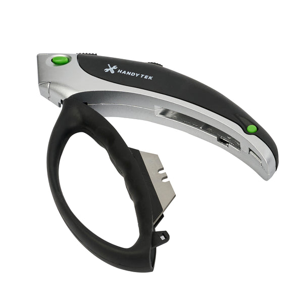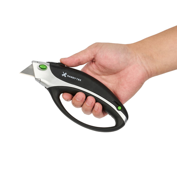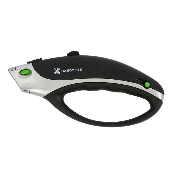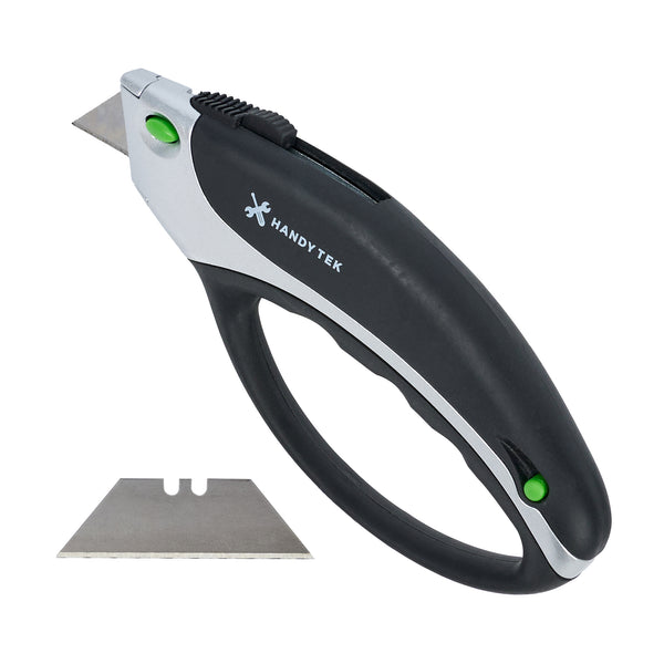 Enhance your cutting tasks with our Handy Tek Black Safety Utility Knife. Equipped with a quick-change mechanism, this utility knife enables rapid and effortless blade replacements, ensuring maximum efficiency and convenience. The unique handle bow design of this box cutter offers added protection, shielding your hands from potential injuries. Designed with high-carbon steel blades, this heavy-duty knife provides superior sharpness and exceptional edge retention. The premium zinc housing of this ultra-sharp utility knife withstands frequent use for optimal performance. With a heavy-duty design, this razor-sharp utility knife delivers excellent durability and cutting performance. This retractable knife features a 4-position locking design and retracts the blade safely when not used. The soft TPR grip of this cutting knife ensures a secure, non-slip experience, enhancing comfort and control while in use. For additional convenience, this sharp knife comes with a storage compartment for accommodating the included 4 blades. Measuring 6.73 inches in length, this black utility knife has a 19-millimeter-wide blade and is highly functional for any job. Sold in 1 box with 1 knife and 4 blades.