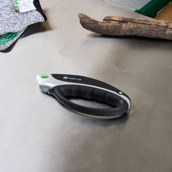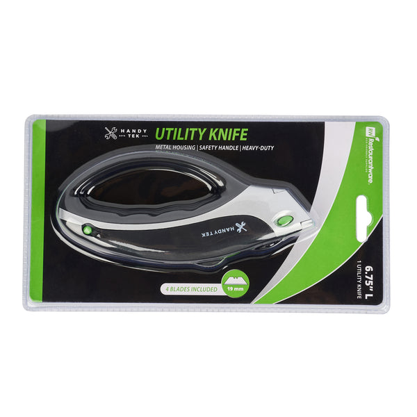 Enhance your cutting tasks with our Handy Tek Black Safety Utility Knives. Equipped with a quick-change mechanism, these utility knives enable rapid and effortless blade replacements, ensuring maximum efficiency and convenience. The unique handle bow design of these box cutters offers added protection, shielding your hands from potential injuries. Designed with high-carbon steel blades, these heavy-duty knives provide superior sharpness and exceptional edge retention. The premium zinc housing of these ultra-sharp utility knives withstands frequent use for optimal performance. With a heavy-duty design, these razor-sharp utility knives deliver excellent durability and cutting performance. These retractable knives feature a 4-position locking design and retract the blade safely when not used. The soft TPR grip of these cutting knives ensures a secure, non-slip experience, enhancing comfort and control while in use. For additional convenience, these sharp knives come with a storage compartment for accommodating the included 4 blades. Measuring 6.73 inches in length, these black utility knives have a 19-millimeter-wide blade and are highly functional for any job. Sold in 6 boxes with 6 knives and 24 blades.