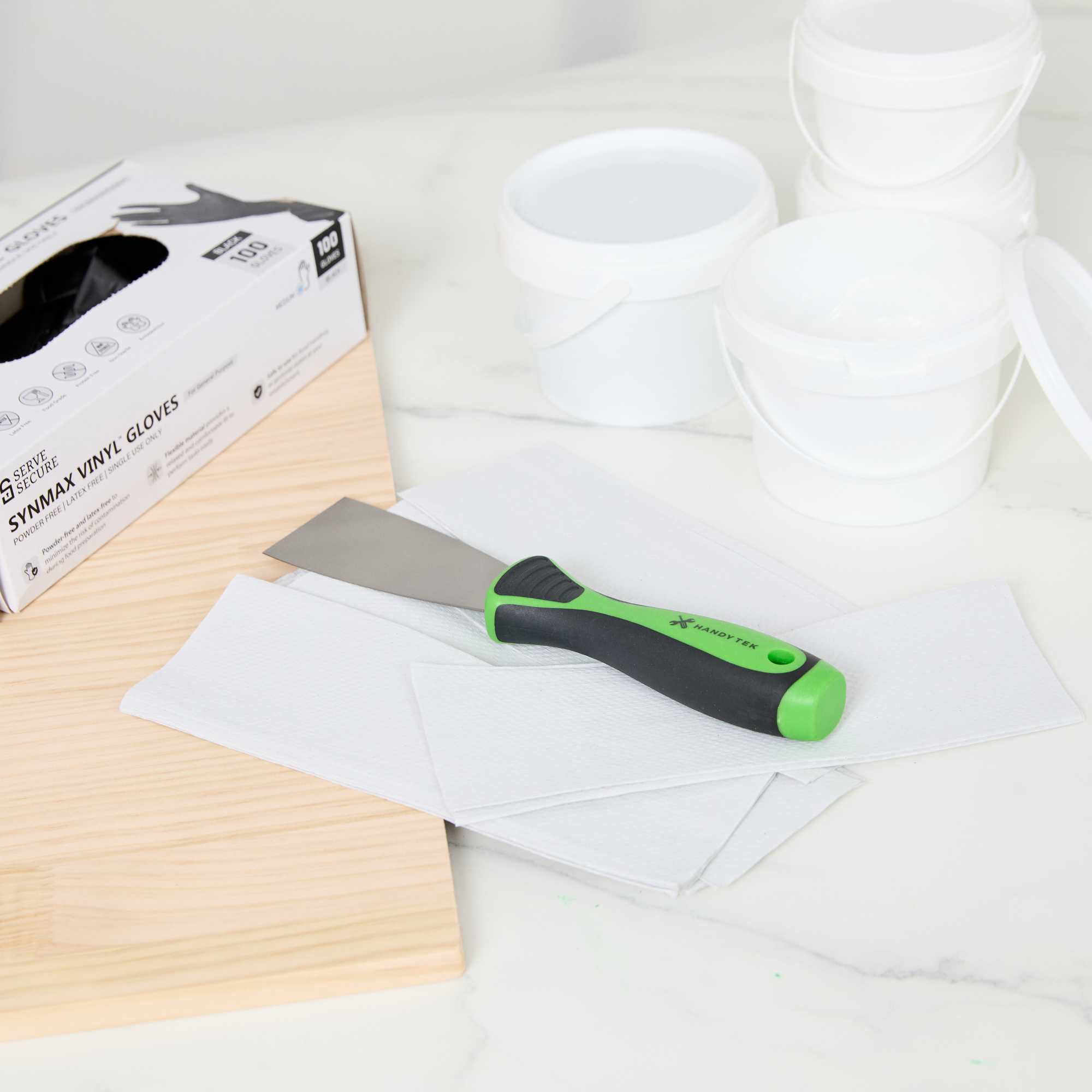 Ensure flawless repairs with our Handy Tek Carbon Steel Putty Knife, ideal for every demanding job. Made from carbon steel, this putty knife is designed to withstand heavy pressure without bending or breaking, ensuring long-lasting durability for all your repair needs. This flexible blade allows smooth spreading of putty and fillers, ensuring an even finish on any surface. With a soft grip handle, this spackling knife provides ergonomic comfort and control, reducing hand fatigue during extended use. The sharpened, tapered blade edge of this wall repair knife enables precision work, allowing for smooth application of putty, spackle, and joint compound, making it the best choice for seamless wall repairs. Measuring 9.25 inches in length by 1.97 inches in width by 1.18 inches in height, this filling blade is perfectly sized for a variety of tasks. Sold in a 144 count box.