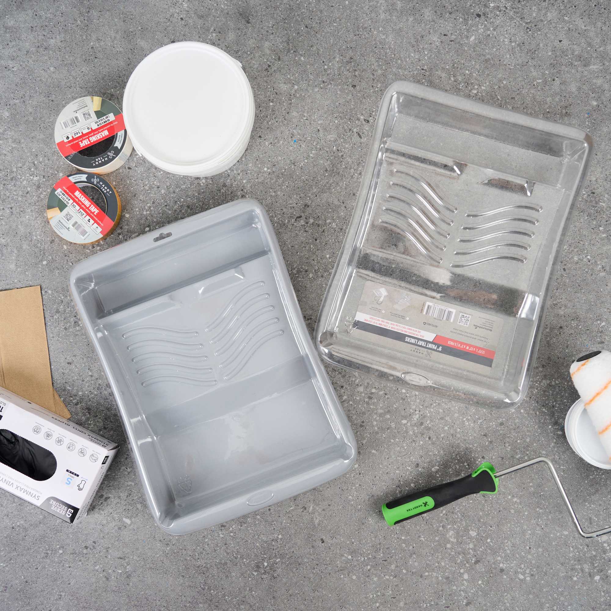 Make painting projects easier, cleaner, and more efficient with our Handy Tek Clear Plastic Paint Tray Liners. These painting tray inserts are designed to fit snugly into our Handy Tek paint tray (SKU: RWT2133GR), preventing slipping or shifting during use. Plastic tray liners like these are great for small-area applications such as trim, edges, and touch-ups. Made from tear-resistant material, these paint tray liners securely hold paint without leaking or tearing, even during heavy use. For added convenience, these paint liners are disposable, making cleanup a breeze and reducing mess on every project. Each paint roller tray liner has a capacity of 6.28 quarts and measures 17.8 inches in length by 12.99 inches in width by 2.95 inches in height. Sold in a 60 count box.