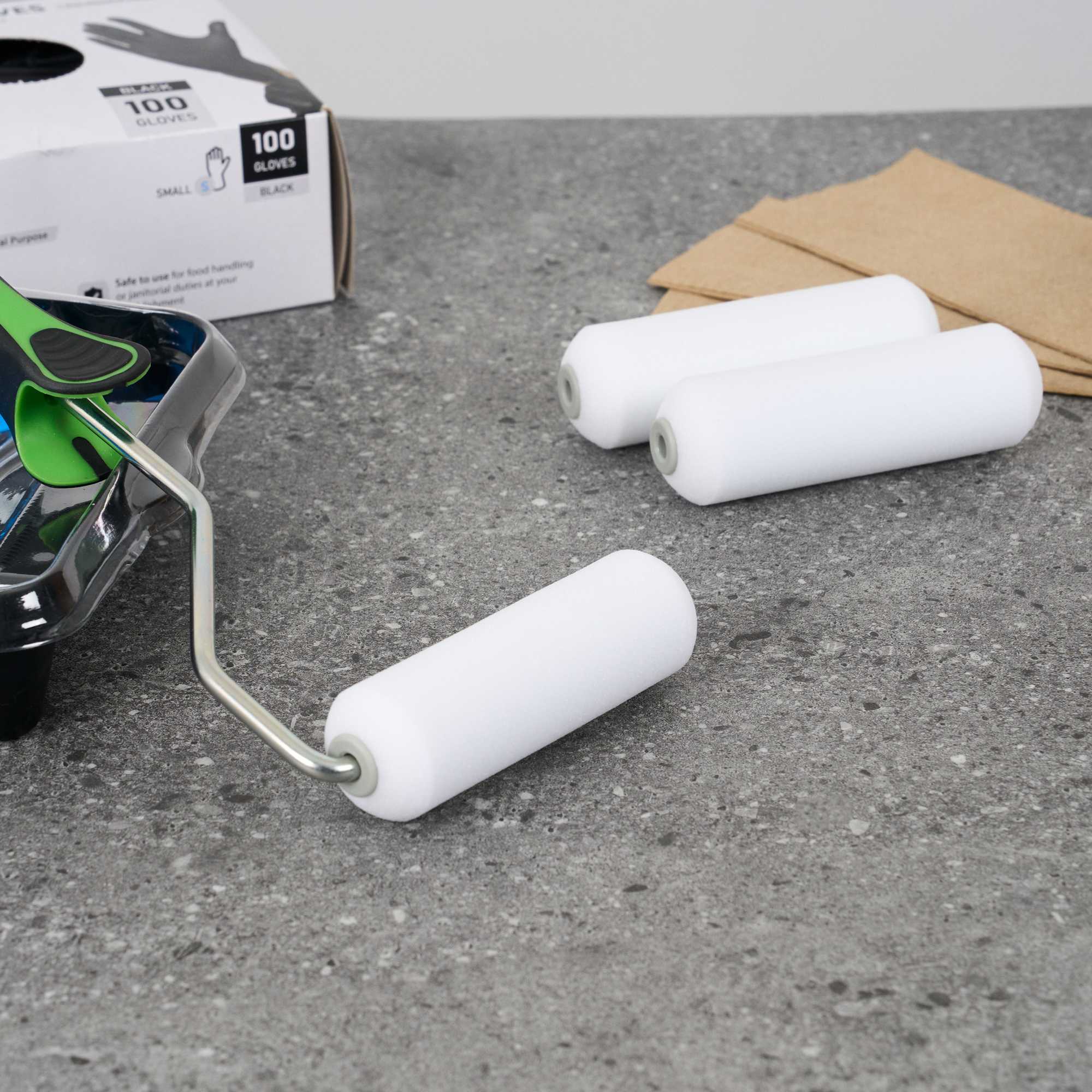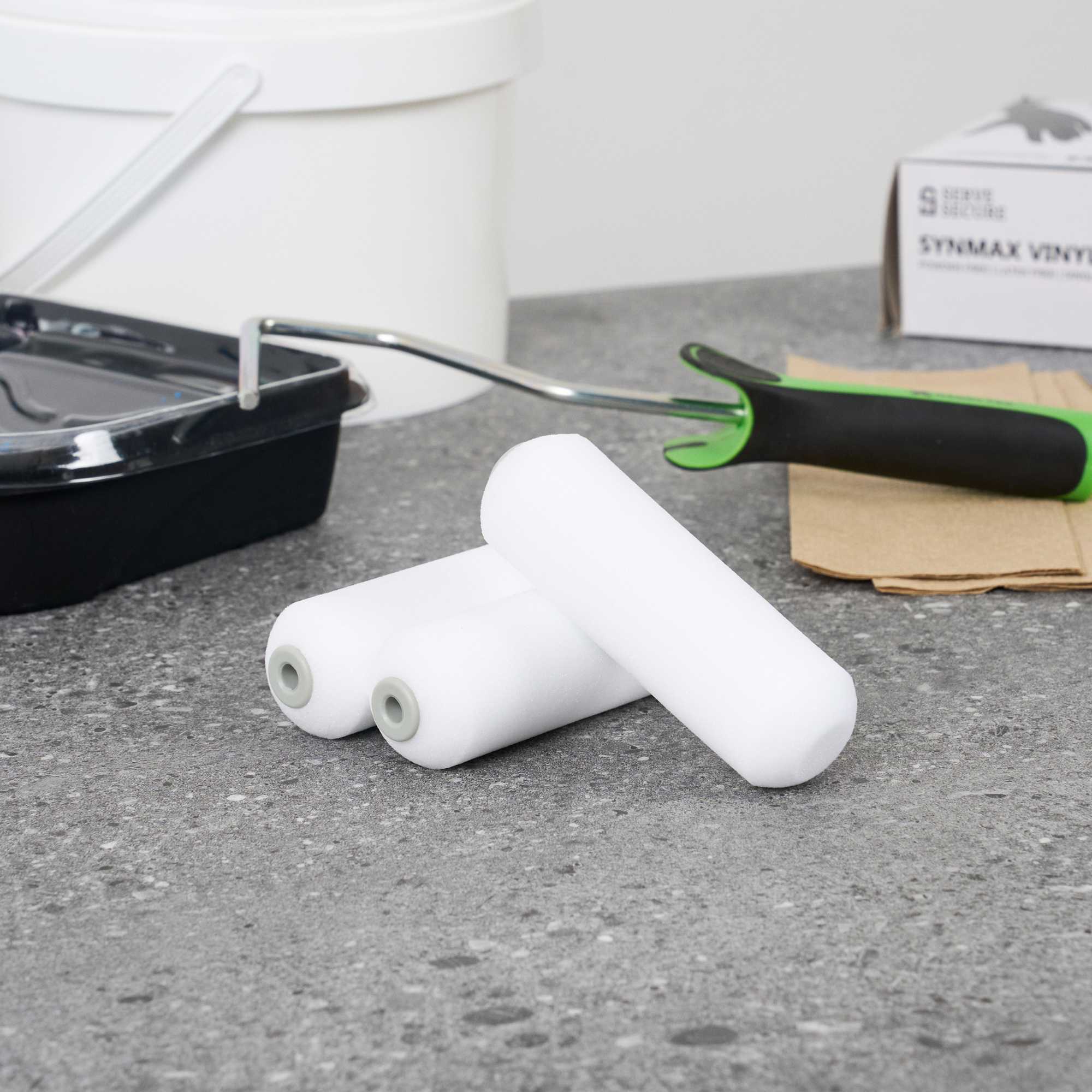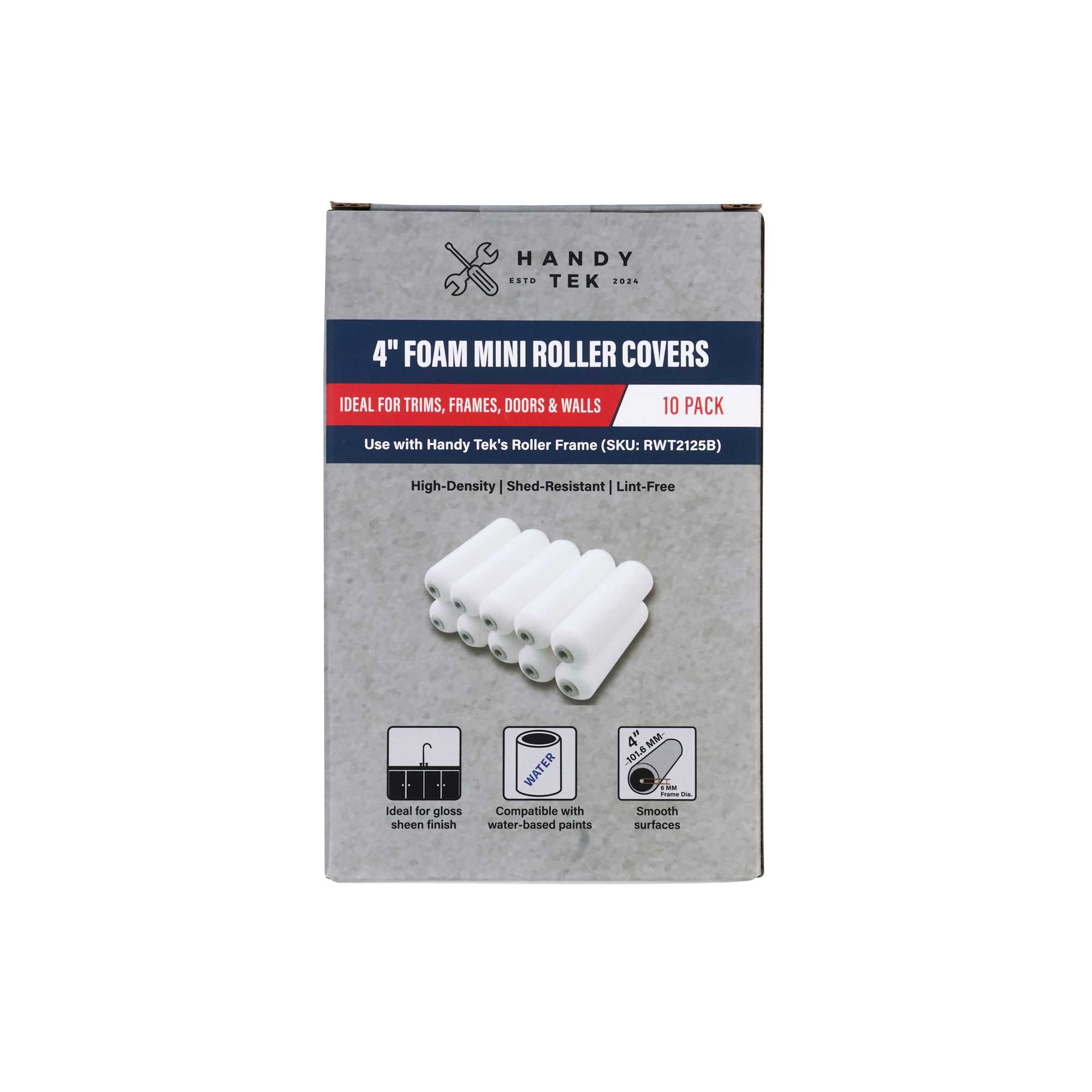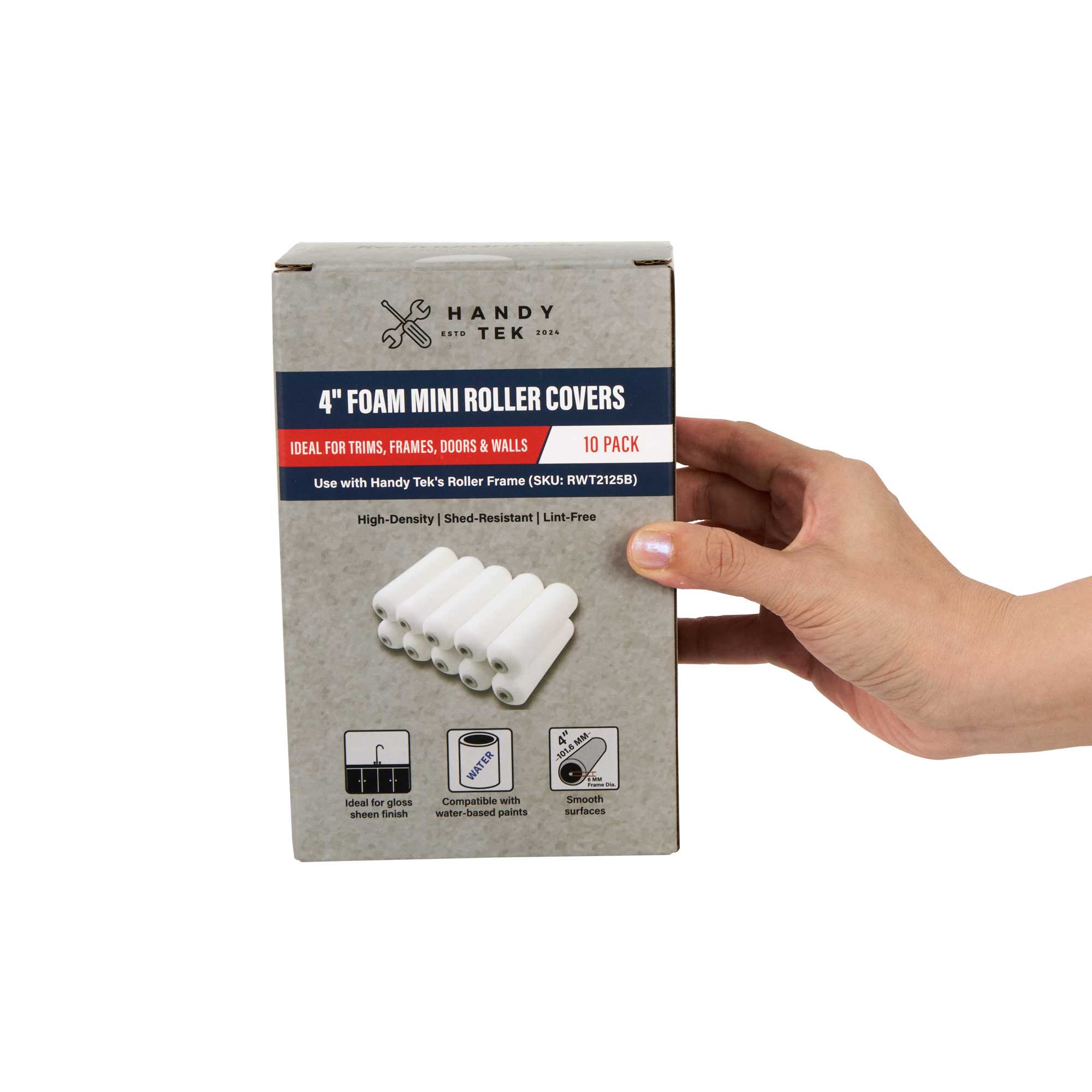 Achieve a smooth, even finish on any surface using our Handy Tek Foam Mini Roller Covers. High-density foam roller covers deliver a spray-like finish with minimal bubbles, ideal for high-gloss and semi-gloss paints. A lint-free, shed-resistant design ensures each foam roller cover applies cleanly without imperfections. Thermo-bonded design helps the paint roller cover maintain shape and consistent performance. Pair the foam paint roller cover with our roller frame (SKU: RWT2125B) for quick and secure setup. Absorbent roller sheaths hold more paint to reduce streaks and cut down on touch-ups. Solvent-resistant wall paint roller covers work with both oil- and water-based paints for added versatility. Perfect for trims, frames, doors, and walls, each foam applicator cover offers reliable precision. Measuring 4.33 inches in length by 1.34 inches in width by 1.34 inches in height, each paint roller cover is compact and efficient. Sold in a 10 count box.