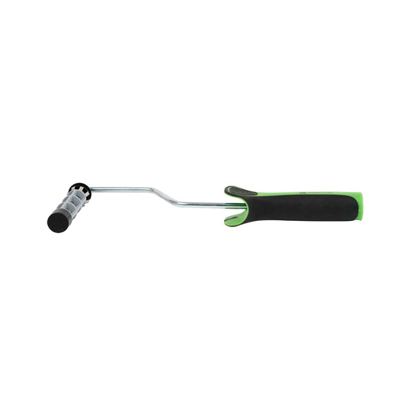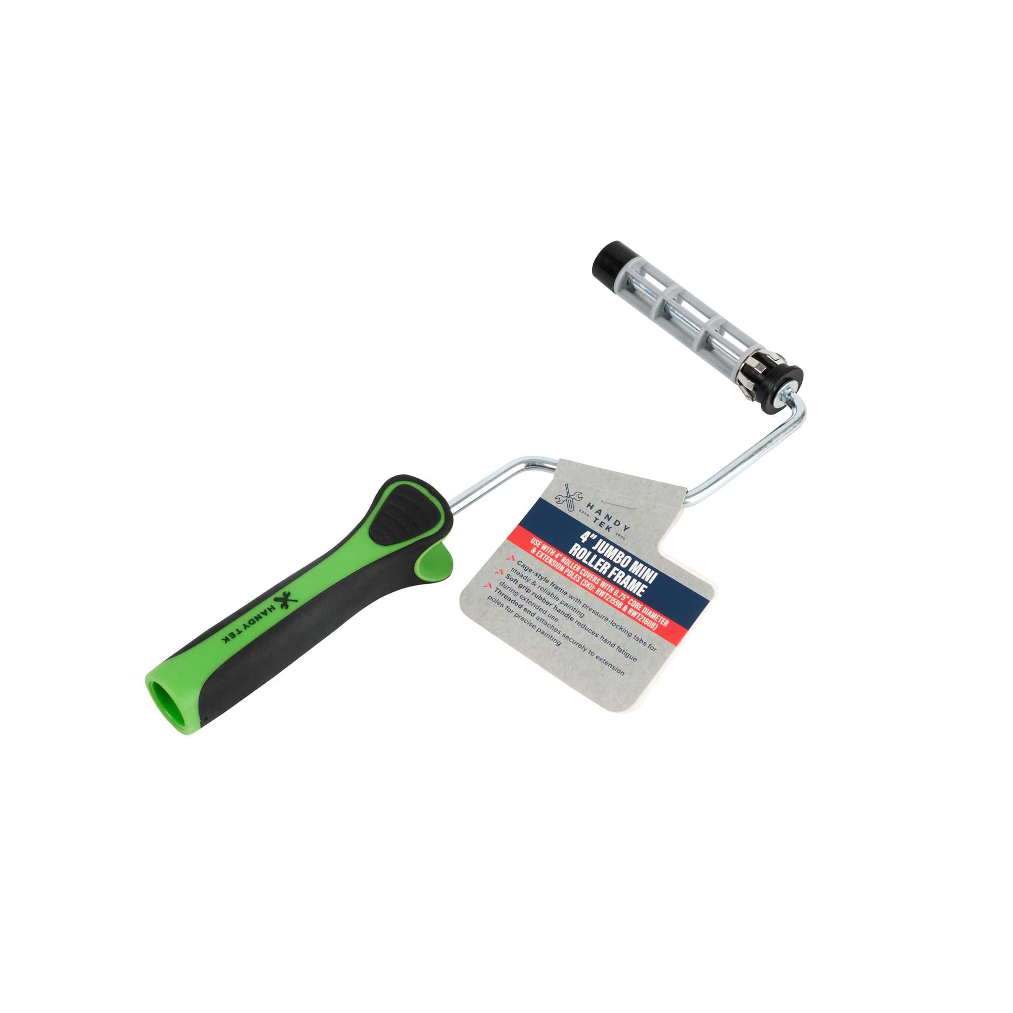 Transform your painting experience with our Handy Tek Jumbo Mini Roller Frame. This durable roller frame features a plastic cage that securely holds roller covers in place, ensuring stability and smooth rotation for flawless paint application. Pair this handy coating tool frame with 4-inch roller covers featuring a 0.75-inch core diameter for controlled application. Its threaded end securely attaches to a compatible extension pole, enabling effortless coverage across walls, ceilings, and hard-to-reach areas. The metal flanges on this paint handle frame reduce friction and enhance rolling efficiency, allowing the roller to glide smoothly across surfaces. Designed with an ergonomic rubber grip, this painting roller frame offers a soft, slip-resistant handle and a textured thumb area, providing comfort and control while minimizing hand fatigue during extended use. This roller holder measures 10.63 inches in length by 4.53 inches in width by 1.26 inches in height. Sold in a 1 count box.