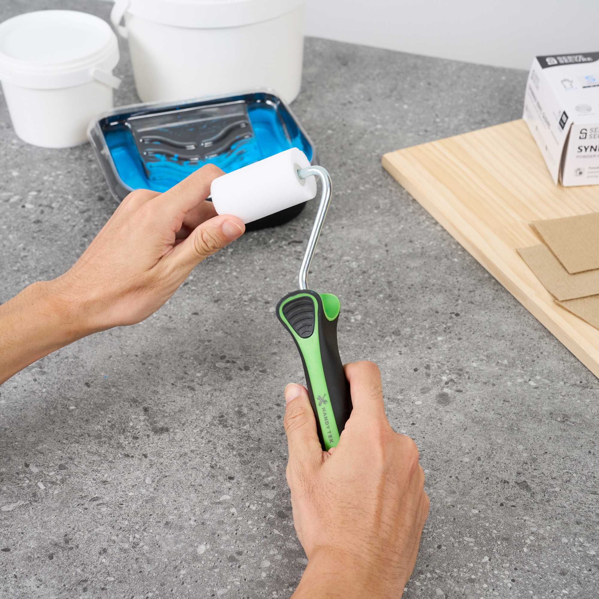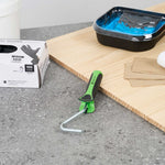 - Angled roller arm reaches tight spots for smooth and even application