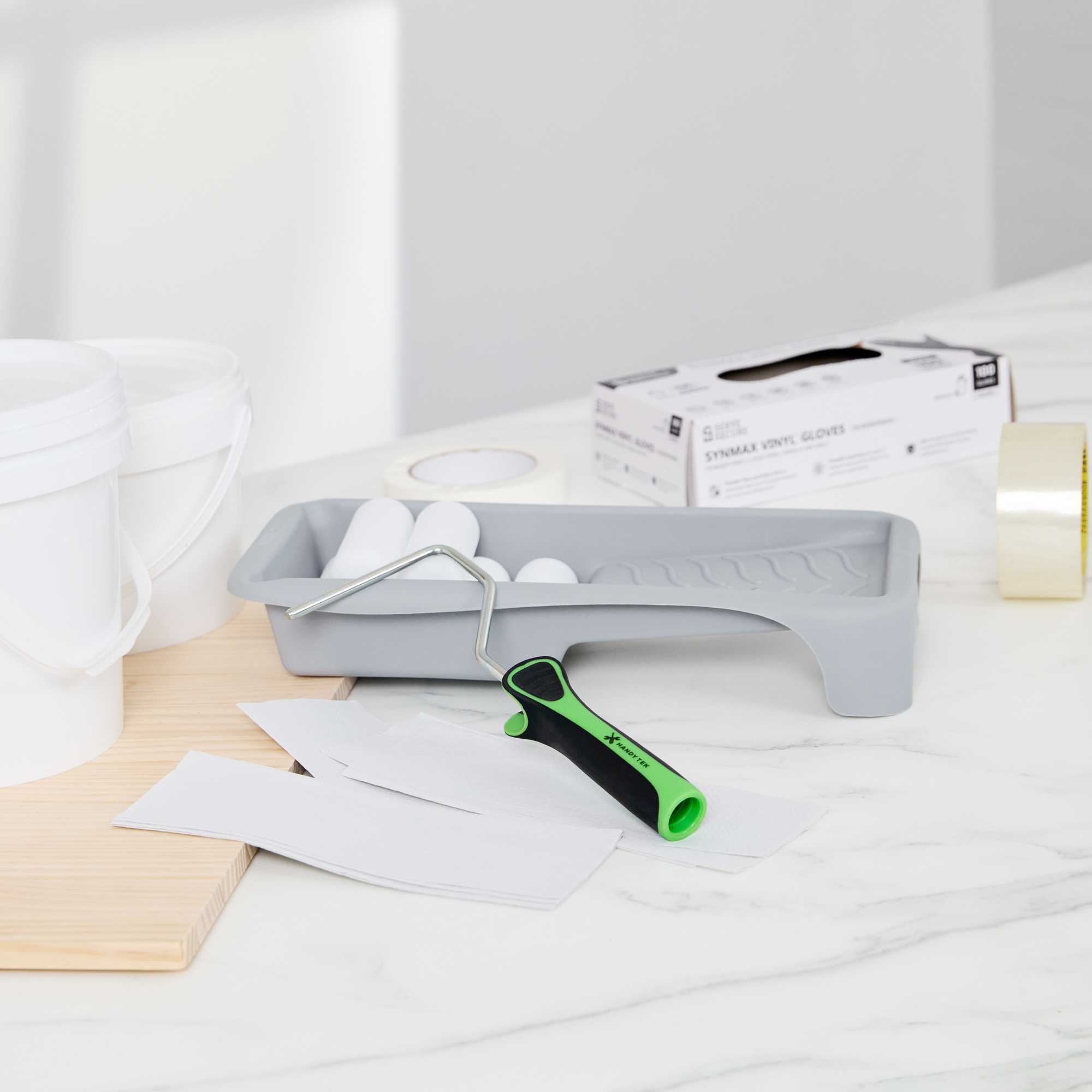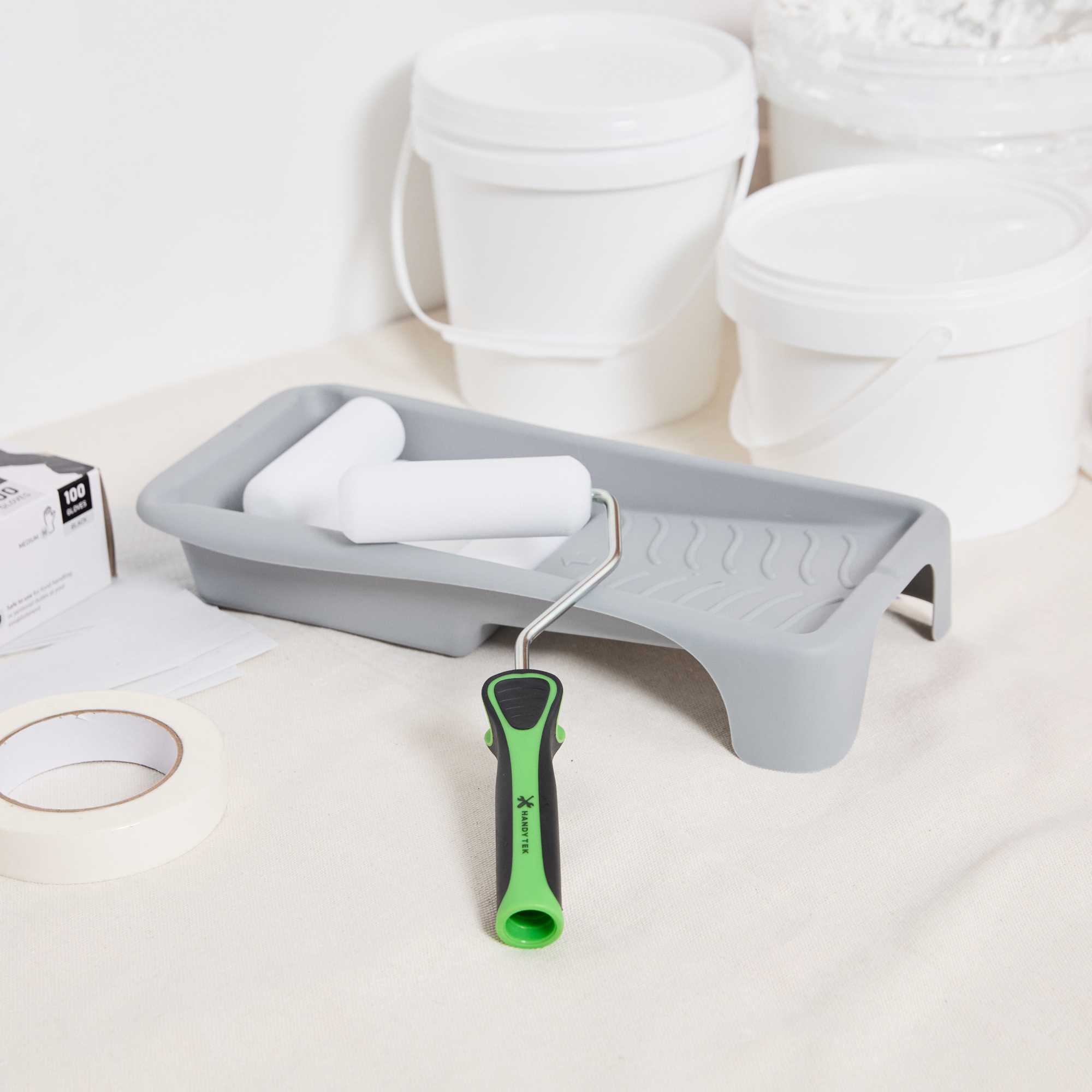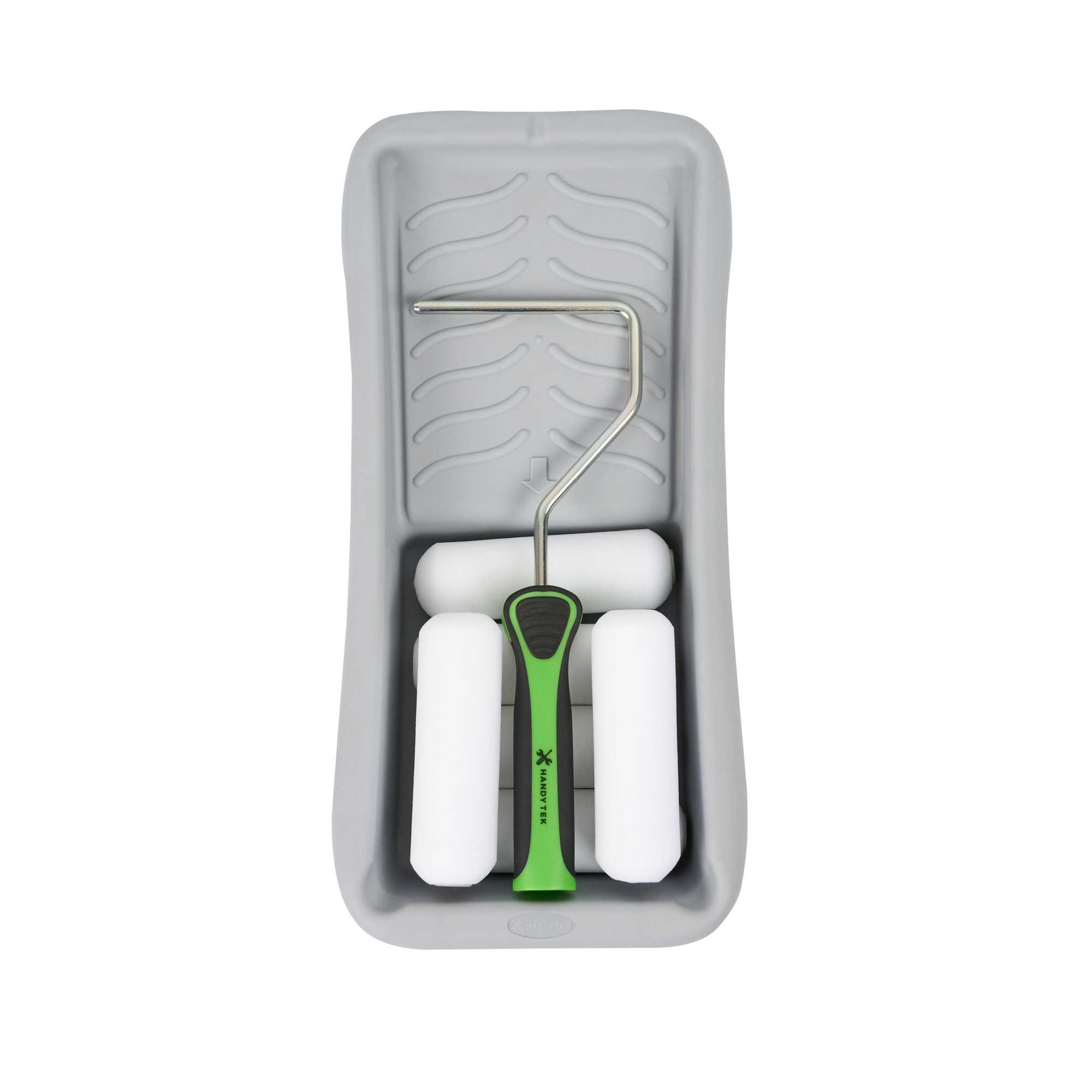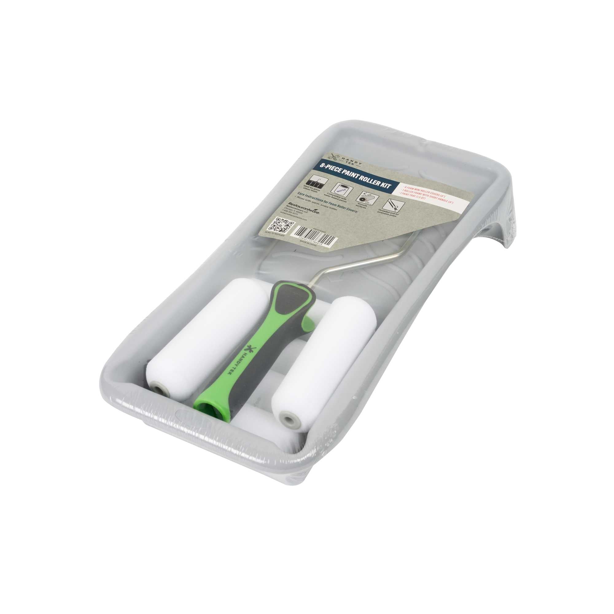 Transform your painting projects into a seamless experience with our Handy Tek Paint Roller Kit. This all-in-one painting kit includes 6 high-density foam roller covers, 1 durable roller frame, and 1 compact paint tray, everything you need for smooth, and precise application. The high-density foam roller covers ensure even paint distribution with minimal lint, making them ideal for cabinets, trim, and furniture in foodservice spaces. The included roller frame offers excellent stability and control, helping you achieve cleaner edges and better coverage. To reduce waste and maintain a clean work area, the ribbed surface of the paint tray helps evenly load paint and minimize drips. Apt for commercial kitchens, cafés, or any professional setting, this painting accessory keeps your space looking polished and professional. This kit includes six 3.94-inch foam roller covers, one 3.94-inch paint roller frame, and one 3.94-inch paint tray. Sold in a 1 count box.