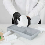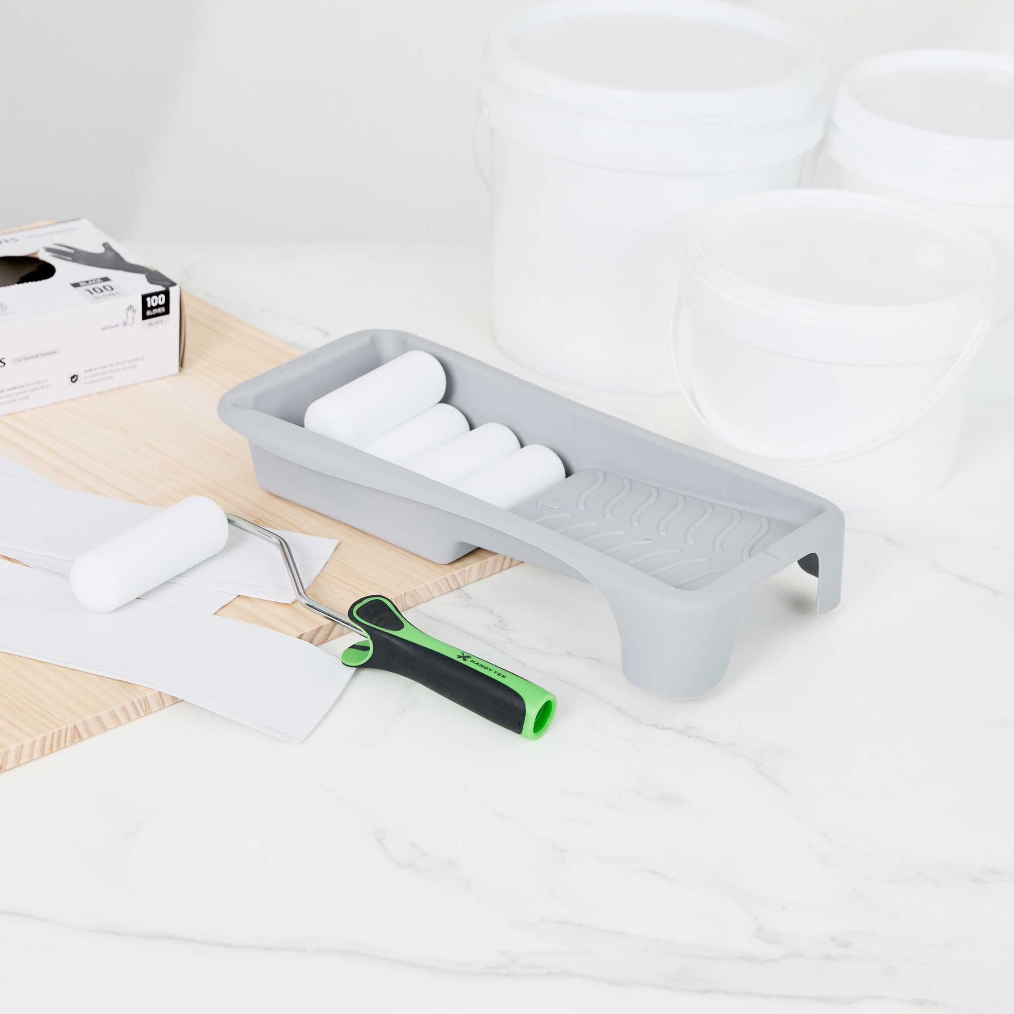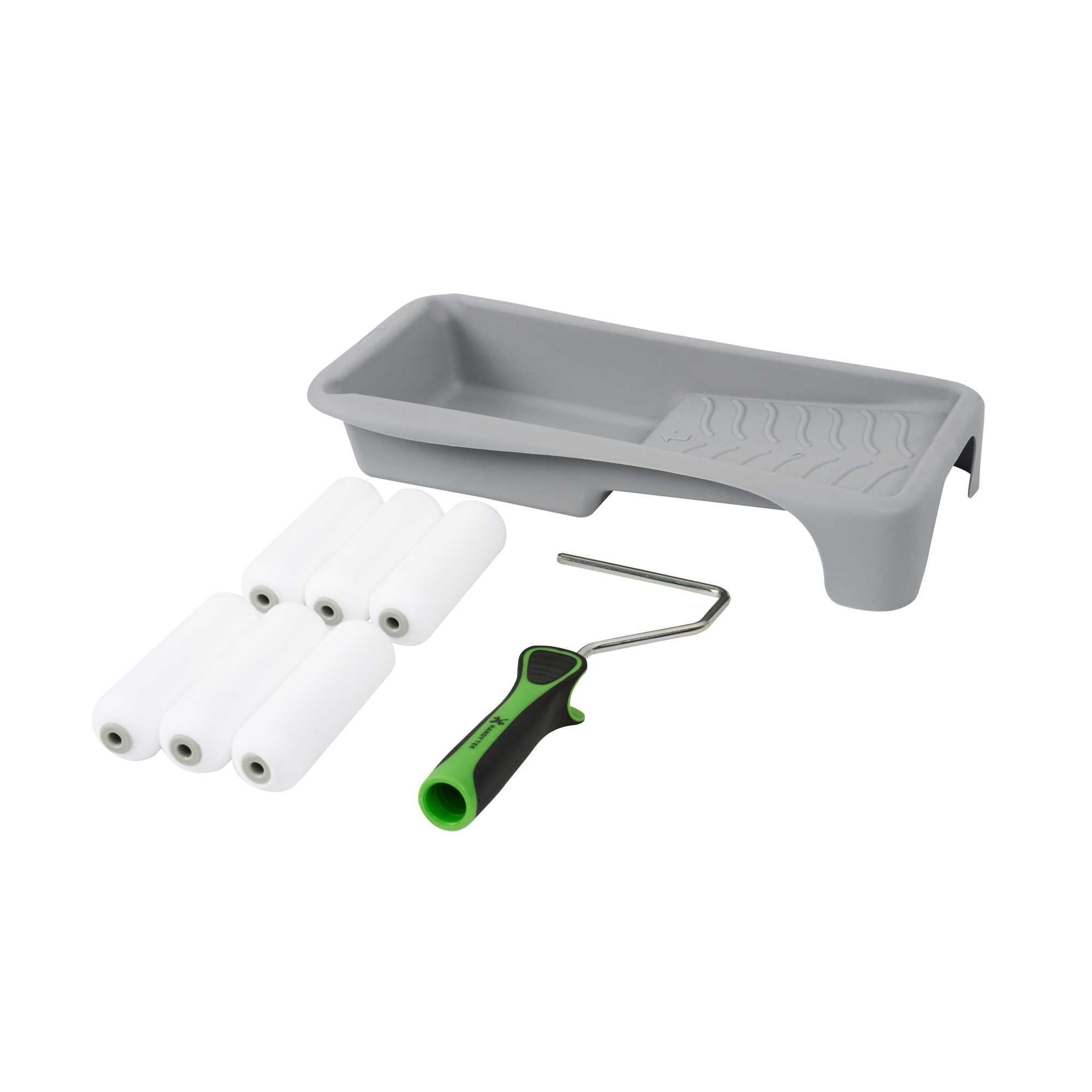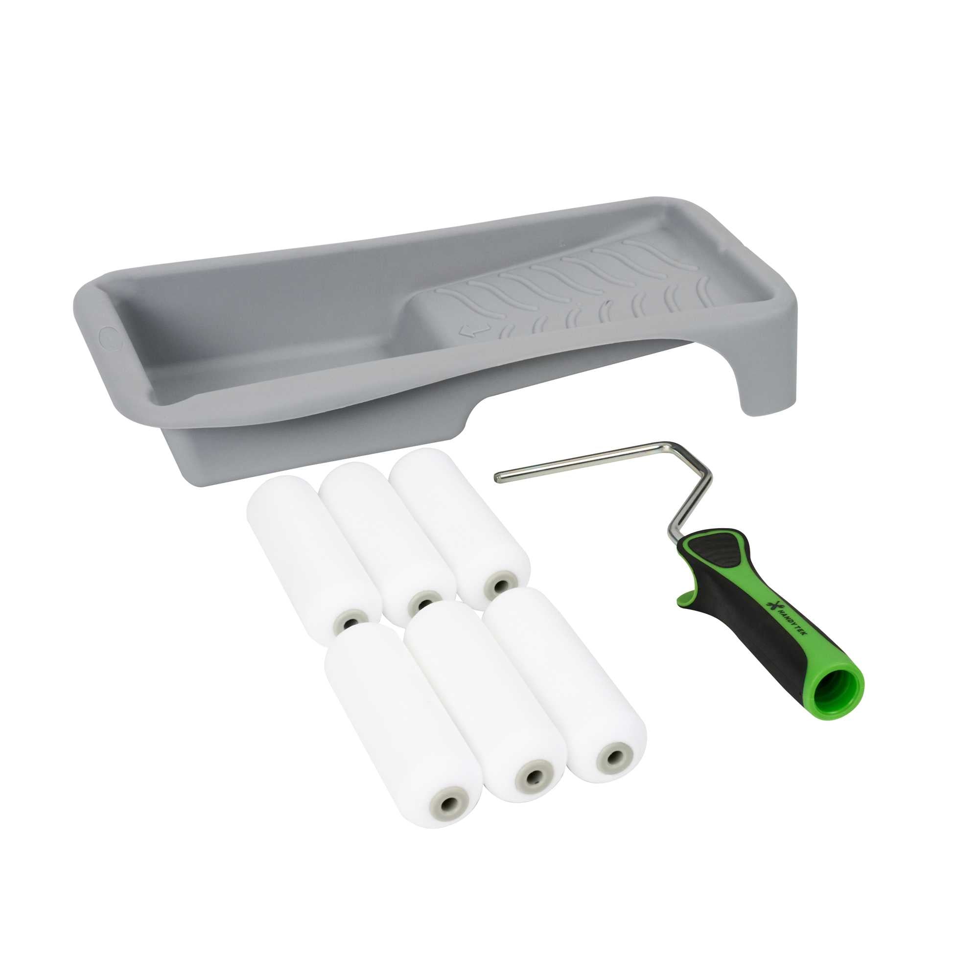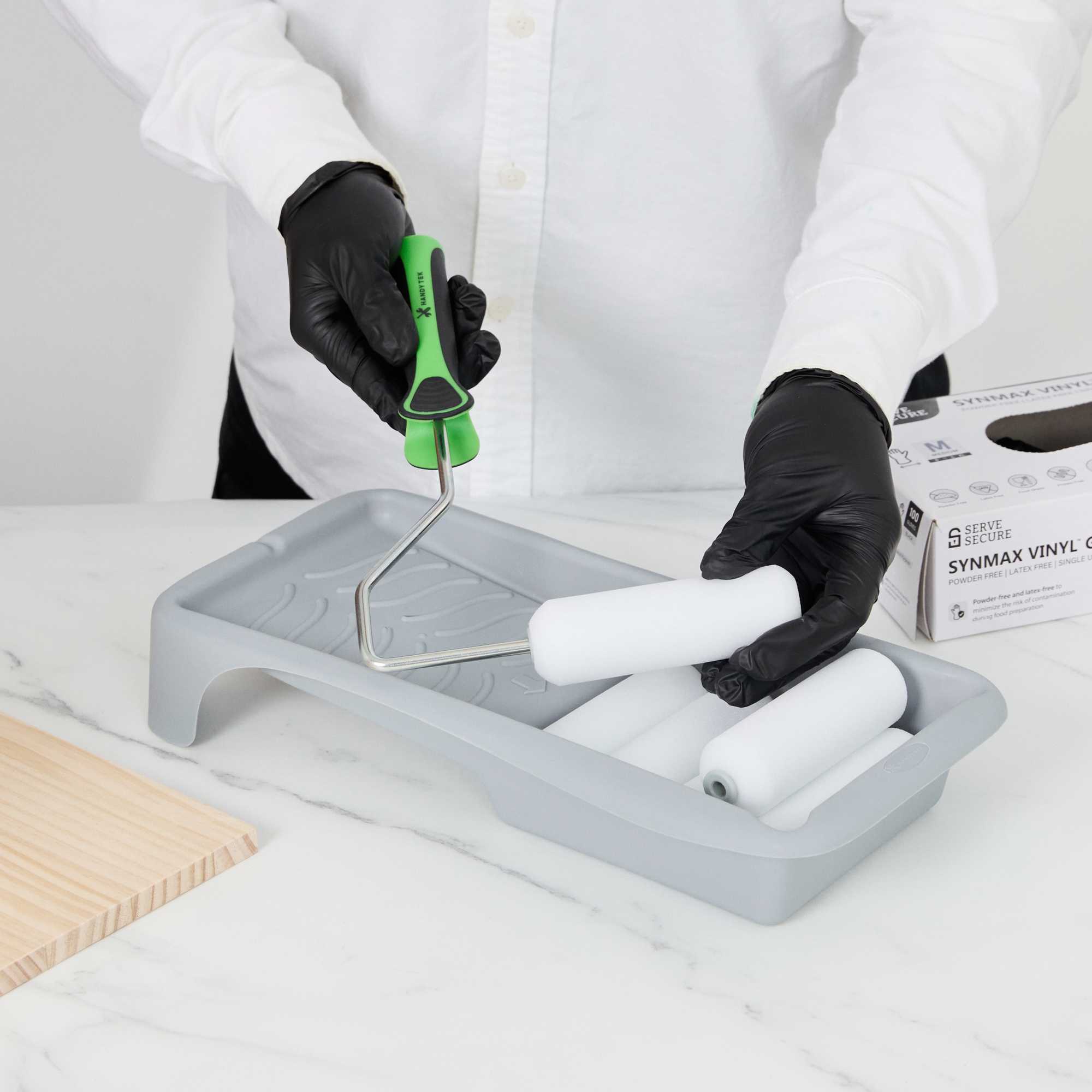 Transform your painting projects into a seamless experience with our Handy Tek Paint Roller Kit. This all-in-one painting kit includes 6 high-density foam roller covers, 1 durable roller frame, and 1 compact paint tray, everything you need for smooth, and precise application. The high-density foam roller covers ensure even paint distribution with minimal lint, making them ideal for cabinets, trim, and furniture in foodservice spaces. The included roller frame offers excellent stability and control, helping you achieve cleaner edges and better coverage. To reduce waste and maintain a clean work area, the ribbed surface of the paint tray helps evenly load paint and minimize drips. Apt for commercial kitchens, cafés, or any professional setting, this painting accessory keeps your space looking polished and professional. This kit includes six 3.94-inch foam roller covers, one 3.94-inch paint roller frame, and one 3.94-inch paint tray. Sold in a 12 count box.