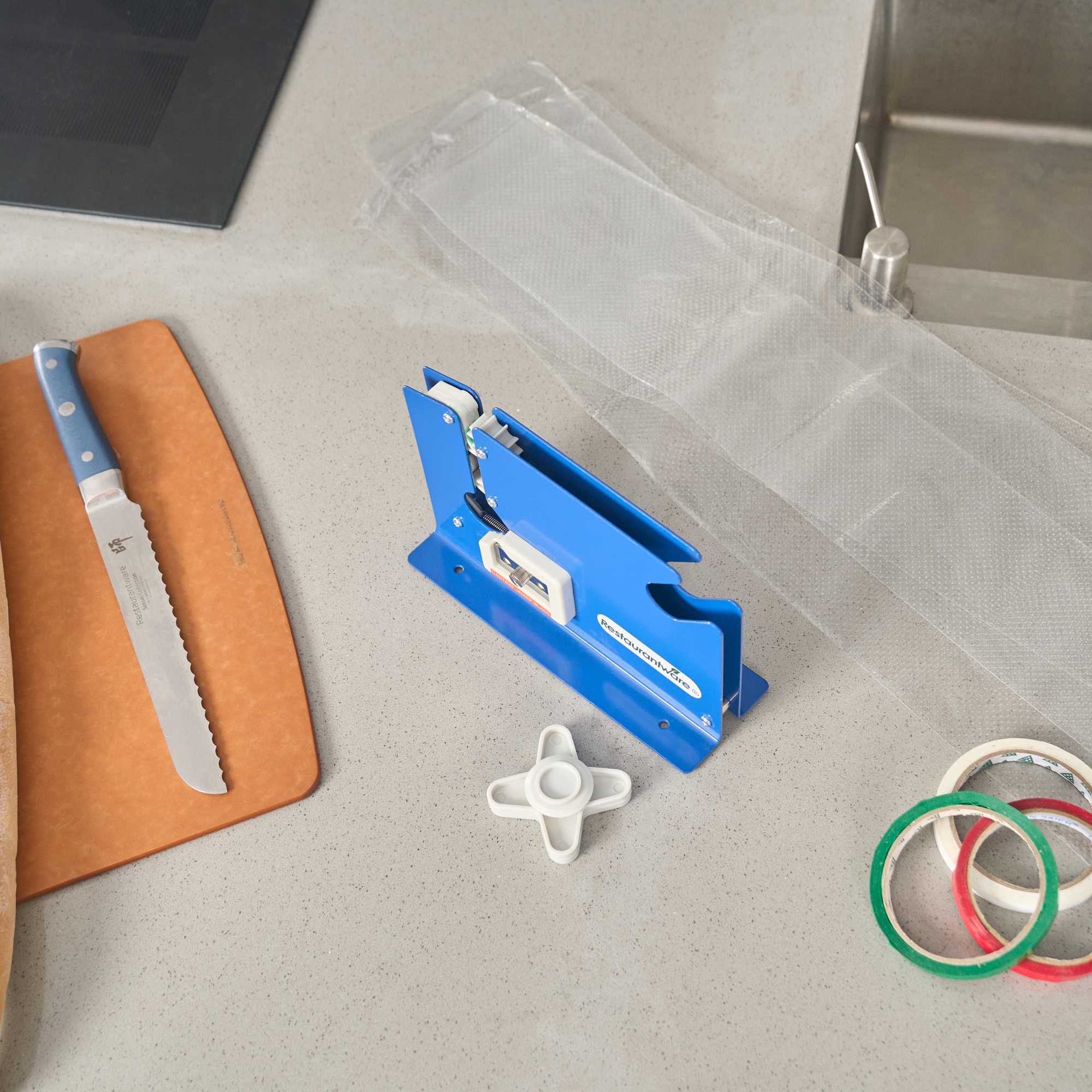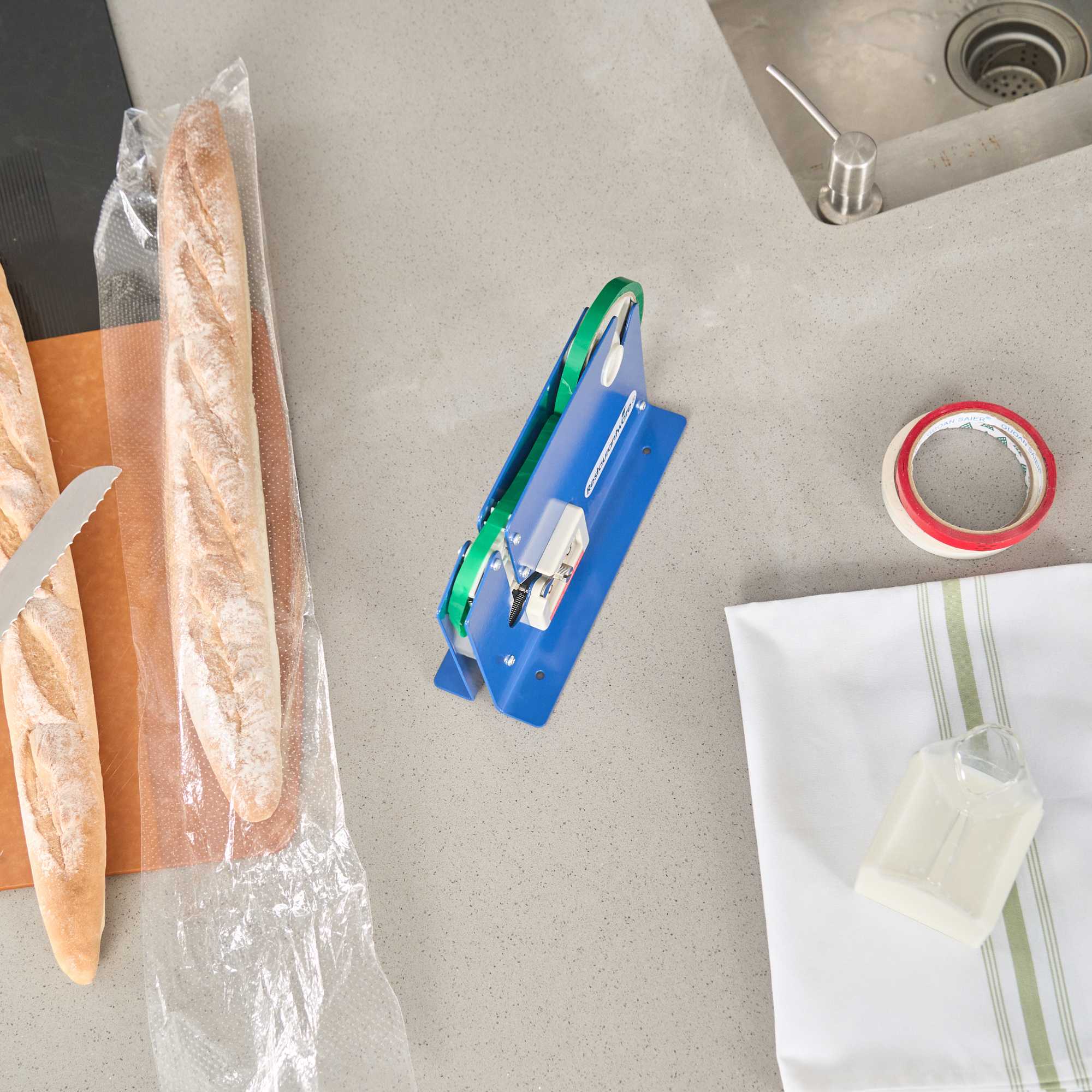 Streamline your packaging process with effortless bag sealing. The Handy Tek One-Step Operation Bag Sealing Machine offers a user-friendly design, with a built-in bag cutter that efficiently streamlines the packaging of food bags, storage bags, and more. Constructed from durable steel, this blue bag sealing machine features a non-skid base to ensure stability during high-volume use, making it an ideal choice for busy kitchens. Its ability to work with tapes up to 9 millimeters on a 3-inch core simplifies your operations. Designed for versatility, this commercial bag sealer can be used on tabletops or mounted for convenience, and its self-contained blade ensures uniform cutting with every use, enhancing the food packaging tape machine's reliability. Incorporate this sturdy, 8.6 inches long by 2.9 inches wide by 5.9 inches high machine into your workflow to boost productivity. Each order includes 10 Handy Tek One-Step Operation Bag Sealing Machines.