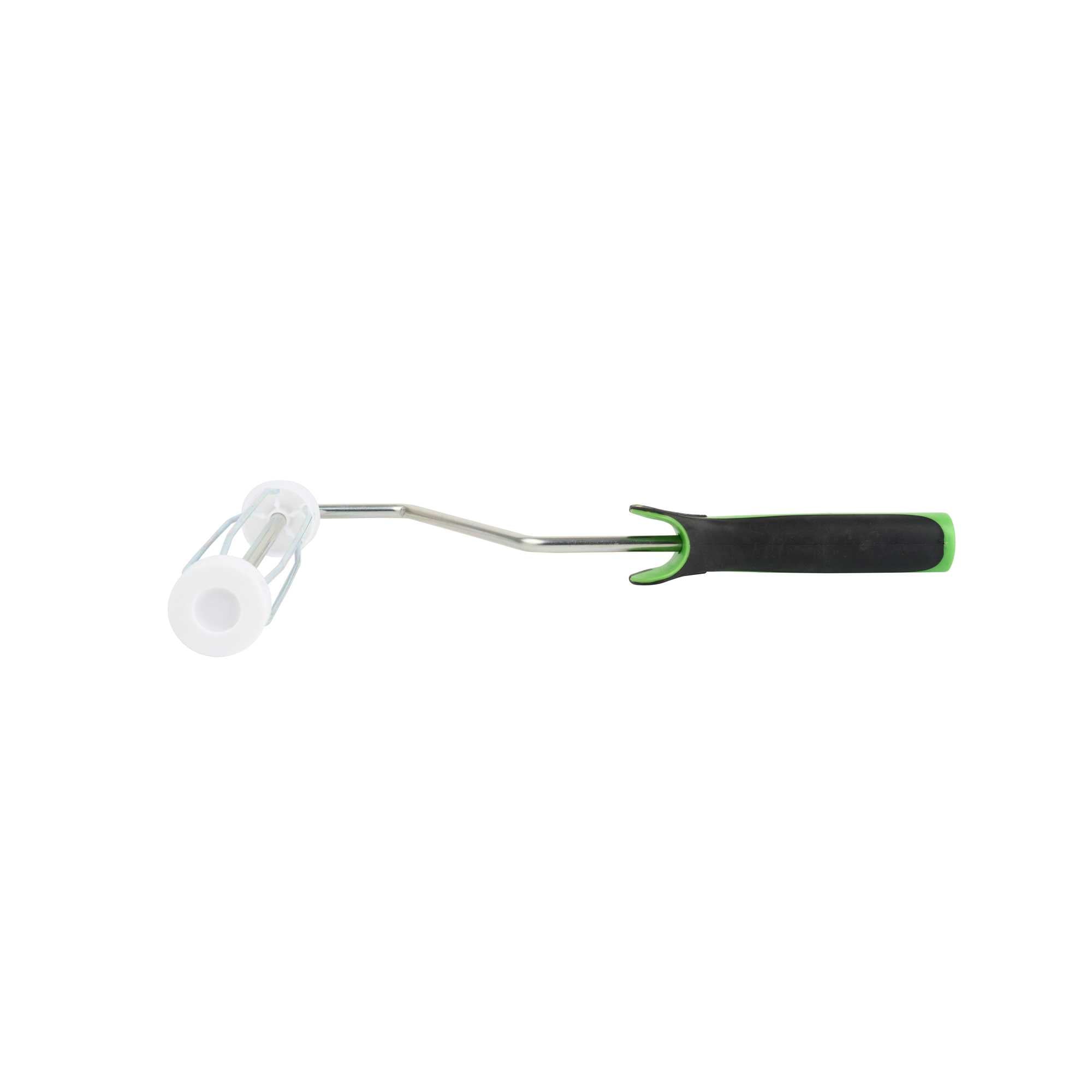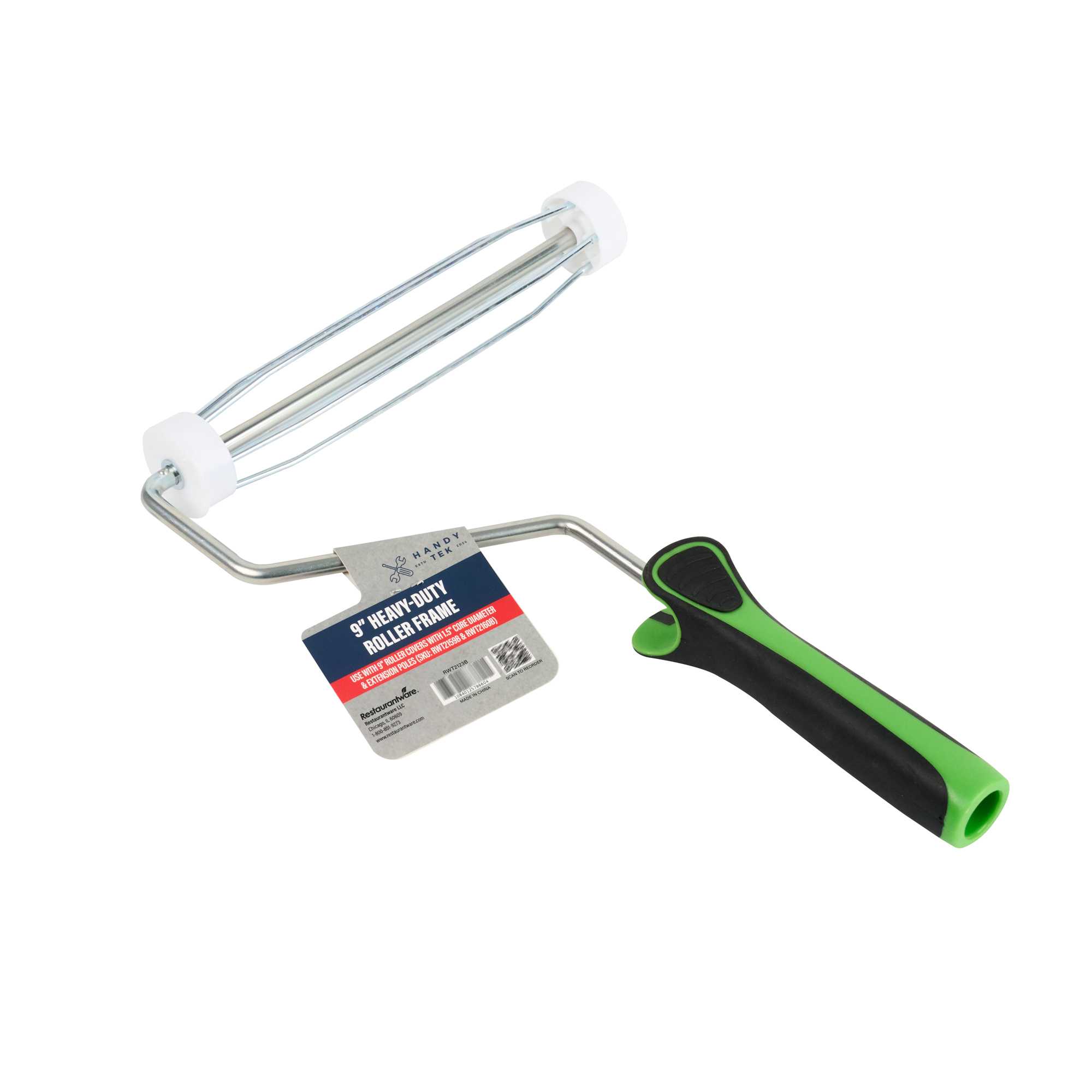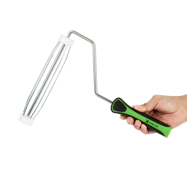 Upgrade your painting with our Handy Tek Roller Frame, designed for both expert and DIY projects. Built for durability, this heavy-duty paint handle frame ensures long-lasting performance. The 5-wire roller cage of this roller holder securely holds roller covers in place, preventing slipping and ensuring a smooth, even application. For effortless painting across walls, ceilings, and hard-to-reach areas, this frame is compatible with 9-inch roller covers featuring a 1.5-inch core diameter for smooth paint application. The roller frame includes a threaded end to securely attach to our compatible extension poles for extended reach. Featuring a soft grip handle, this painting roller frame provides a comfortable, secure grip, reducing hand fatigue during extended use. Measuring 12.99 inches in length by 9.84 inches in width by 1.38 inches in height, this roller frame is ideal for a variety of painting tasks. Sold in a 1 count box. Roller covers and extension poles are sold seperately.