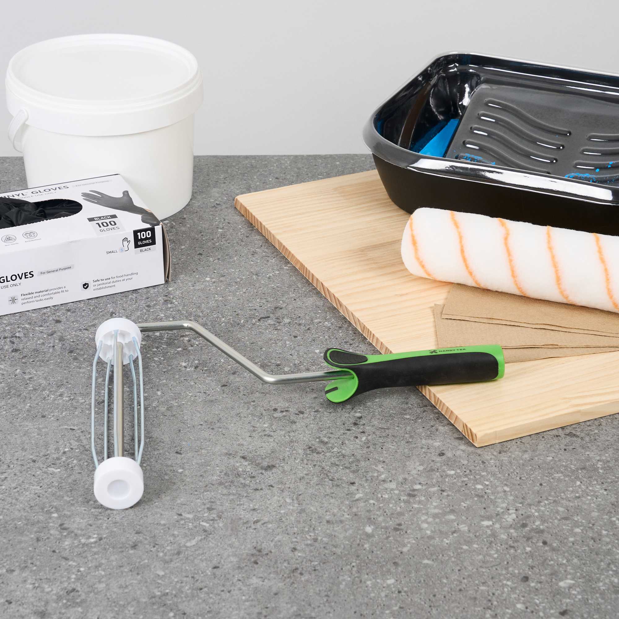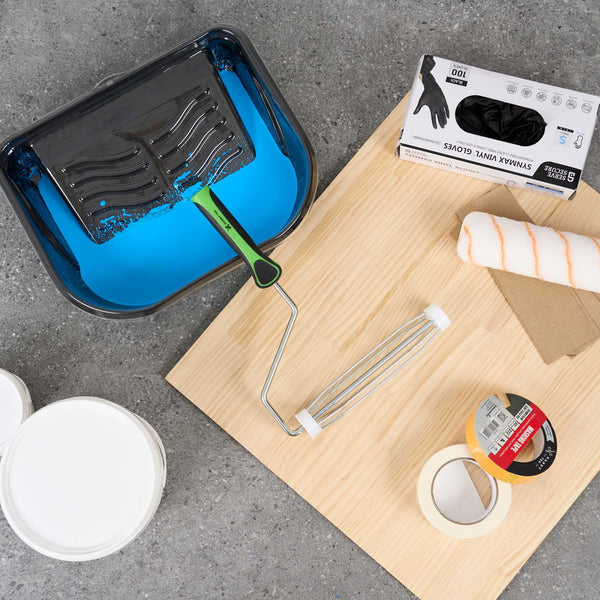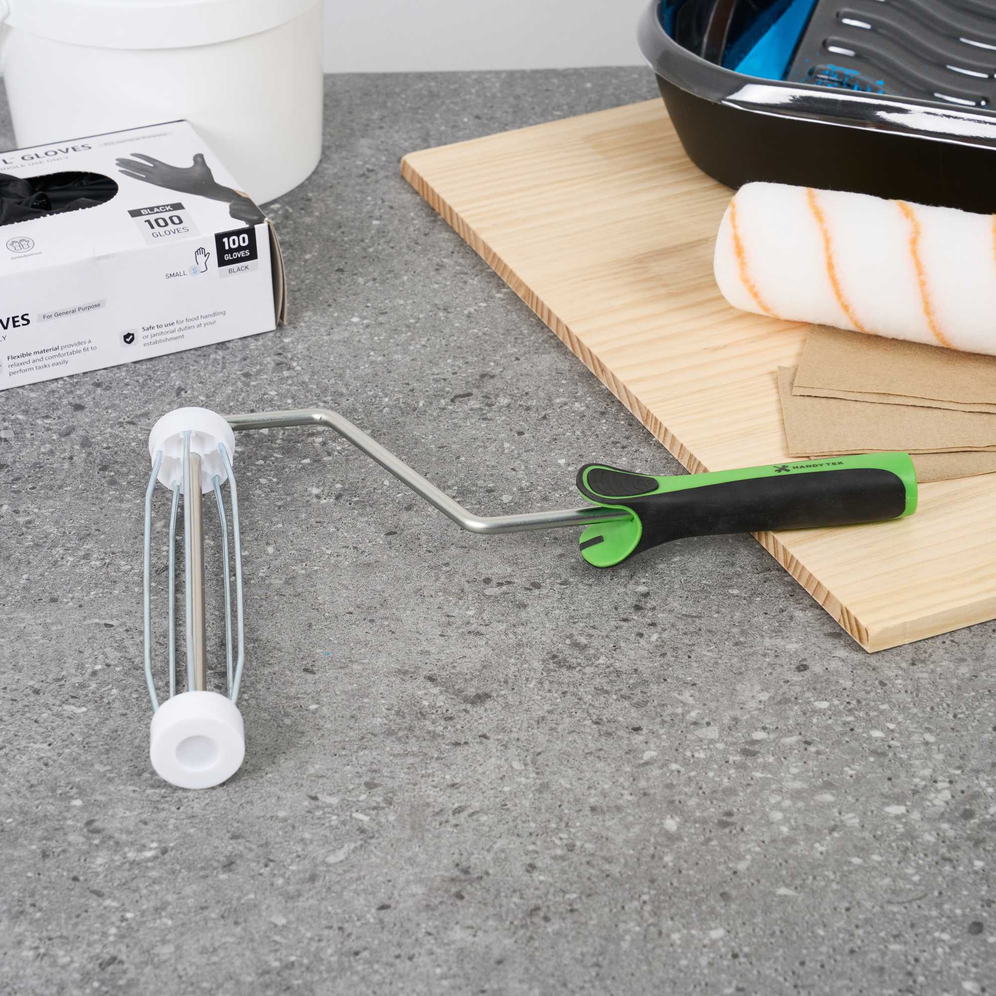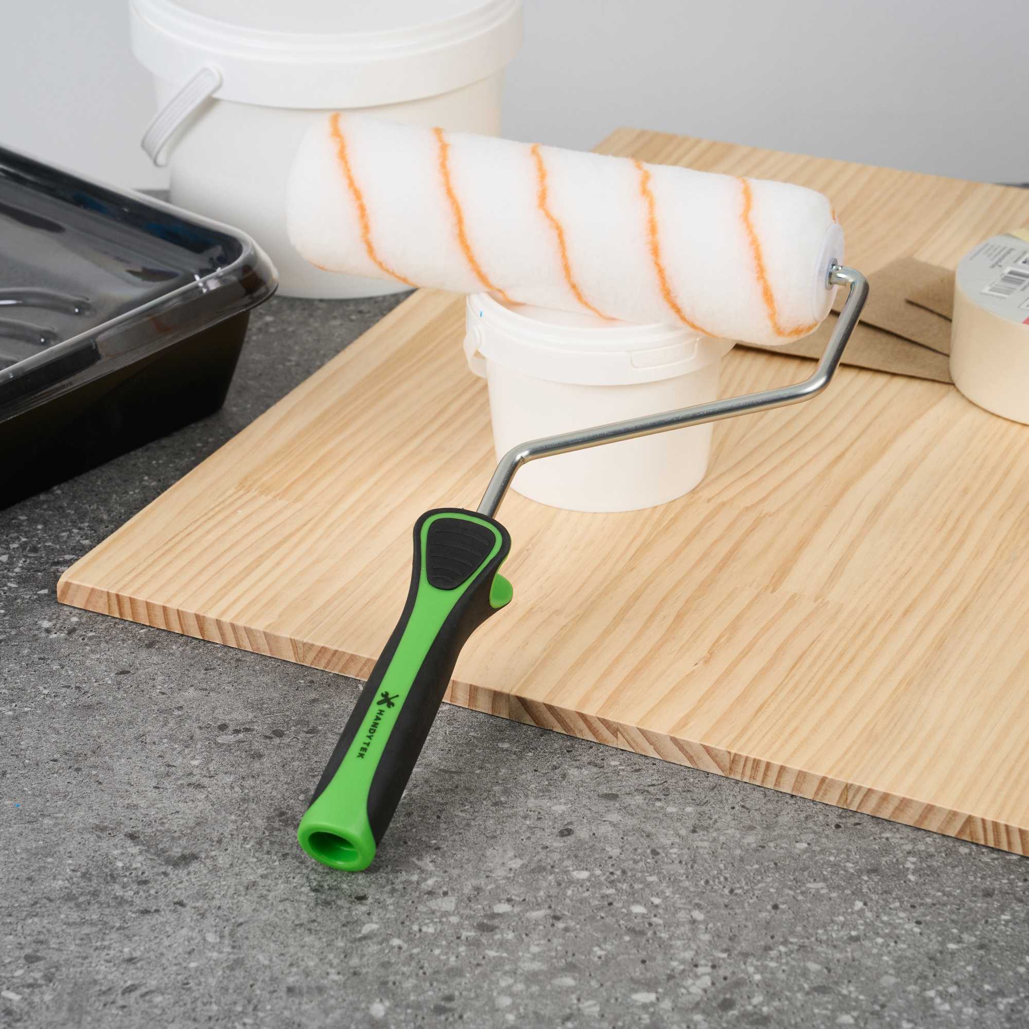 Upgrade your painting with our Handy Tek Roller Frame, designed for both expert and DIY projects. Built for durability, this heavy-duty paint handle frame ensures long-lasting performance. The 5-wire roller cage of this roller holder securely holds roller covers in place, preventing slipping and ensuring a smooth, even application. For effortless painting across walls, ceilings, and hard-to-reach areas, this frame is compatible with 9-inch roller covers featuring a 1.5-inch core diameter for smooth paint application. The roller frame includes a threaded end to securely attach to our compatible extension poles for extended reach. Featuring a soft grip handle, this painting roller frame provides a comfortable, secure grip, reducing hand fatigue during extended use. Measuring 12.99 inches in length by 9.84 inches in width by 1.38 inches in height, this roller frame is ideal for a variety of painting tasks. Sold in a 1 count box. Roller covers and extension poles are sold seperately.