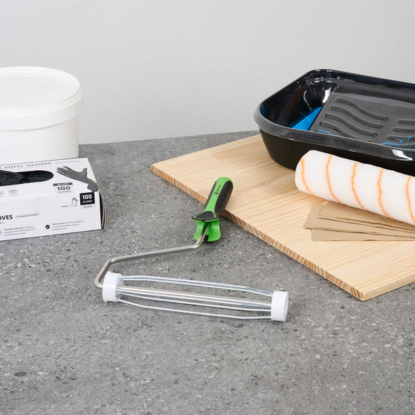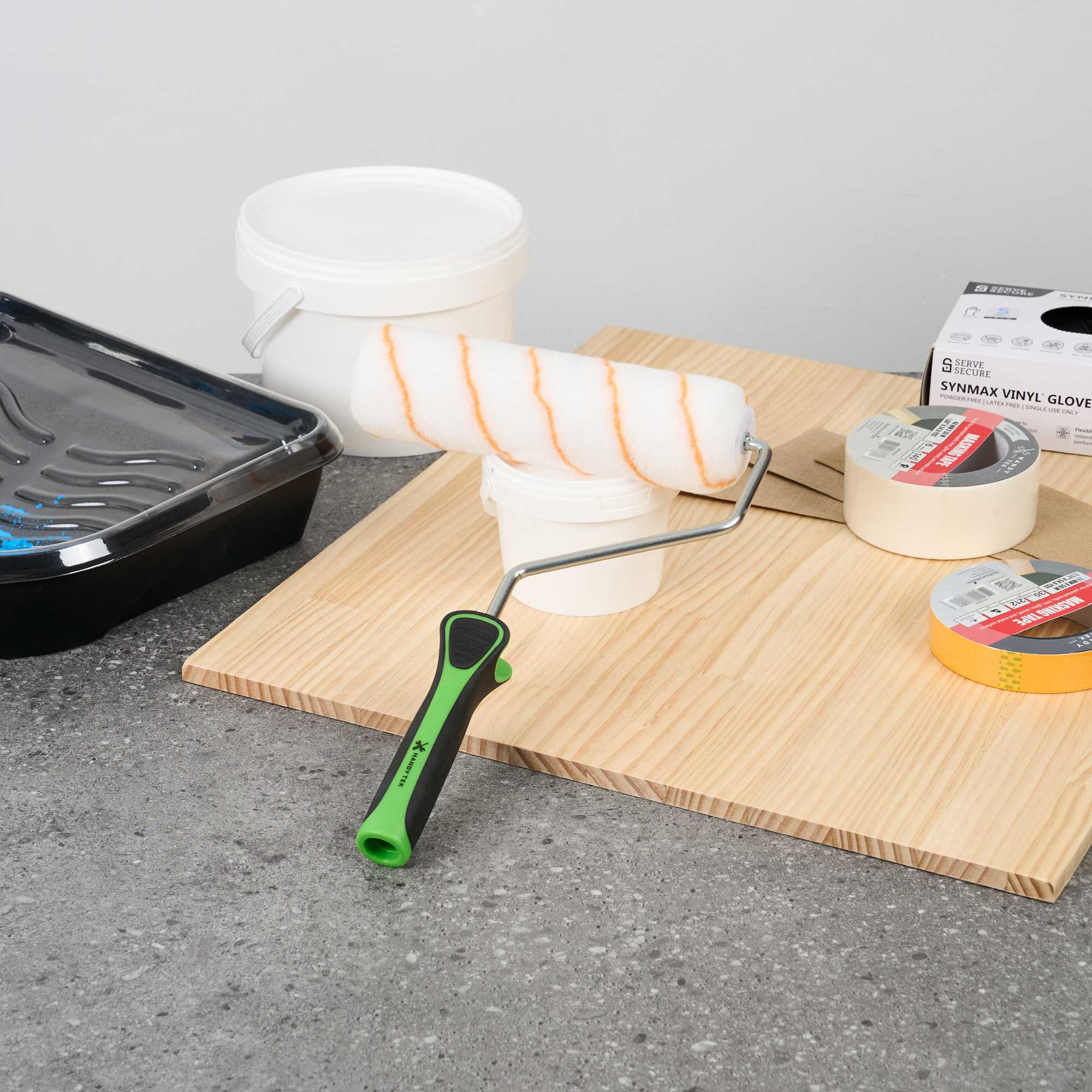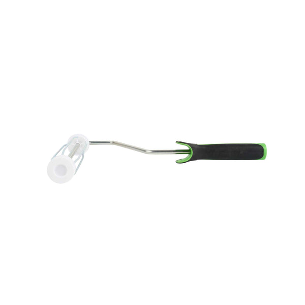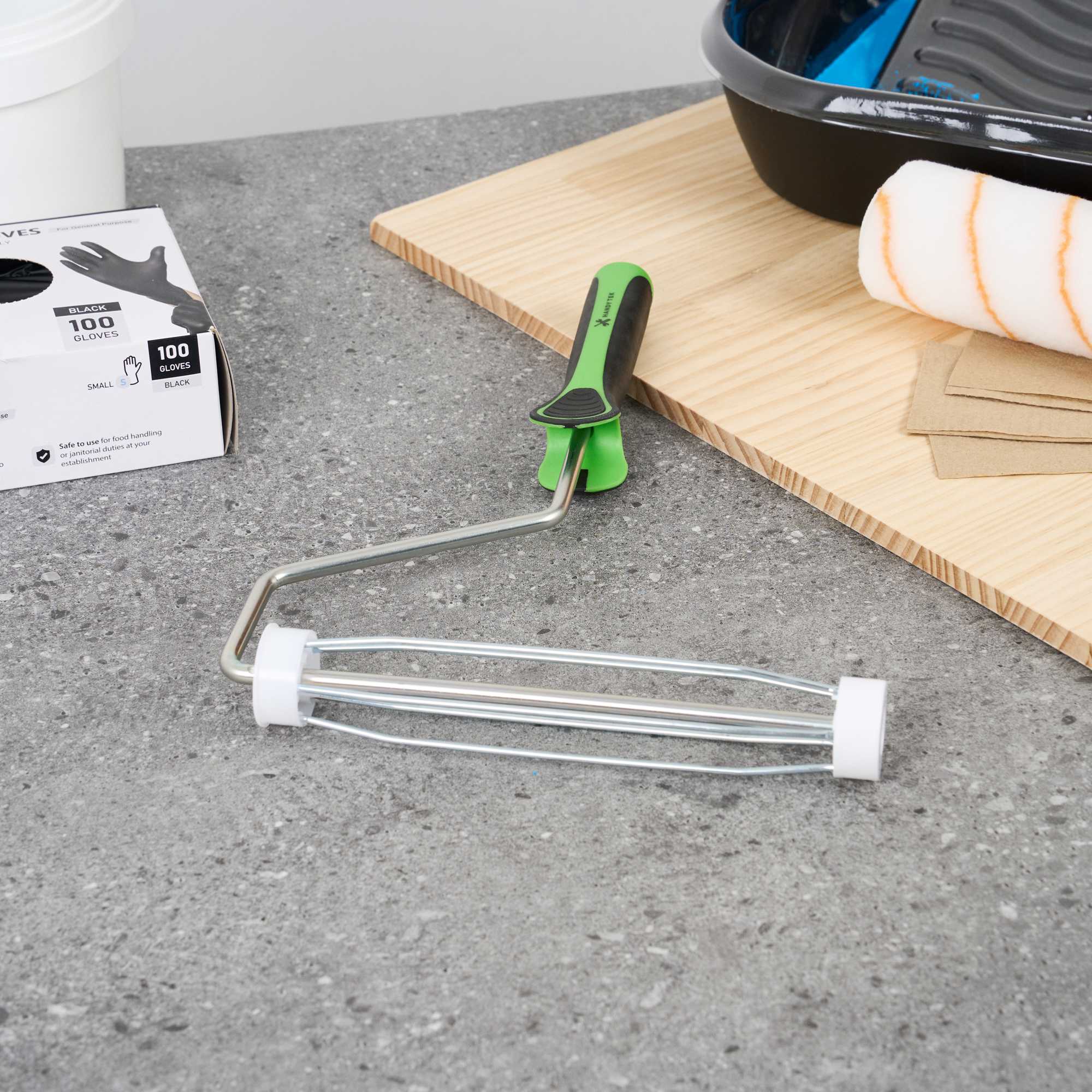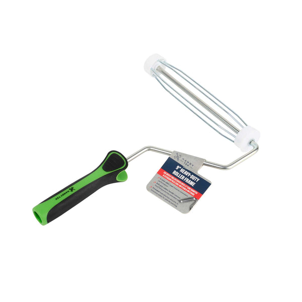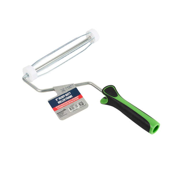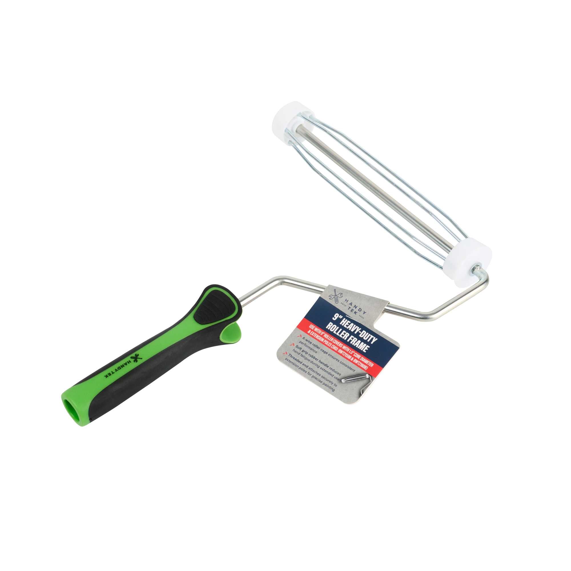 Upgrade your painting with our Handy Tek Roller Frame, designed for both expert and DIY projects. Built for durability, this heavy-duty paint handle frame ensures long-lasting performance. The 5-wire roller cage of this roller holder securely holds roller covers in place, preventing slipping and ensuring a smooth, even application. For effortless painting across walls, ceilings, and hard-to-reach areas, this frame is compatible with 9-inch roller covers featuring a 1.5-inch core diameter for smooth paint application. The roller frame includes a threaded end to securely attach to our compatible extension poles for extended reach. Featuring a soft grip handle, this painting roller frame provides a comfortable, secure grip, reducing hand fatigue during extended use. Measuring 12.99 inches in length by 9.84 inches in width by 1.38 inches in height, this roller frame is ideal for a variety of painting tasks. Sold in a 12 count box. Roller covers and extension poles are sold seperately.
