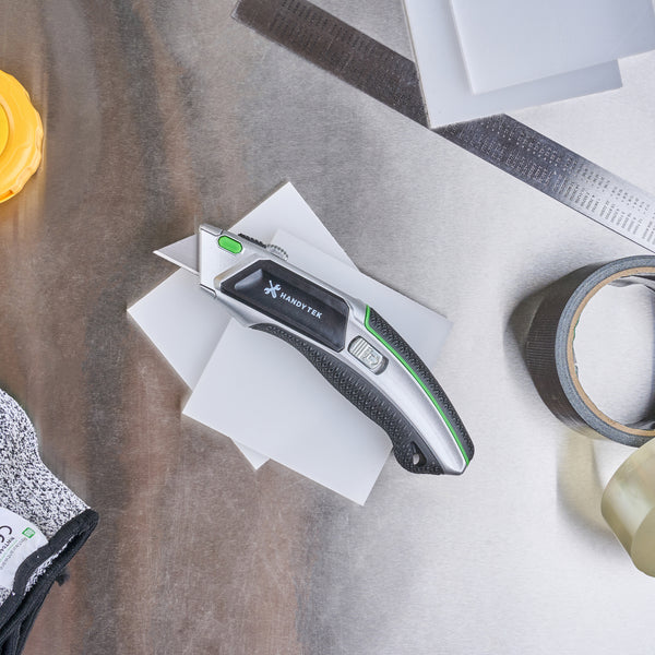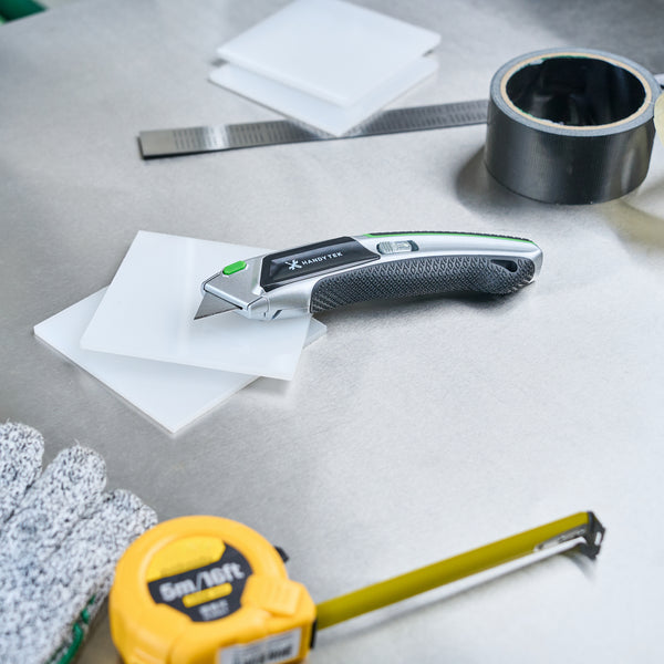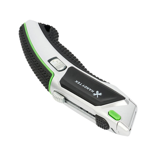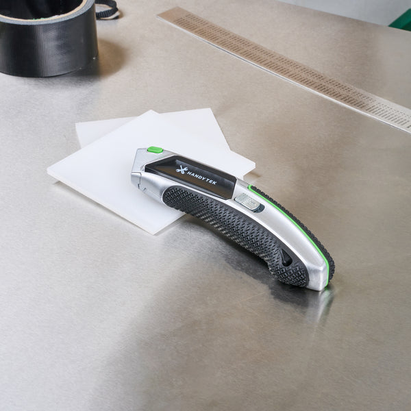 Upgrade your toolbox with our Handy Tek Silver Auto-Loading Utility Knife. This utility knife features a quick change mechanism, allowing for easy and rapid blade replacement and making it perfect for demanding tasks. Equipped with an innovative auto-loading mechanism, this sharp knife automatically loads a new blade when the existing one becomes dull. The blade compartment of this retractable knife offers a convenient and secure solution for storing extra blades, ensuring you’re always prepared. Boasting a heavy-duty design, this cutting knife ensures durability and reliability, making it ideal for demanding tasks. This heavy-duty knife provides a firm, secure grip while cutting, enhancing user comfort and control. Made from high-carbon steel, this box cutter offers superior sharpness and edge retention, ideal for various cutting tasks. This auto-loading utility knife features a 4-position locking system, allowing for adjustable blade extension and improved control during use. For enhanced safety, the slider of this sharp utility knife enables the blade to be safely stored within the handle when not in use, reducing the risk of accidental cuts and injuries. With zinc housing, this silver utility knife is built to last and resist breakage, ensuring optimal performance. Featuring an ABS and TPR over-molding grip, this sharp cutting knife provides a non-slip hold when in use, enhancing safety and comfort during extended cutting tasks. Measuring 6.96 inches in length, this retractable utility knife is equipped with a 19-millimeter wide blade. Sold in 6 boxes with 1 knife and 5 blades.