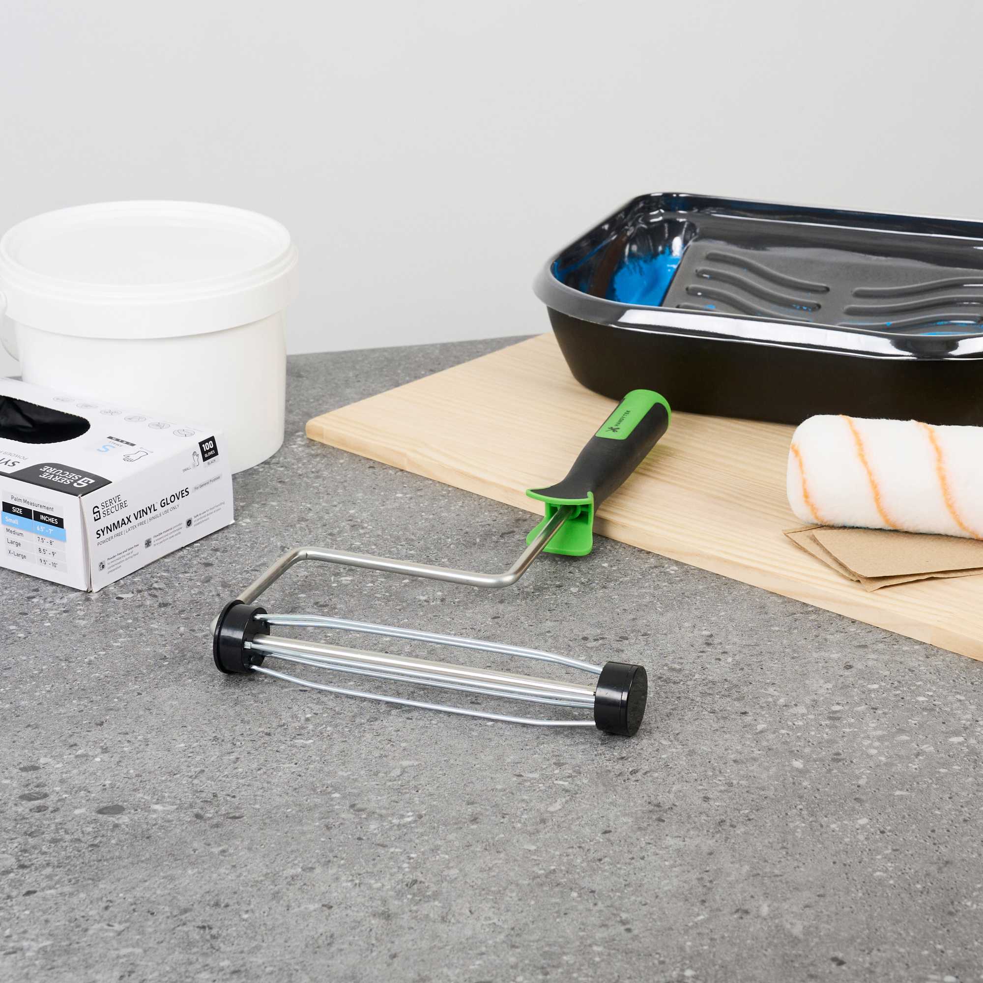 Elevate your painting projects with our Handy Tek Smooth Roller Frame, designed to provide a seamless and efficient painting experience. This roller frame features enclosed bearings, ensuring smooth rolling with minimal friction and noise, making it the ideal paint handle frame for any task. Pair this painting roller frame with Handy Tek roller covers and an extension pole for smooth coverage across walls, ceilings, and hard-to-reach areas in restaurants or cafés. Crafted with a heavy-duty 5-wire chrome-plated cage, this roller holder securely grips roller covers, resisting rust and bending even after multiple uses. The soft rubber grip handle of this coating tool frame offers exceptional comfort, allowing for better control and reduced fatigue during extended painting sessions. Measuring 15.55 inches in length by 10.04 inches in width by 1.58 inches in height, this roller frame is built for versatile use. Sold in a 1 count box.