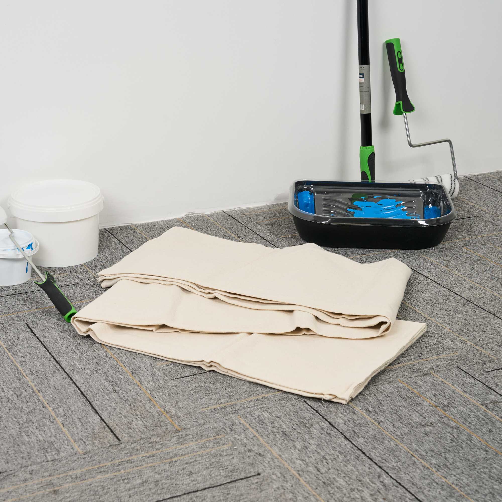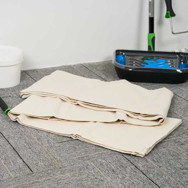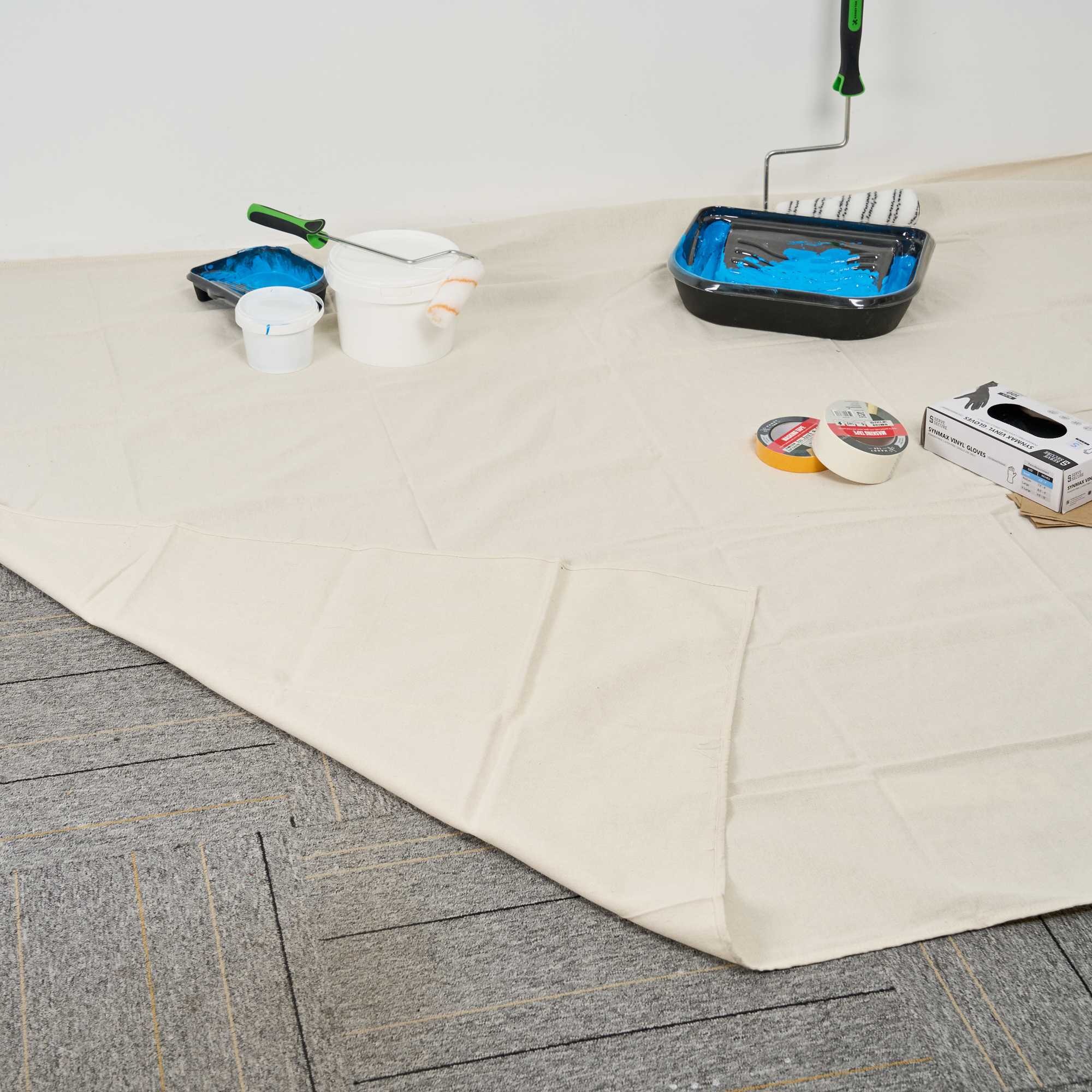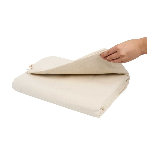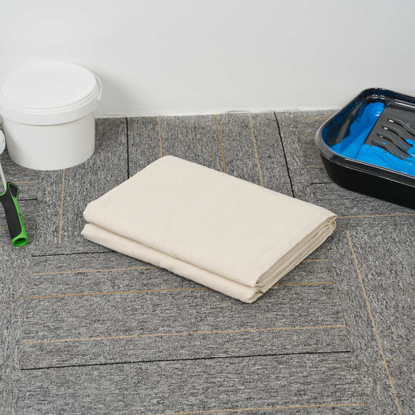 Protect surfaces with confidence using our Handy Tek White Cotton Canvas Drop Cloth, designed for a wide range of tasks in commercial and foodservice settings. This multi-purpose drop cloth serves as a great floor cover, effectively shielding surfaces like floors, carpets, and furniture from paint, spills, and dust. With its durable design, this painting sheet features hemmed and double-stitched edges, enhancing its strength and stopping fraying for long-lasting use. Crafted from heavyweight canvas, this tarp sheet stays in place and provides added protection against leaks and debris. Not only does this white tarp sheet absorb spills and dust, but it also ensures that surfaces underneath remain clean and pristine. Designed for convenience, this worksite cover is washable and reusable, making it a reliable choice for multiple projects. Measuring 72.05 inches in length by 107.87 inches in width, this drop cloth provides ample coverage for any task. Sold in a 12 count box.