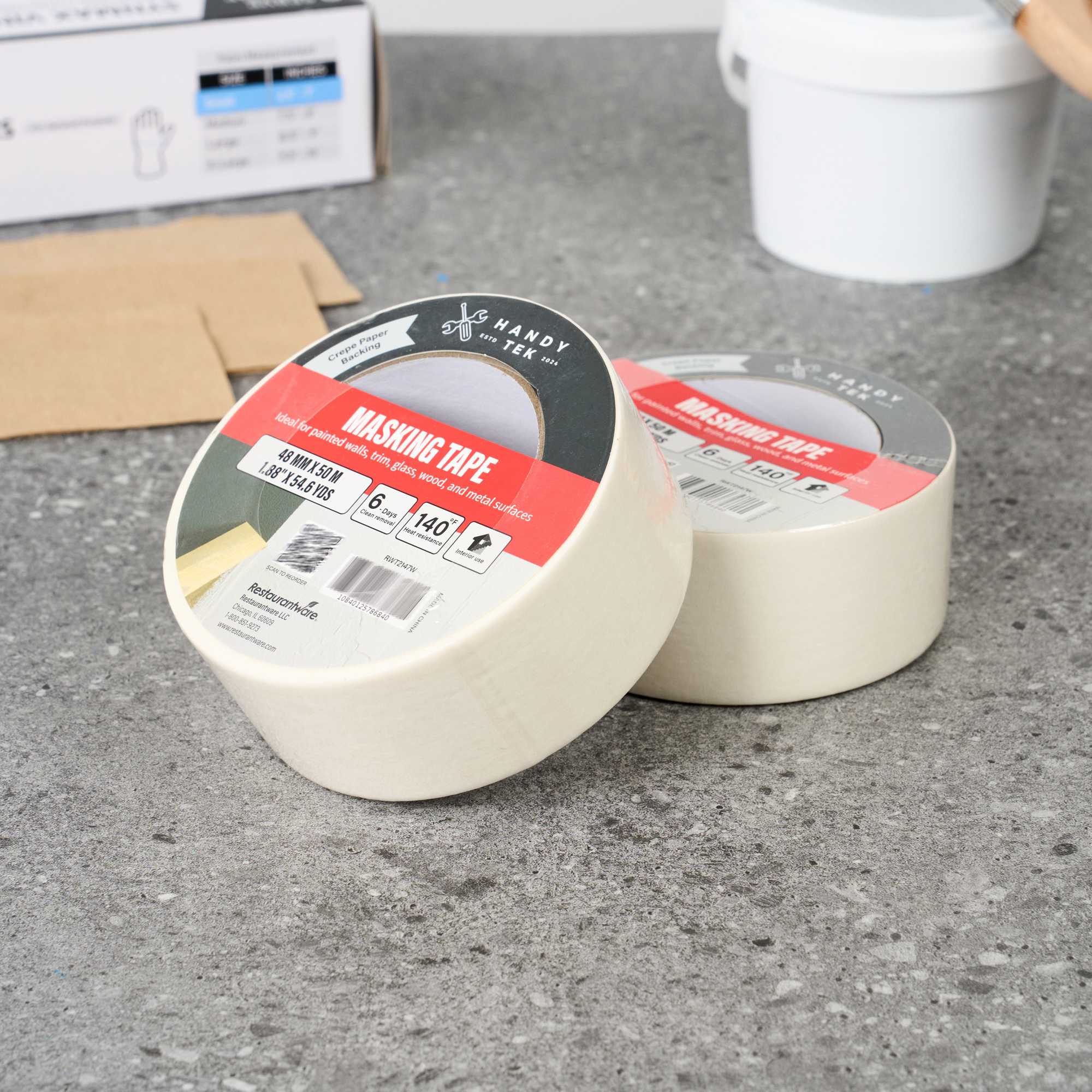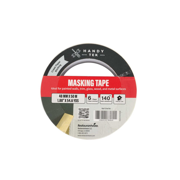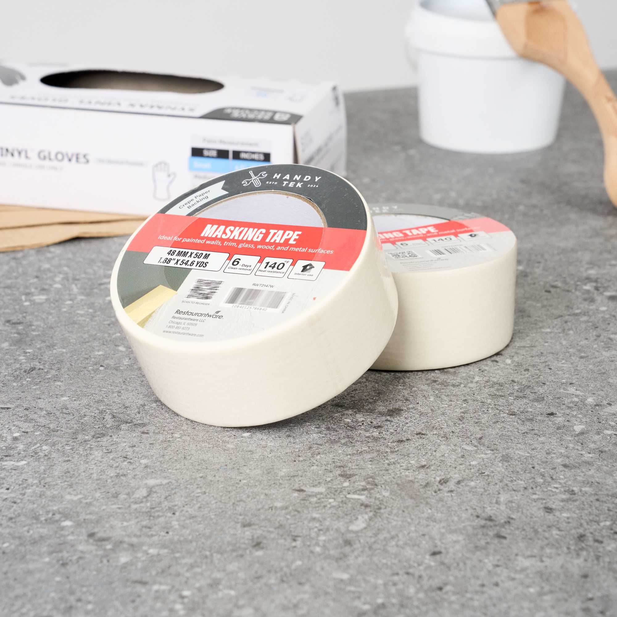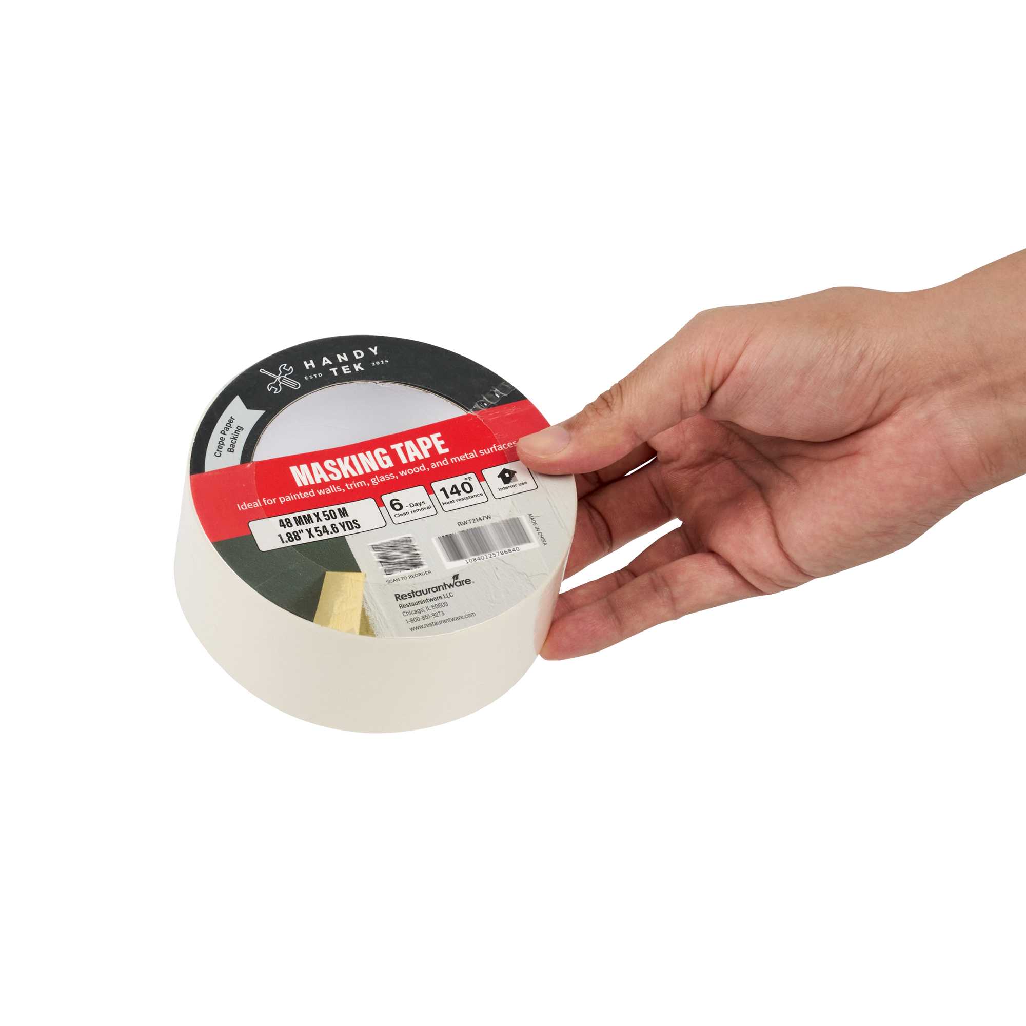 Our Handy Tek White Masking Tape Roll is the ultimate solution for light bundling, packaging, labeling, and masking tasks in foodservice settings. This masking tape is paint and moisture, and heat-resistant, ensuring dependable performance indoors. Easy to apply, this painter’s tape is hand-tearable and conformable for precise placement on various surfaces like walls, glass, wood, and metal. Featuring strong adhesion, this adhesive tape sticks securely to most surfaces, delivering clean, consistent masking results. For quick cleanup, this labeling tape offers clean removal without damage or residue for up to 6 days after application. Measuring 2 inches in width, this masking tape roll features a total length of 54 yards. Sold in a 12 count box.