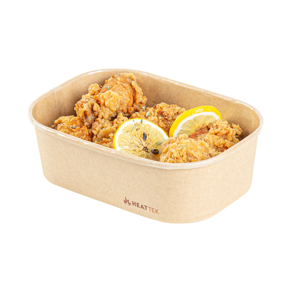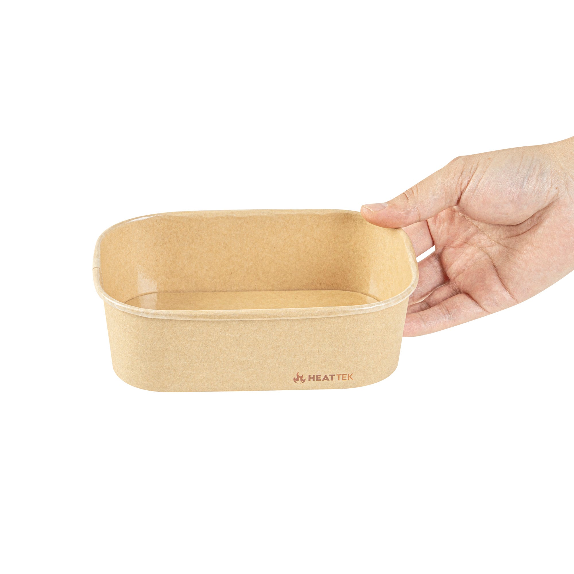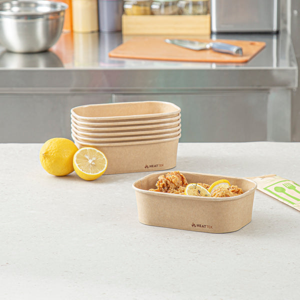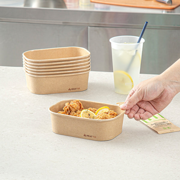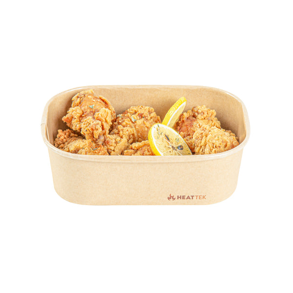 Elevate your foodservice with our Heat Tek 20-Ounce Oval Kraft Paper Serving Containers. These paper food containers feature a greaseproof lining that keeps oils and sauces from leaking through, ensuring a mess-free dining experience. Made from premium kraft paper, these serving containers are durable for oven use up to 460F, ensuring your food stays warm and delicious. Plus, they are freezable, making them versatile for any food prep situation. The convenient stackable design of these paper containers enables space-saving storage and easy organization in busy kitchens. With a capacity of 20 ounces, these kraft containers are perfect for serving generous portions of your culinary creations. Measuring 6.77 inches in length by 4.72 inches in width by 2.01 inches in height, these kraft paper containers offer ample space for a variety of dishes. Sold in a 100 count box.